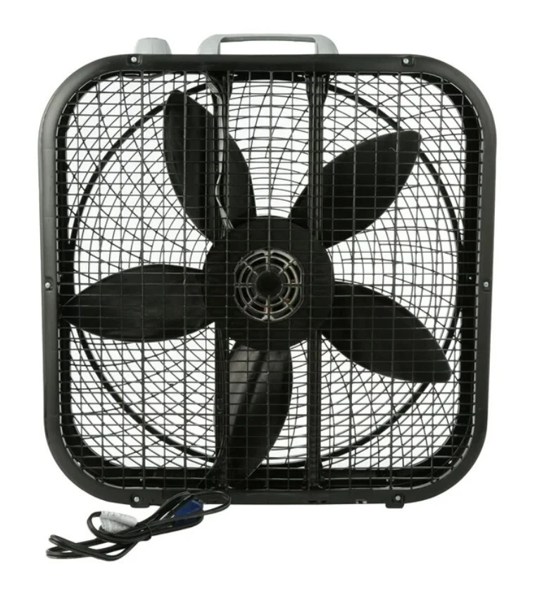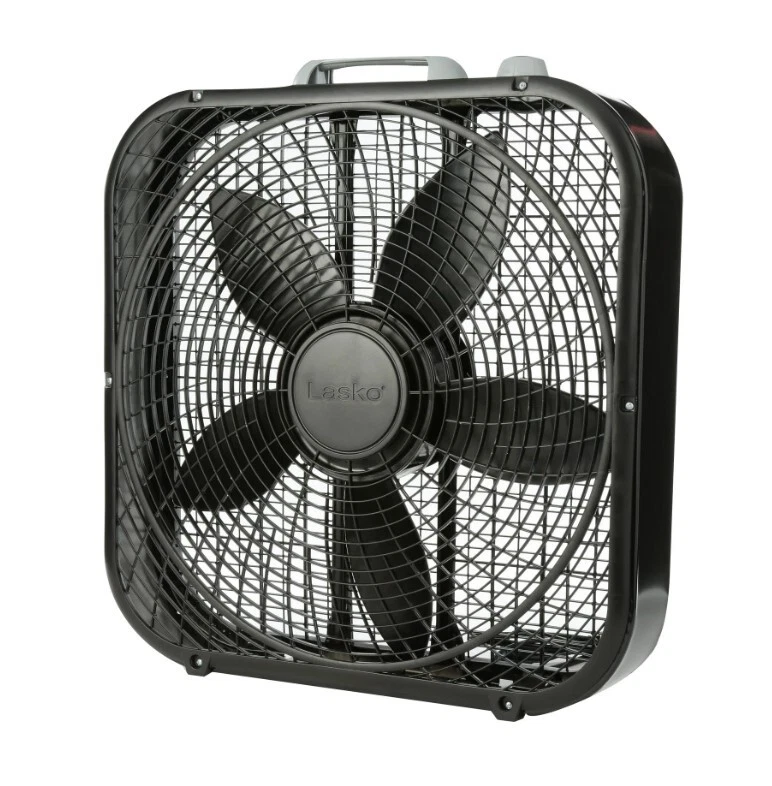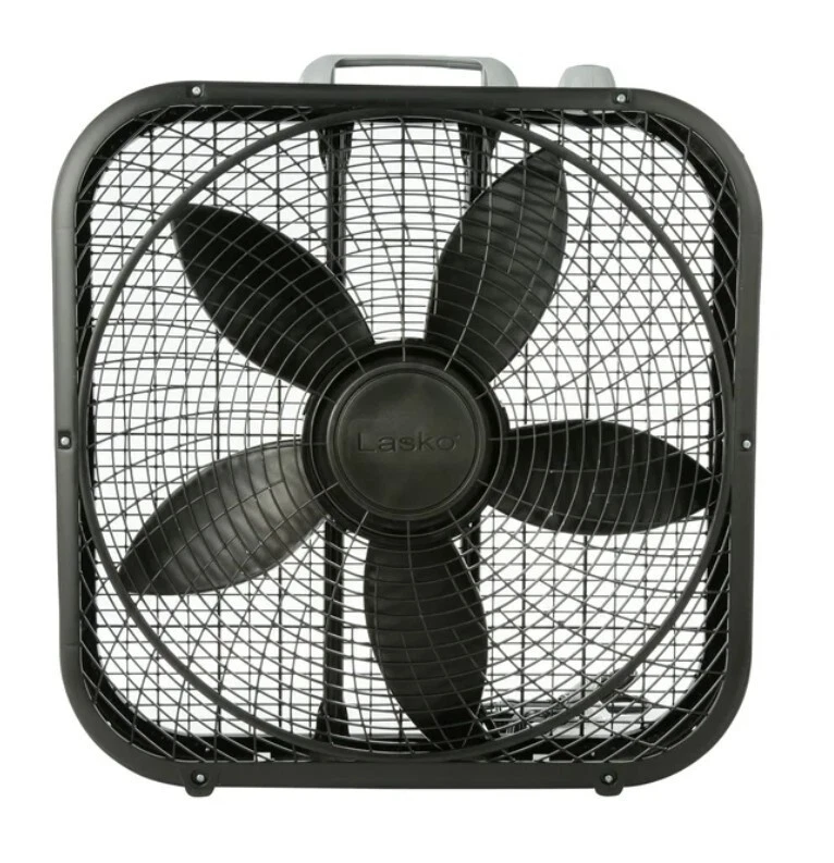 Lasko's Cool Colors Box Fan with a 20 inch fan blade in black has 3 quiet speeds, Save-Smart® energy efficiency (costs less than 2¢ per hour to operate), a durable steel frame, and a built-in carry handle. It's the perfect box fan for dorms, yoga studios, or any room that needs cooling airflow. Features a weather-resistant motor for worry-free indoor window use. Equipped with Blue Plug safety fuse technology, making this fan a safe and an energy-efficient option. 2-year limited warranty. Condition: New Slim 20 inch box fan provides high volume air movement Energy-efficient fan helps keep you feeling cooler while spending less than 2¢ per hour to operate Top-mounted manual controls are easy to reach 3 high-performance fan speeds Weather-resistant motor for worry-free window use Durable steel frame Safe, rounded corners Equipped with Lasko's trusted, fused safety plug Use in conjunction with an air conditioner to boost cooling airflow 1-Year Limited warranty