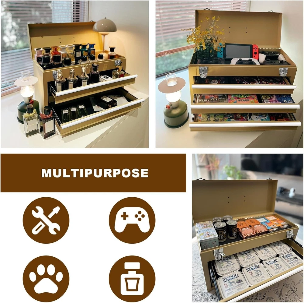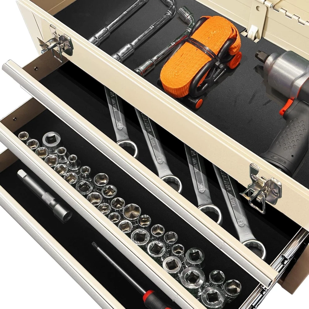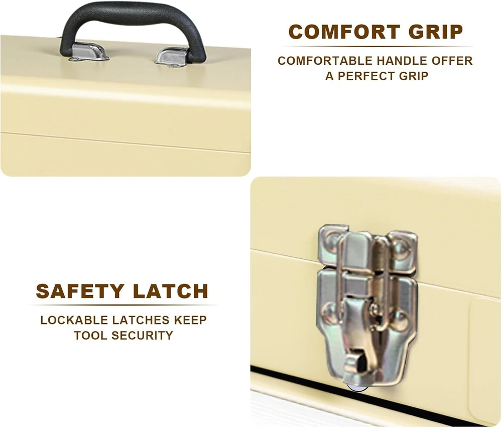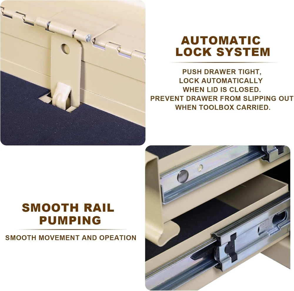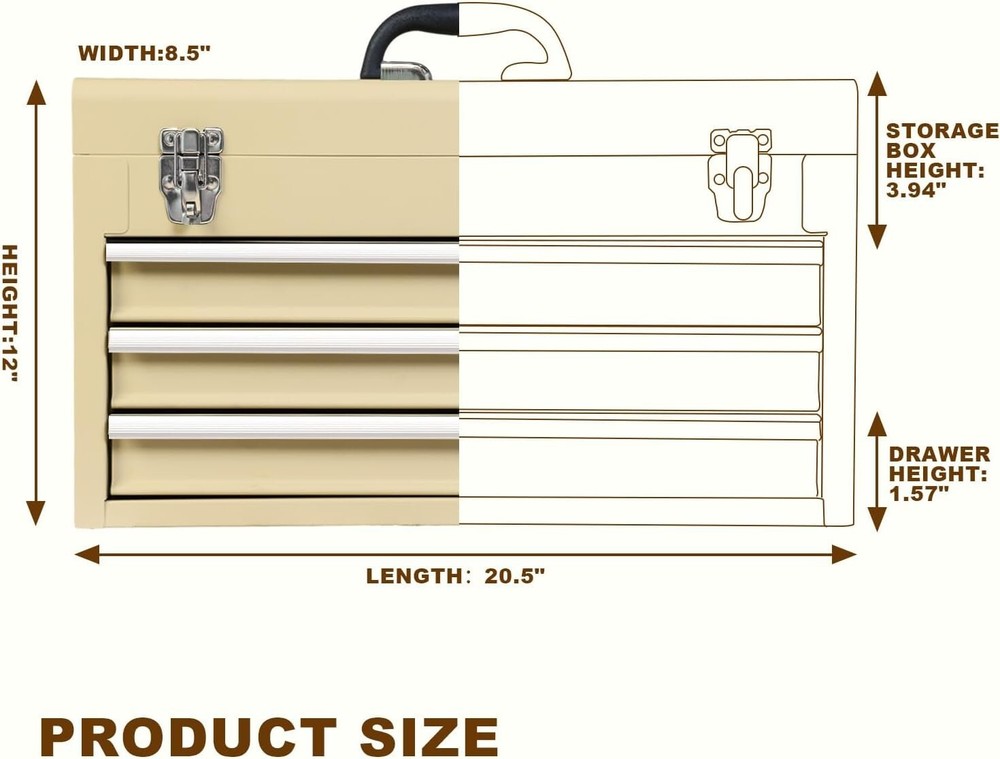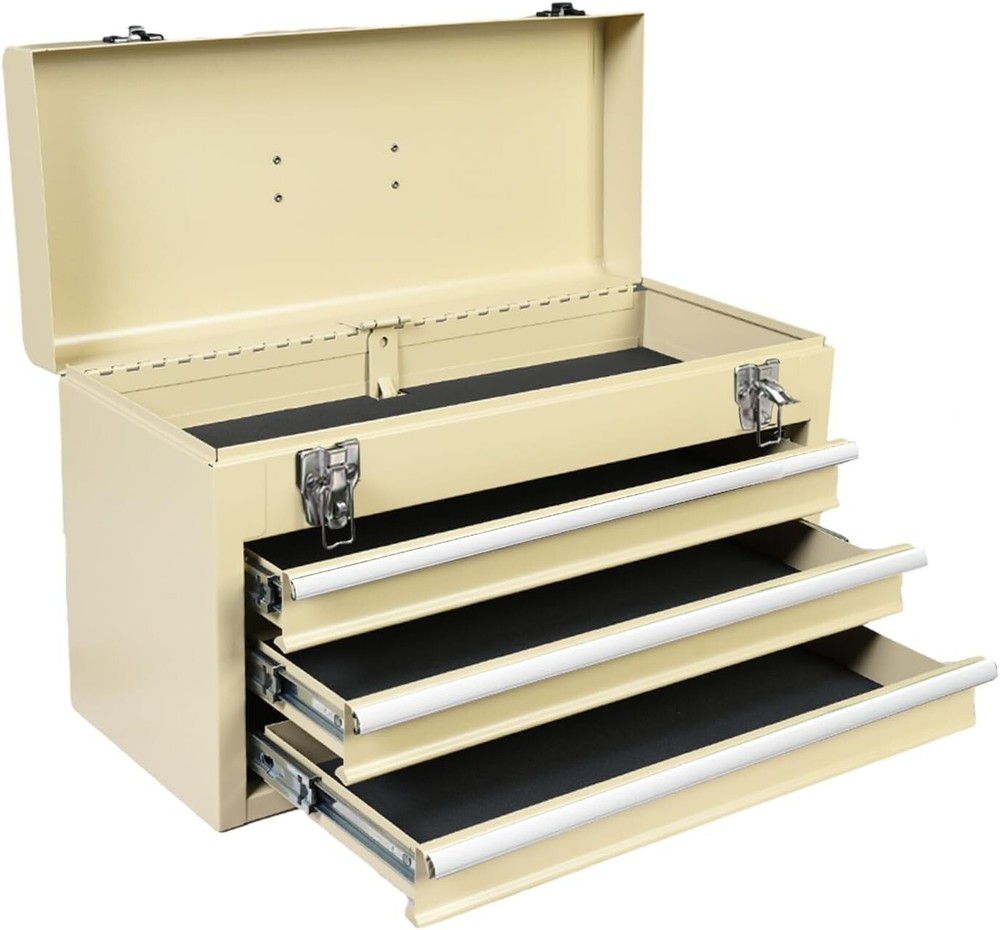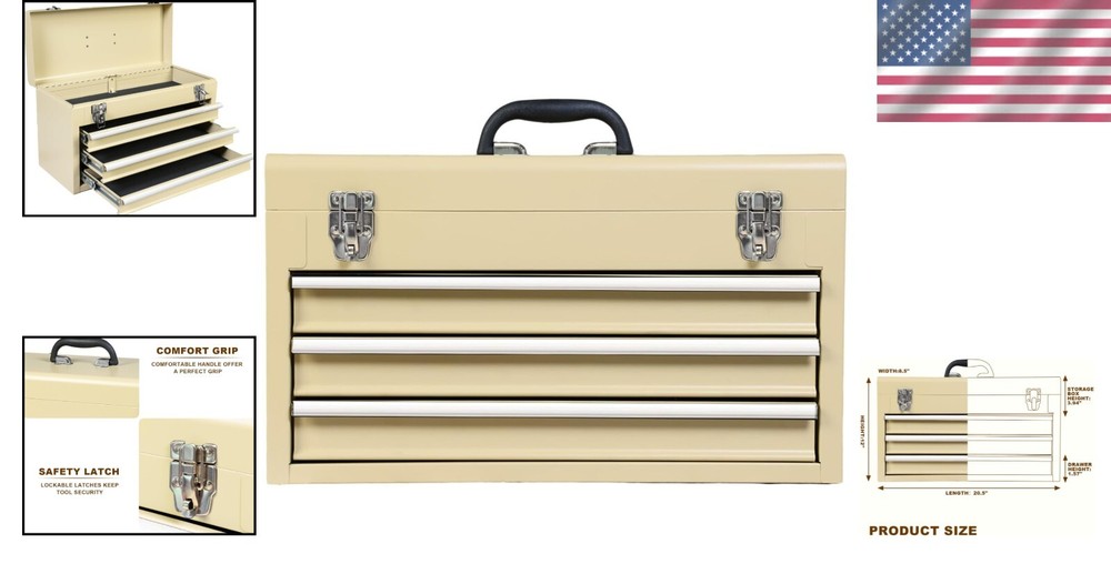Capacity: 90 lb Size: Medium Features: Lockable, Water Resistant, Heavy Duty, Portable, With Handle, 3 Drawers, Slip Proof Mats, Smooth Ball Bearing Slides, Locking Lid, Organized Storage, Metal Latch Closure Water Resistance Level: Water Resistant Included Components: Metal Tool Box Product Dimensions: 20.5"l X 8.5"w X 12"h Batteries Required?: No Brand: Unbranded gtin13: Does Not Apply Item Diameter: 20.5 inch Item Weight: 18.3 pounds Material: Steel Number Of Compartments: 1 Color: Yellow Item Package Quantity: 1 Number of Drawers: 3 Finish: Powder Coat UPC: Does Not Apply Number of Items: 1 Maximum Weight Recommendation: 90 Pounds Type: Tool Box