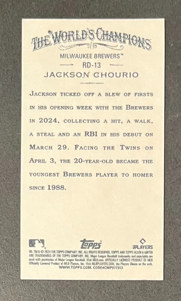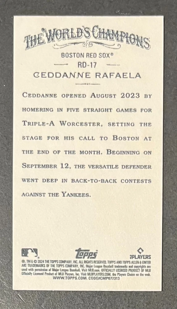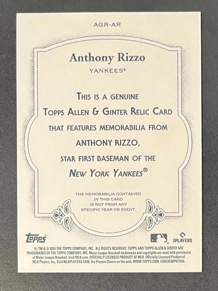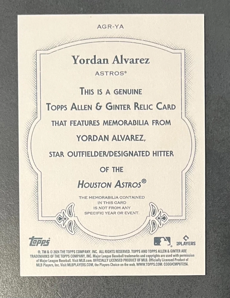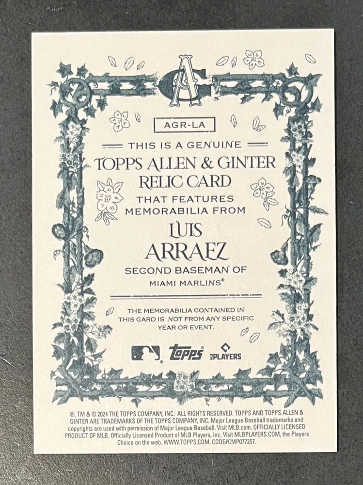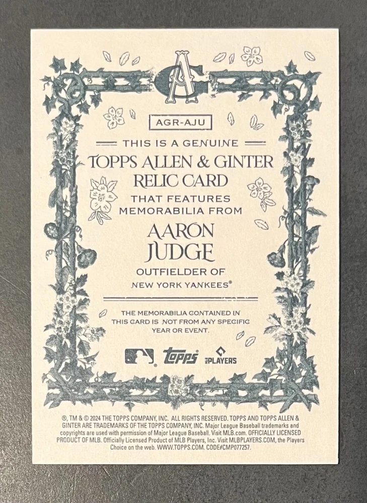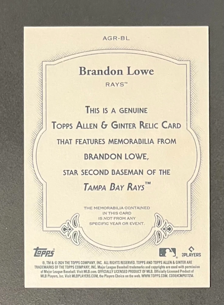 Features:Base Set, Framed, Parallel/Variety, RookieType:Sports Trading CardParallel/Variety:RelicLeague:Major League (MLB)Signed By:Lane ThomasManufacturer:ToppsSeason:2024Estado del artículo:UngradedTeam:Milwaukee Brewers, New York YankeesAutographed:YesSport:BaseballSet:2024 Allen & GinterPlayer/Athlete:Aaron Judge, Babe Ruth, Bob Gibson, Derek Jeter, Jackson Chourio, Nolan Ryan, Paul Molitor, Randy Arozarena, Rickey Henderson, Shohei Ohtani, Olivia Pichardo