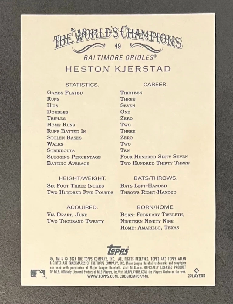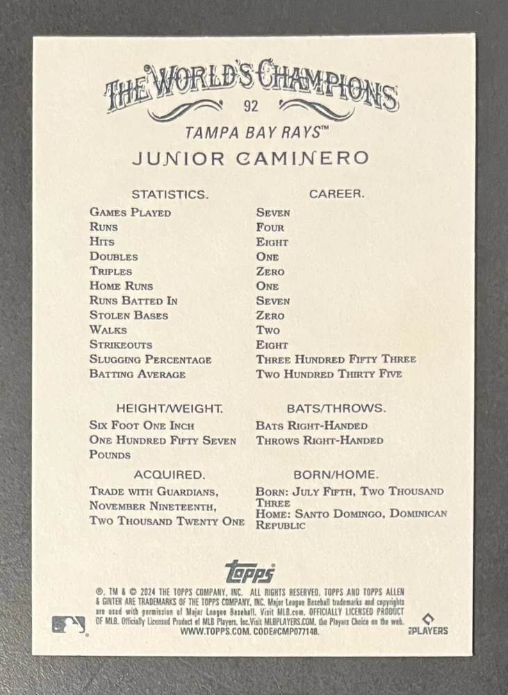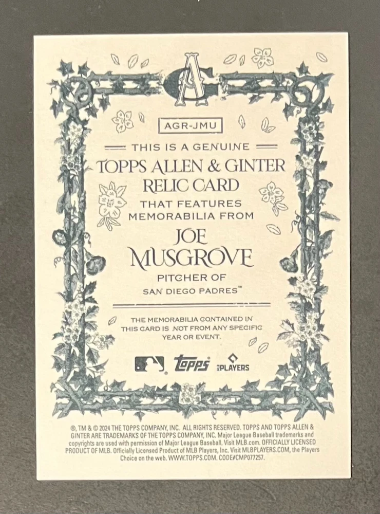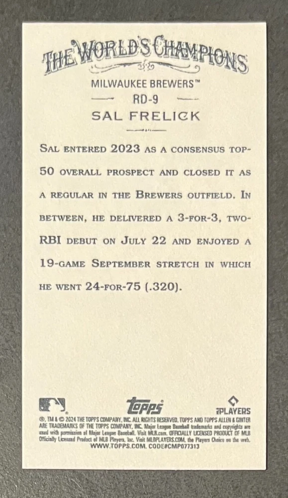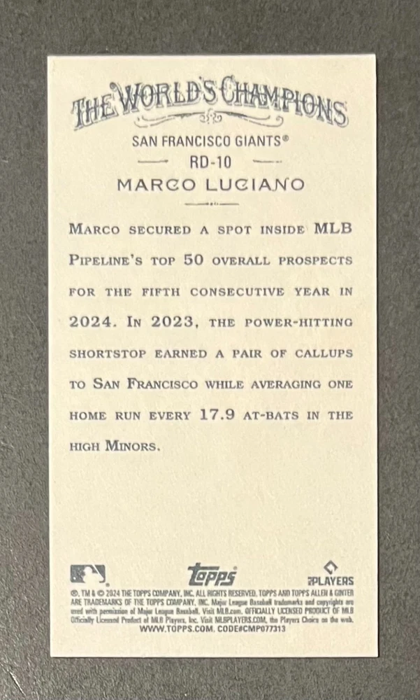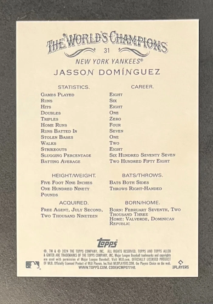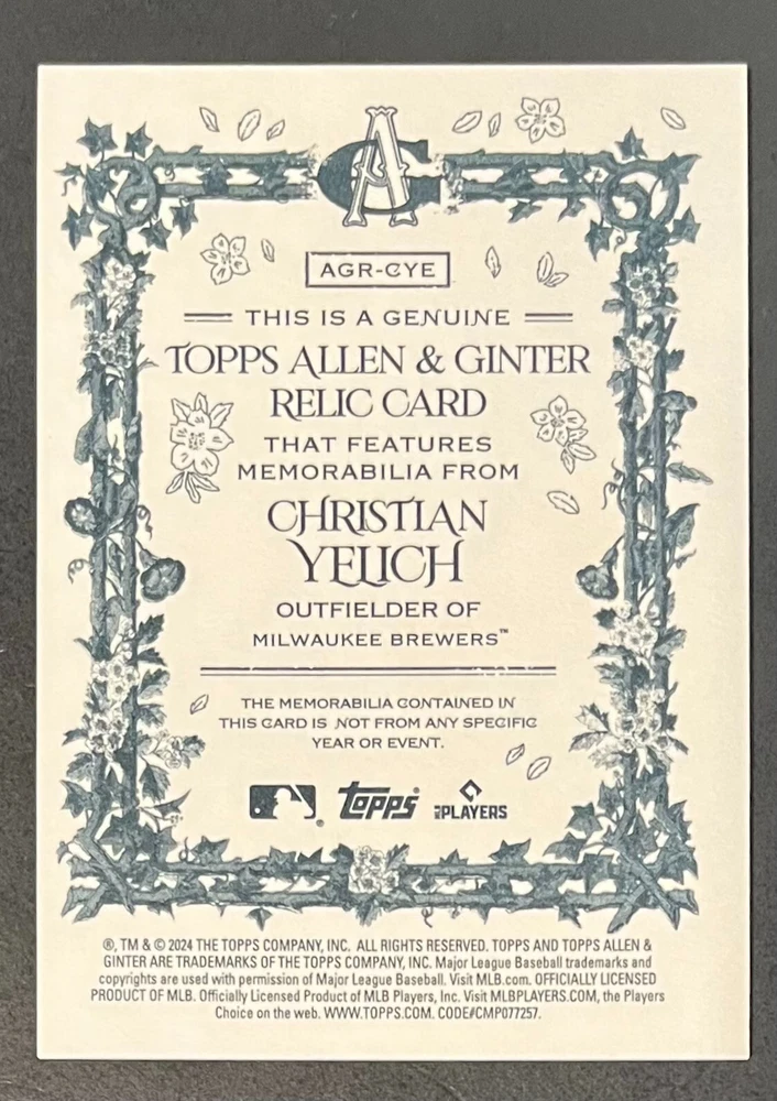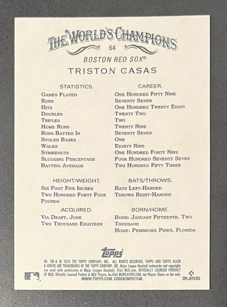 Features:Base Set, Framed, Parallel/Variety, RookieType:Sports Trading CardParallel/Variety:RelicLeague:Major League (MLB)Signed By:Lane ThomasManufacturer:ToppsSeason:2024Estado del artículo:UngradedTeam:Milwaukee Brewers, New York YankeesAutographed:YesSport:BaseballSet:2024 Allen & GinterPlayer/Athlete:Aaron Judge, Babe Ruth, Bob Gibson, Derek Jeter, Jackson Chourio, Nolan Ryan, Paul Molitor, Randy Arozarena, Rickey Henderson, Shohei Ohtani, Olivia Pichardo
