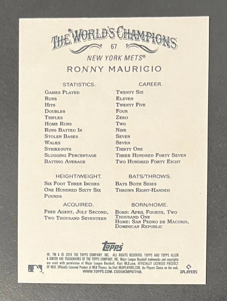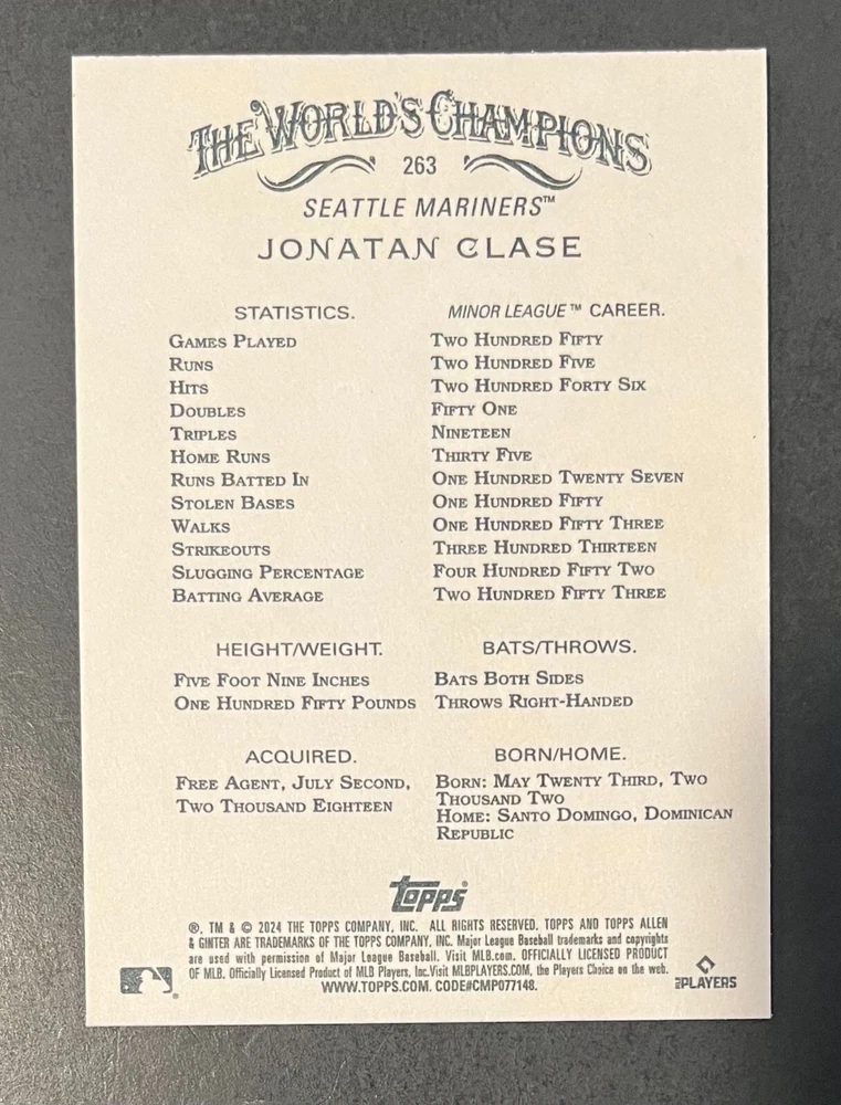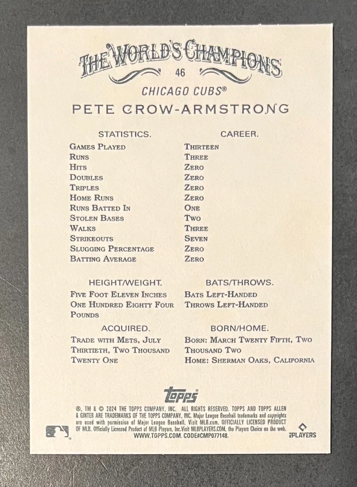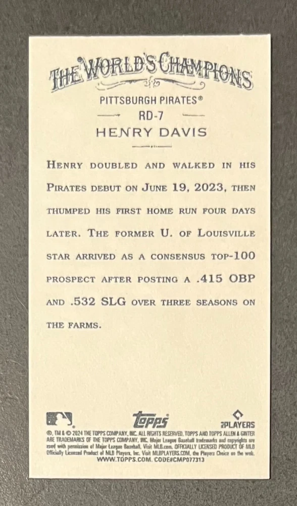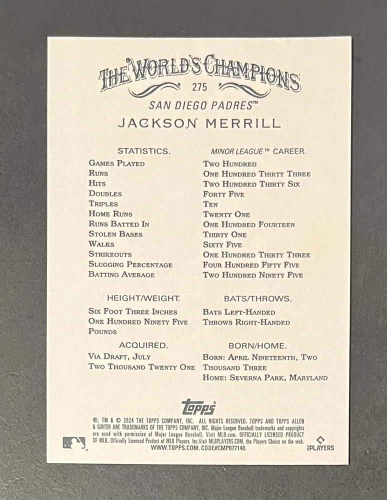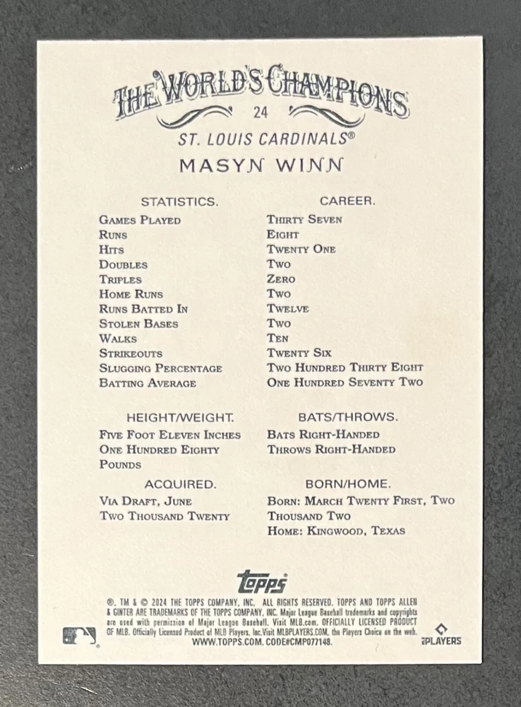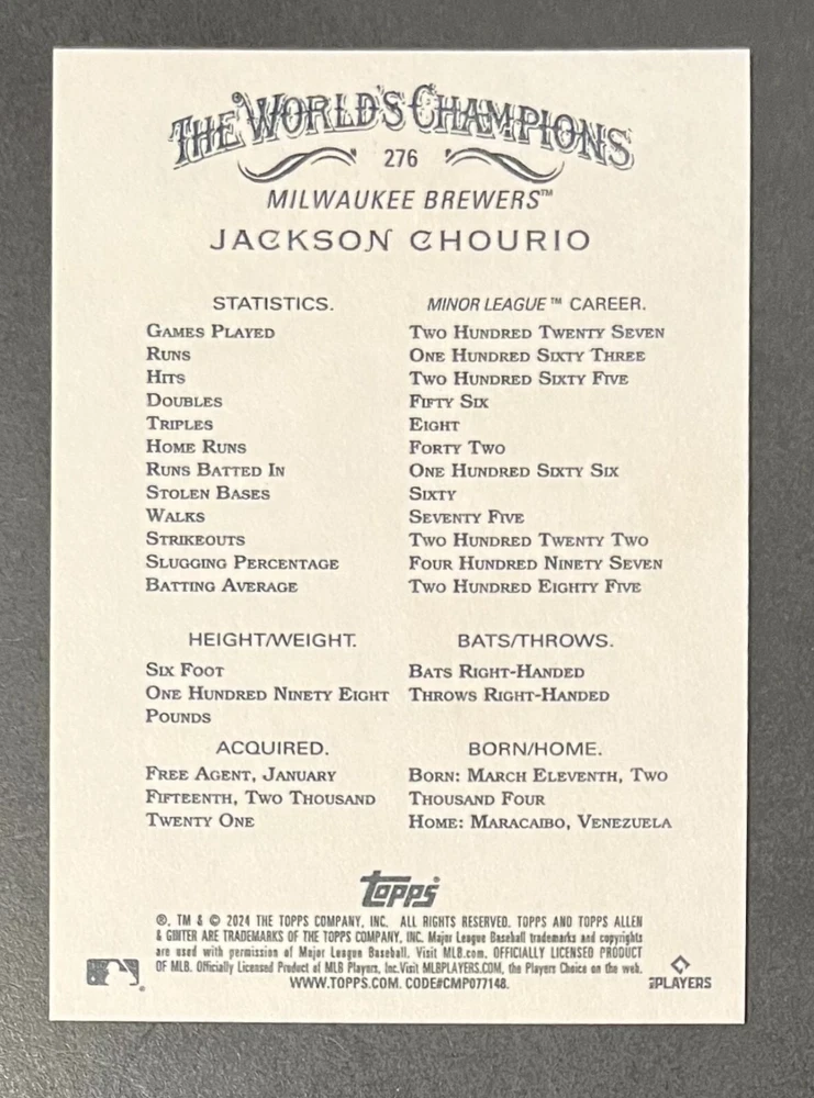 Features:Base Set, Framed, Parallel/Variety, RookieType:Sports Trading CardParallel/Variety:RelicLeague:Major League (MLB)Signed By:Lane ThomasManufacturer:ToppsSeason:2024Estado del artículo:UngradedTeam:Milwaukee Brewers, New York YankeesAutographed:YesSport:BaseballSet:2024 Allen & GinterPlayer/Athlete:Aaron Judge, Babe Ruth, Bob Gibson, Derek Jeter, Jackson Chourio, Nolan Ryan, Paul Molitor, Randy Arozarena, Rickey Henderson, Shohei Ohtani, Olivia Pichardo