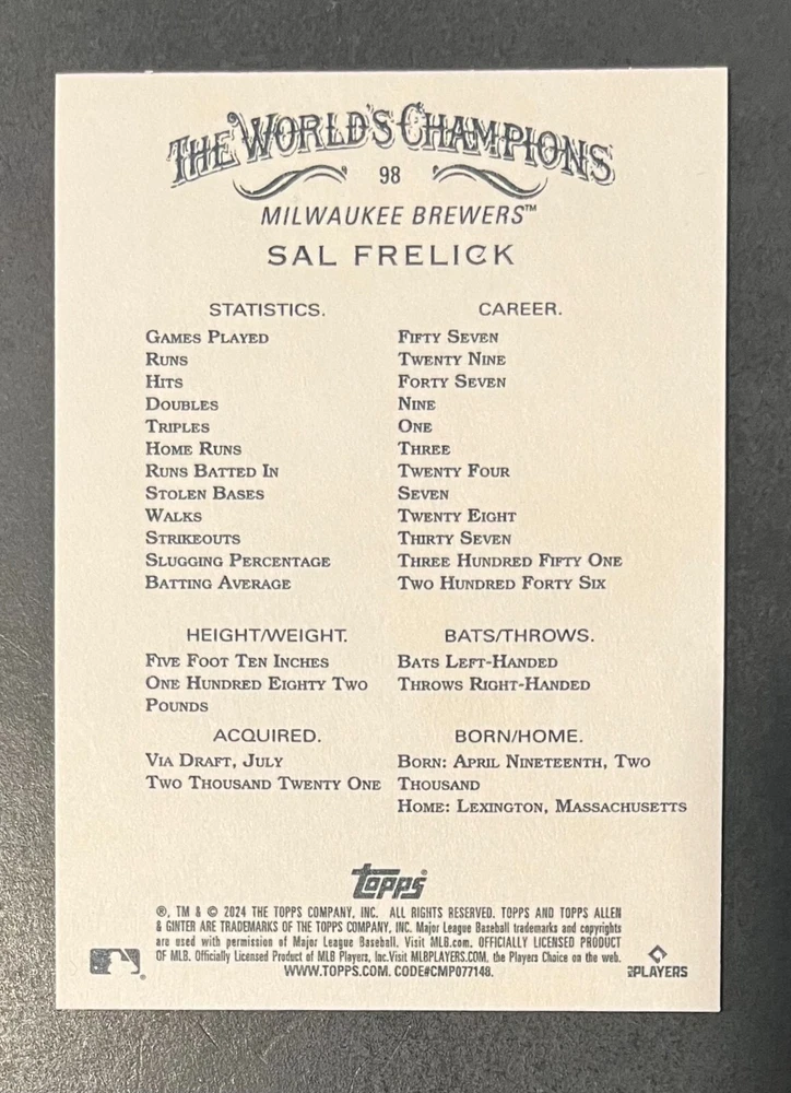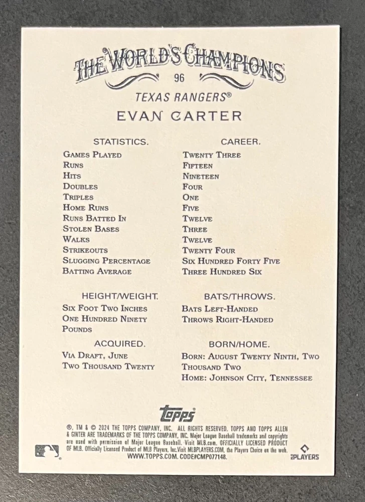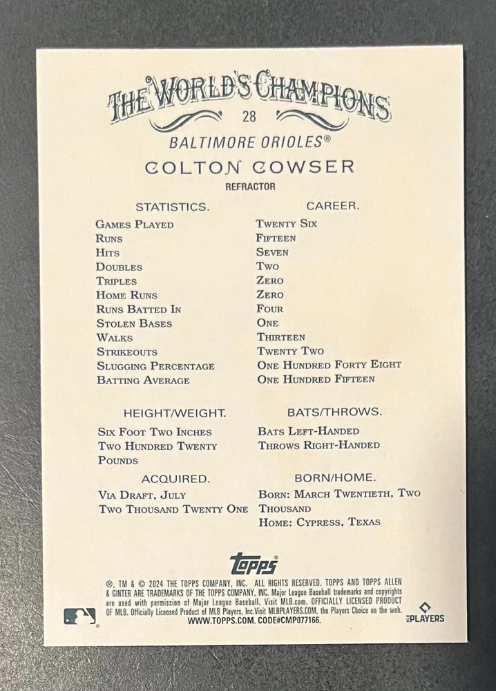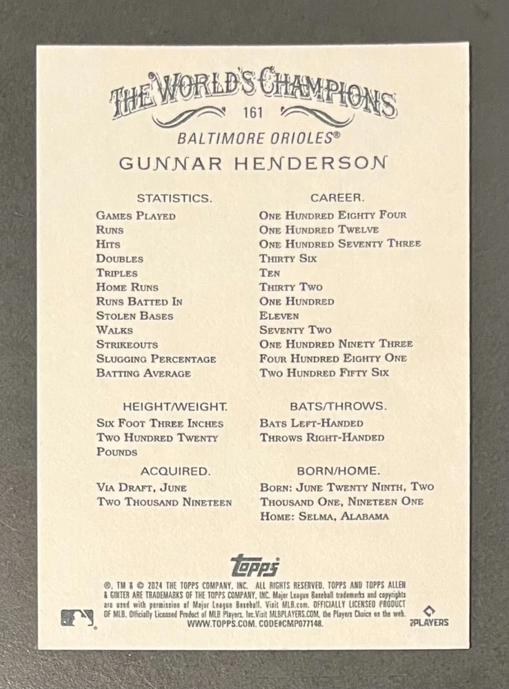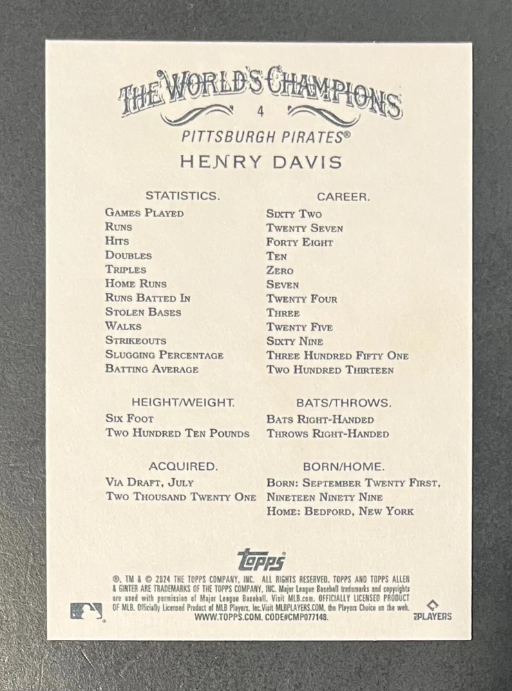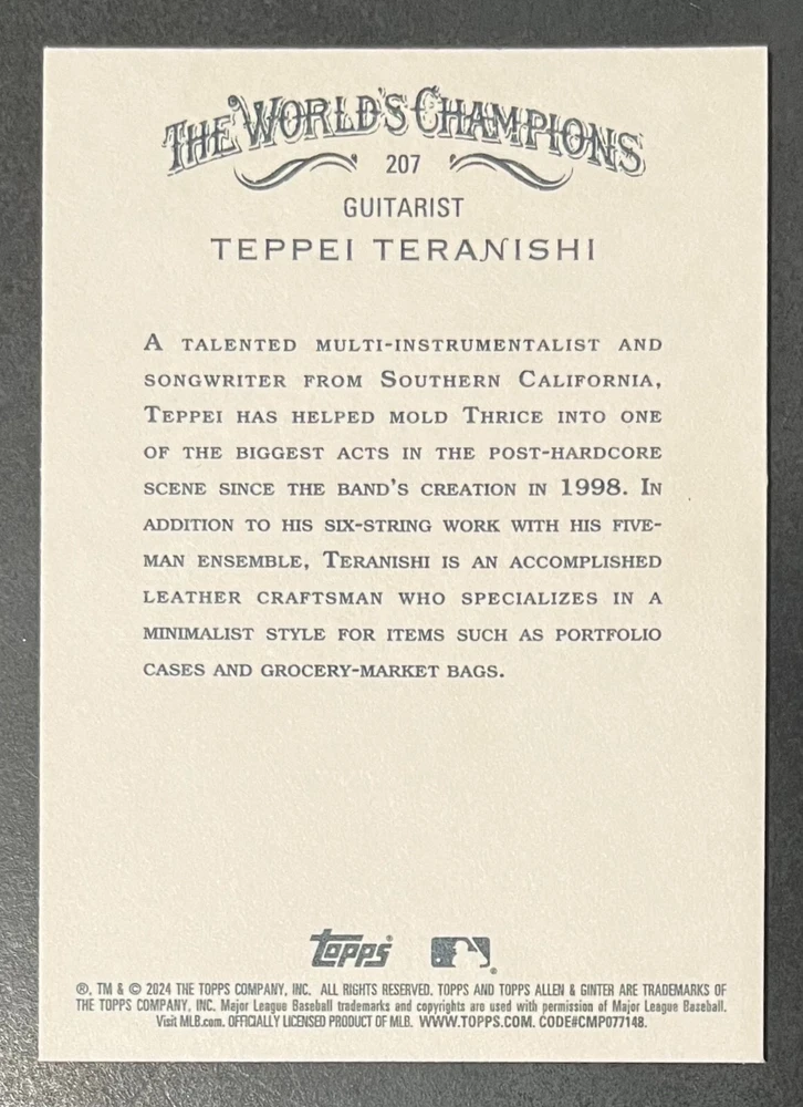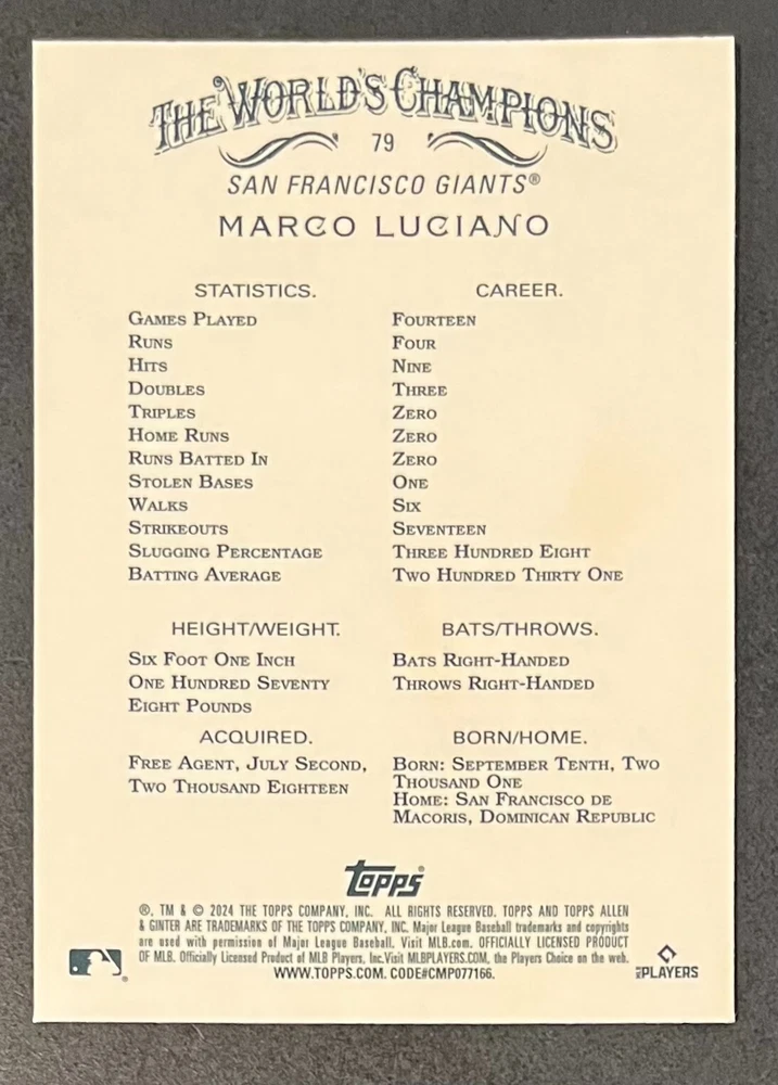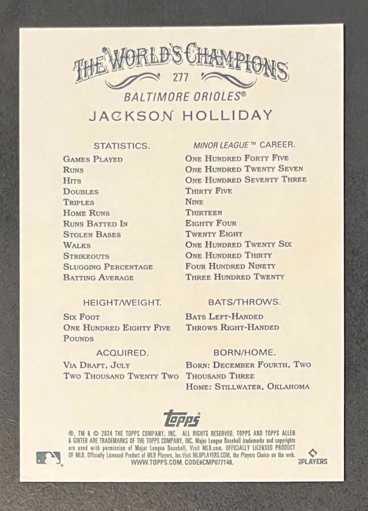 Features:Base Set, Framed, Parallel/Variety, RookieType:Sports Trading CardParallel/Variety:RelicLeague:Major League (MLB)Signed By:Lane ThomasManufacturer:ToppsSeason:2024Estado del artículo:UngradedTeam:Milwaukee Brewers, New York YankeesAutographed:YesSport:BaseballSet:2024 Allen & GinterPlayer/Athlete:Aaron Judge, Babe Ruth, Bob Gibson, Derek Jeter, Jackson Chourio, Nolan Ryan, Paul Molitor, Randy Arozarena, Rickey Henderson, Shohei Ohtani, Olivia Pichardo