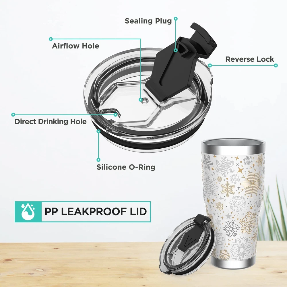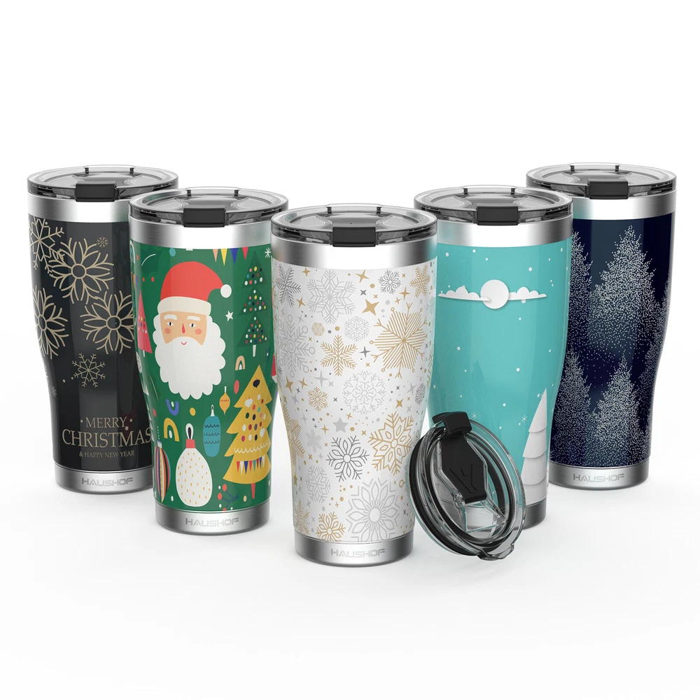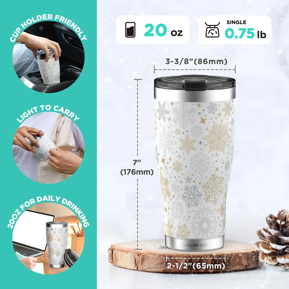 Outstanding Insulation: The double-wall insulation can keep your drink cold for 18 hours or hot for 6 hours. With the vacuum insulation design, there will be no condensation outside, so you can trustingly put it with electronics Safe Material: Use non-reactive and lightweight food grade 18/8 stainless steel, no peculiar smell, and BPA-free, easy to clean and good for your health. All materials in contact with water are FDA GRAS compliant Easy to Carry: The humanized shape with lower narrowing ensures the capacity and fits most cup holders for automobiles. And the tumbler body is comfortable for your hands too Good Sealing and Convenient Drinking: The lid seals well with the silicone O ring and flip cap for leak-free carrying. The big drinking mouth lets you choose a direct water flow or a straw-drinking Christmas Style Design: Christmas Style 3D printing makes the tumbler fully festive and attractive, suitable for Christmas parties, and a good choice for Christmas gifts Manufacturer HANGZHOU GREATSTAR INDUSTRIAL CO.,LTD UPC 820909681557 Capacity 1.3 Pounds Item Dimensions W x H 3.38"W x 7"H Item Weight 0.75 Pounds Age Range Description Adult Brand Name HAUSHOF Recommended Uses For Product Travel Built-In Media One Lid, One Tumbler Specific Uses For Product Hot Drinks Merry Christamas HAUSHOF 20oz Christmas Tumbler Good Quality and Considerate Details Five Kinds of Style Christmas-style 3D printing makes the tumbler fully festive and attractive, suitable for Christmas parties, and a good choice for Christmas gifts No Stain Remains Filled with coffee, milk, wine, coke, tea, or other drink, the tumbler will have no stain left after hand washing Good-Sealing Lid The lid seals well with the silicone O ring and flip cap for leak-free carrying Gift Box Packaging Packaged with a well-designed festive box full of Christmas elements, you can directly send the gift tumbler to families, friends, partners, etc Party with HAUSHOF Christmas Tumblers!
