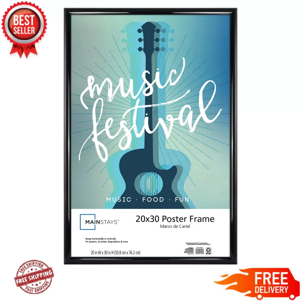 20" x 30" Trendsetter Poster and Picture Frame Home Office Wall Decor, Black Designed for posters, art prints and photo enlargements Made with polystyrene plastic Features 20" x 30" poster frame opening The Mainstays poster frame is suitable for vertical or horizontal wall displays Economical and lightweight Display portraits, panoramic photos, paintings and more Sleek black design Includes a hard backing to keep images flat during hanging Suitable for home, office and business use Create a sleek and polished look by using the Mainstays 20 x 30 Trendsetter Poster and Picture Frame to highlight your favorite band posters, artwork or projects from school. Use the 1-inch thick black frame to blend seamlessly with the decor of your bedroom or office, matching up other black accessories for a uniform appearance. The plastic face of the poster frame protects your picture from scratches and dust with a lightweight clear material, giving a glossy tone over the top of your pictures and keeping it shielded from everyday events. Hang it either vertically or horizontally to accommodate the design of your home and the positioning of the picture. Use several of the simple, yet classic frames to create a gallery wall highlighting your pieces along your hallway. This Mainstays 20 x 30 Trendsetter Poster & Picture Frame creates a sophisticated look along your wall as you display your favorite art pieces and enlarged photographs. Mainstays 20" x 30" Plastic Picture Frames, Black: manufacturer_part_number 20x30 Color Black Assembled Product Weight 9.8 lbs Assembled Product Dimensions (L x W x H) 21.25 x 3.38 x 31.88 Inches