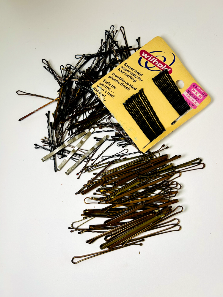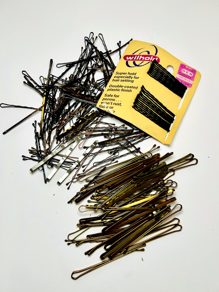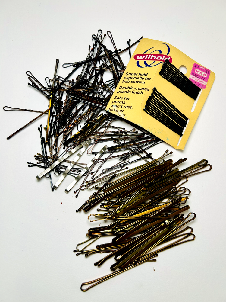Lot of over 200 black and brown bobby pins from the 1980s. Some in new condition. Most in good used condition. Includes over 155 regular sized bobby pins (1.75 inch), 4 decorative bobby pins and 44 large (2.75 inch) bobby pins.