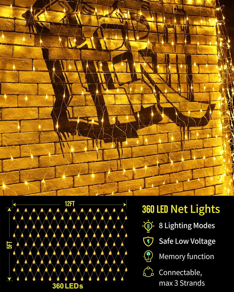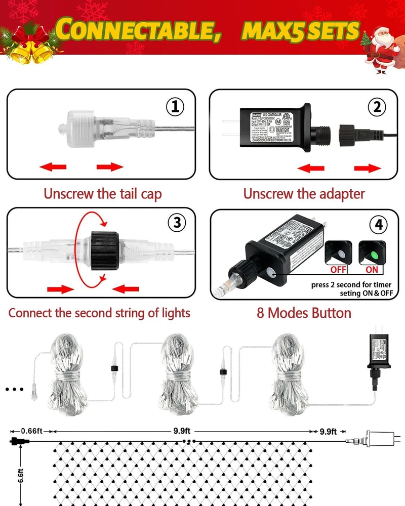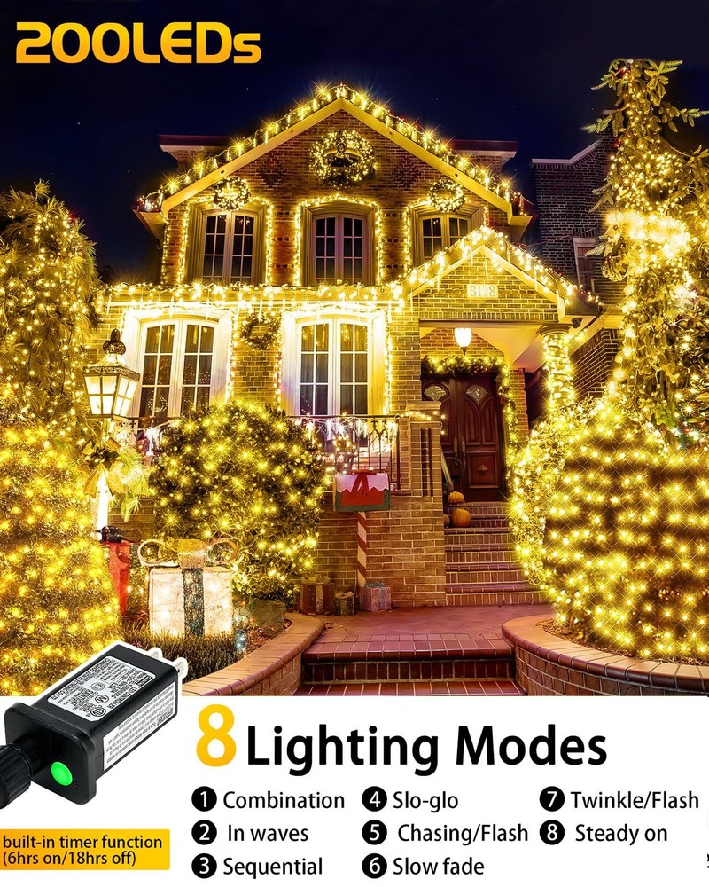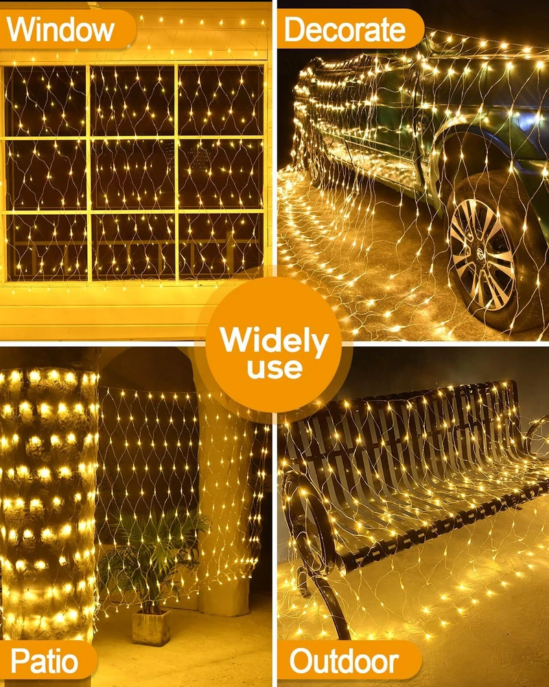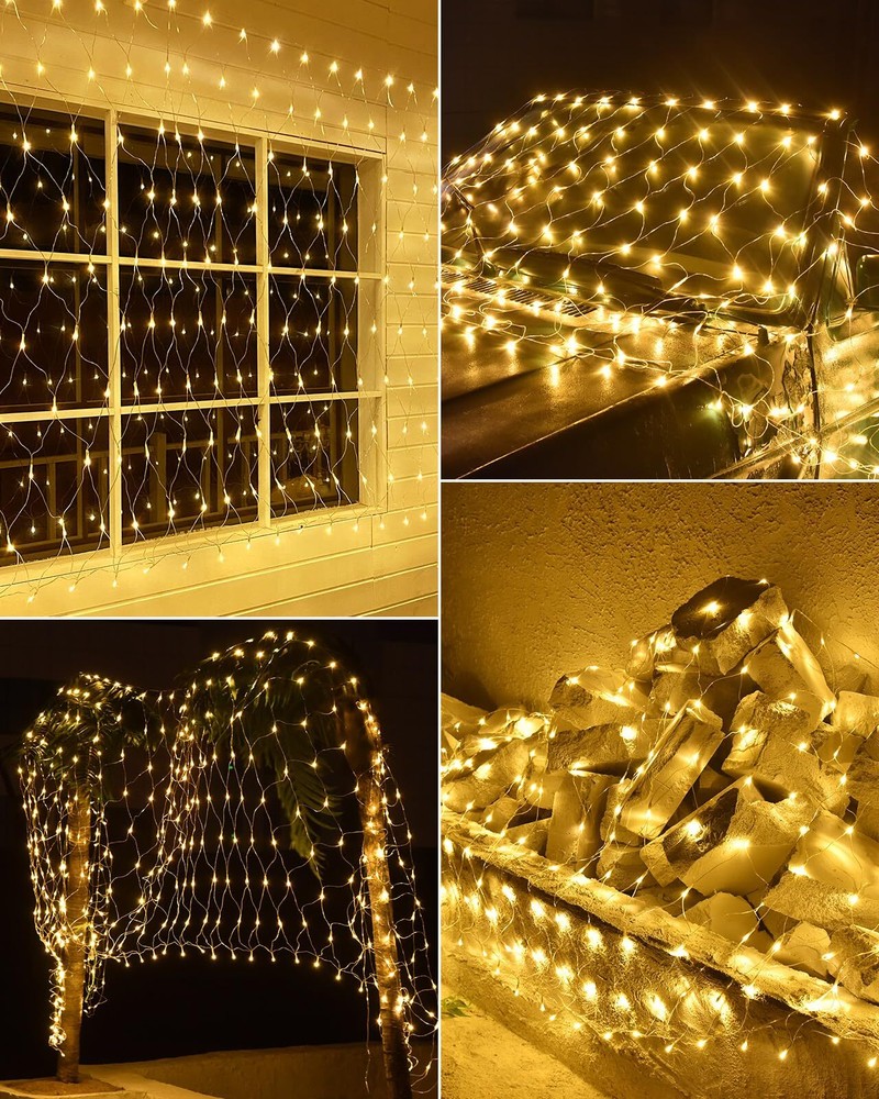 200 LED Christmas Decorative Lights, 9.8ft x 6.6ft Christmas Net Lights with 8 Modes, Connectable, Timer, Waterproof, Low Voltage Bush Mesh Lights for Christmas Decorations, Home, Wedding Upgrade Christmas Net Lights - 200 led net lights for Christmas indoor outdoor decorations,our transparent wire net lights can perfectly intergrated with bushes, trees and make your yard/garden looks more natural at daytime,Mesh lights size 9.8ft x 6.6ft with 9.8ft lead cable 8 Lighting Modes & Memory Function - This Christmas lights have 8 different modes: Steady on, Wave, Sequence, Chase, Flash, Flash/Flash, Slow Flash and Slow fade,Each mode is so different and having that option is great as each night mode is different,you only need to press the button on the adapter to chose what you love. A built-in memory chip automatic saves your last mode setting without having to reset the mode every day Waterproof Christmas Decorative Lights - Our mesh fairy string lights are IP44 waterproof,It's perfect for Christmas indoor outdoor decorations,No need to worry about bad weather (Note:The adaptor is not waterproof, please keep the adaptor away from water) UL 588 & Connectable Chrismtas Mesh Lights- The mesh fairy Christmas lights has passed the authoritative UL588 safe certification.The output voltage of the Christmas decorative net lights is 30V,safety voltage for human body.End to end connectable,max 5 sets,allow you to decorate your lighting area with the desired length Widely Use - Bush Mesh string lights perfect for Christmas decorations,home, Garden, Wall, Window, Christmas, Party, Wedding etc,also great for Christmas, party, Valentine's day, wedding, Home, Window, Bathroom, thanksgiving day, holiday, shows, restaurant, hotel, commercial building decoration SHIPPING Domestic Buyers - We have confidence in our products, but if you are not fully satisfied please contact us within 30 days of purchase and you will get full refund. - We ship within 3 business days of payment, usually sooner - We offer FREE shipping on all orders! - We only ship to the lower 48 states, no APO/FPO addresses or PO Boxes allowed International buyers – please note: Import duties, taxes, and charges aren't included in the item price or postage cost. These charges are the buyer's responsibility. - Please check with your country's customs office to determine what these additional costs will be prior to bidding or buying. * Order Cancellation Policy ** You can return a product for up to 30 days from the date you purchased it. 1. The seller reserves the right to cancel the special case only due to eBay cancellation fee. 2. The decision of seller is the final. 3. The seller will respond to the cancellation request within 2 business days. Please wait for the result of cancellation. 4. In case the cancellation is not completed by some reasons, the buyer can follow the options below to get the refund. 4.1 The buyer can reject the item when it arrives. 4.2 The buyer can send the item back to the seller within 30 days If the buyer receives item (USA Shipment ONLY). The seller will provide the FREE return label to the buyer when the buyer opens " Return Item" case on eBay by using the reason as "Change my mind" ONLY. 5. When buyer has placed the order. The order will be processed and completed by automatic warehouse system within 5 minutes. In case that buyer sends the cancellation request after 5 minutes of placing the order, the request will be rejected. **Sending direct message to cancel the order is not allowed for every case.* Return Policy For the return case - If buyer would like to return the items for refund or replacement, please CONTACT SELLER to receive the free return label from seller. The refund or replacement will be processed with the tracking number of return label which is provided by seller only. The other ways of return which are not approved by seller will not be processed for the refund or replacement.