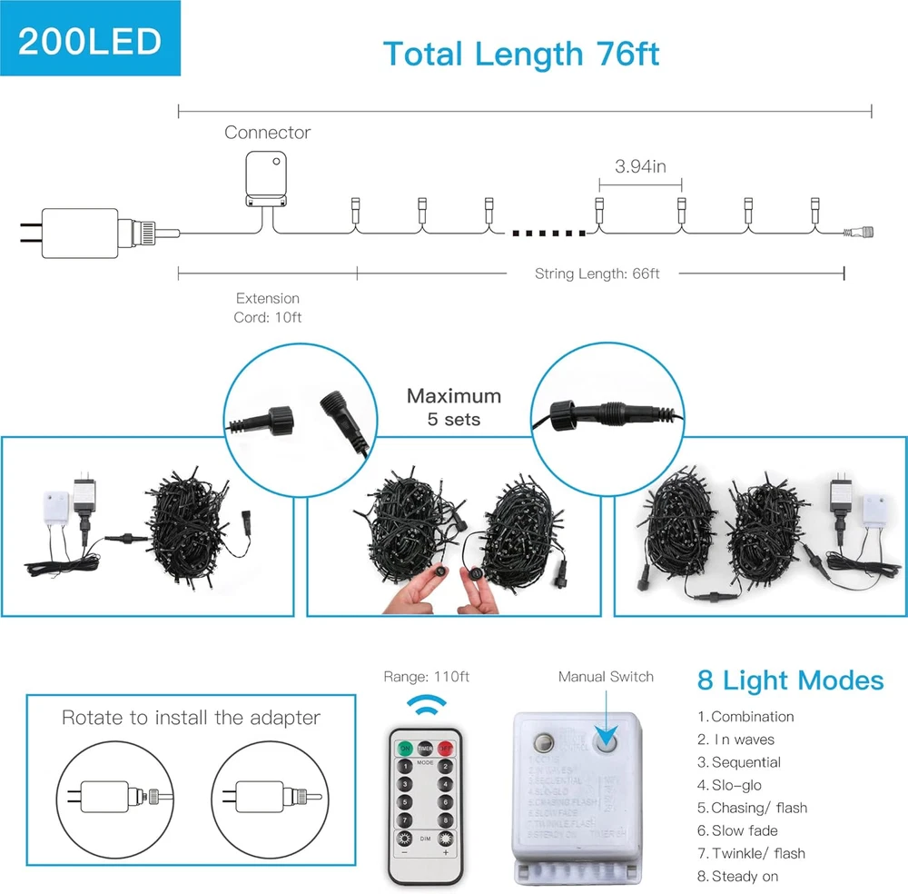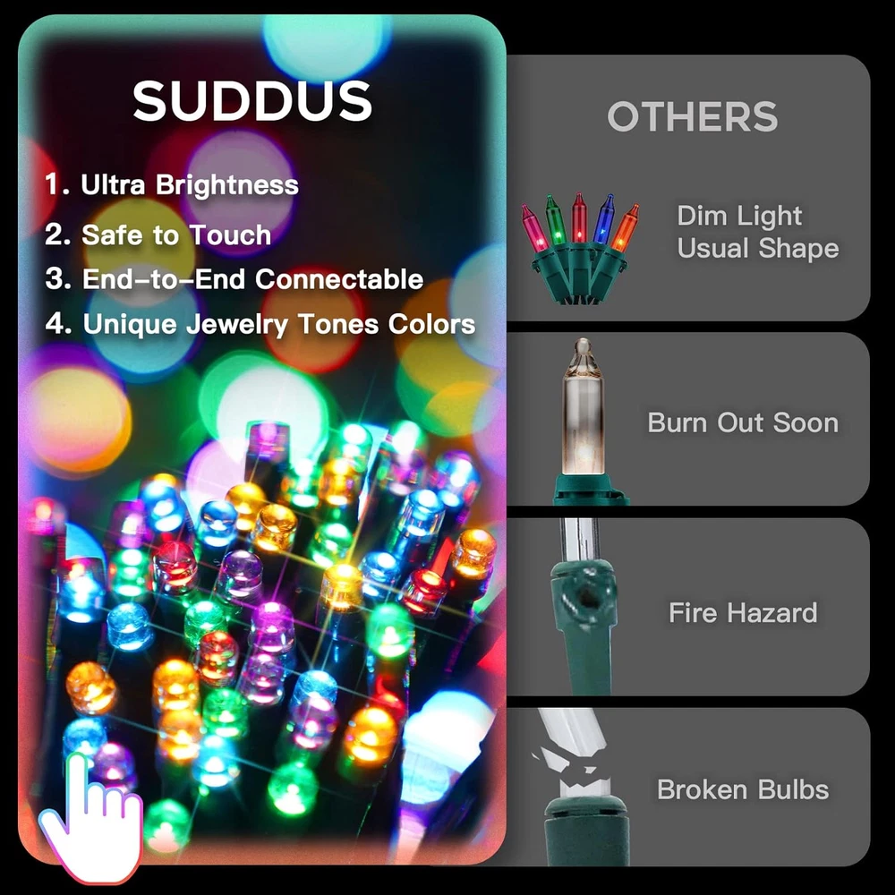 Store New Arrivals Add to Favorite View Feedback Contact Fast deliveries to the customer's home Quality customer service John Make the customers happy! 200 LED Multicolor Christmas Lights, 8 Modes Blinking Christmas Tree Lights with Remote, Colored Christmas String Lights for Outdoor Indoor Party Decoration Description π[Long Length and END-TO-END]: 200 LED multi colored Christmas Lights 66ft long, plus a 10ft extension cord. The updated mini outdoor Christmas lights are end-to-end connectable. It could be extended to a maximum of 6 light strings (total 396ft/1200led). Choose more than one, these extra-long strings of lights can be used to decorate any big scene you want. Just need 1 remote to control all lights and 1 socket for electricity. π[Super Bright and 4 Brightness Levels]: Super brightness Christmas tree lights to give your Christmas decoration icing on the cake. Both day and night, it is particularly conspicuous. The Christmas lights have 4 brightness levels, you just need to press the dim +/- button on the remote for settings of 100%, 75%, 50%, or 25%. π[5 Gorgeous Colors and 8 Modes]: SUDDUS blinking christmas lights have five unique colors: lime green, aquamarine, rose, ruby, and orange. SUDDUS exclusive multi-color Christmas lights have 5 superior jewelry tones colors, and higher quality. This 200led colored Christmas lights have 8 lighting modes: steady on and 7 flashing modes (comb, in waves, sequential, slo-glo, chasing/ flash, slow fade, and twinkle/ flash). Creating a colorful and twinkling dream world for you. π[Waterproof and Safety]: IP44 Christmas string light is waterproof (Both the plugs and end-to-end connectors have caps to block the ingress of water), suitable for indoor and outdoor decorations, including trees, pathways, garlands, houses, roofs, balcony, party, porch, garden and anywhere. UL588 safety-certified Christmas lights come with 3 strands of wires, which can withstand long working times. So it will be more durable. It will not have an overheating problem. Save to touch any time. π[Remote Control and Timer Function]: The range of the remote control is 32ft. With a wireless remote, you donβt need to walk across your yard to control the lights. The updated XMAS lights have 3 different Timer Functions to meet your various needs. When you press this button, you can free your hands and it will work functionally. Product Description Holiday Joy Shines Brightest with Festive Christmas Lights! The video showcases the product in use. The video guides you through product setup. The video compares multiple products. The video shows the product being unpacked. The colorful and twinkling lights bring joy to children and families, often becoming a source of wonder and excitement. Christmas lights are not just decorations; they become a backdrop for family photos and cherished memories. A Tree Filled with Kids' Holiday Delight Christmas Comfort Begins at the Fireplace's Glow Make Your Home's Yard the Talk of the Town From lawn to porch, create a merry winter wonderland with SUDDUS Christmas Lights! A well-decorated Christmas yard becomes a visual focal point in the community, drawing the attention of neighbors and passersby. It becomes a beacon of holiday cheer and celebration. IP44 Waterproof No matter what the weather, this Christmas light can work normally. Perfect for Christmas trees, garden decorations, balconies, shrubs, and fences. Safe to Touch It is safe to touch it at any time, do not worry about overheating. The light comes with 3 strands of wires, which can withstand a long working time. 8 Modes Christmas lights have 8 lighting modes: 1 steady on and 7 flashings. The memory function of the remote control can remember the last mode you set. 3 Timer 6: 6hr on, 18hr off. 8: 8hr on, 16hr off. 6639: 6hr on, 6hr off, 3hr on, 9hr off, every 24 hours Limitless Creativity with Connectable Christmas Lights! Whether you're decorating a vast garden, an expansive front yard, or creating a breathtaking holiday scene within your home, connectable Christmas string lights provide the flexibility and adaptability you need to bring your creative ideas to life. SUDDUS CHRISTMAS LIGHTS Add to Cart Add to Cart Add to Cart Add to Cart Add to Cart Add to Cart Add to Cart Customer Reviews 4.5 out of 5 stars 458 4.4 out of 5 stars 582 4.5 out of 5 stars 700 4.4 out of 5 stars 6,517 4.3 out of 5 stars 683 4.3 out of 5 stars 3,151 4.4 out of 5 stars 6,517 Price $29.99 $ 29 . 99 $27.99 $ 27 . 99 $24.99 $ 24 . 99 $14.99 $ 14 . 99 $18.99 $ 18 . 99 $15.98 $ 15 . 98 $14.99 $ 14 . 99 Power Source Plug in Plug in Plug in Battery Battery USB Battery Color Multicolor Warm White Warm White Warm White Warm White Warm White Multicolor LED Quantity 200 LED 200 LED 100 LED 200 LED 100 LED 200 LED 200 LED Connectable YES YES YES NO NO NO NO Special Features Unique Light Color Diamond-Shape Led Bulbs Clear Wired Strand Flexible Copper Wire Globe Shape Bulb Vertical Waterfall Lights Flexible Copper Wire Item model number SDSW-200MC Light Source Type LED Style Modern Number of Items 1 Power Source Corded Electric Number of Light Sources 200 Control Method Remote Switch Style Touch Theme Jewelry,Christmas Batteries Included? No Controller Type button,remote Batteries Required? No Wireless Communication Technology Infrared Material Plastic, Rubber Seasons winter Package Dimensions 7.13 x 4.06 x 3.74 inches Included Components Remote Indoor/Outdoor Usage Outdoor, Indoor Light Color Multicolor Water Resistance Level Waterproof Item Weight 1.1 pounds Occasion Easter, Wedding, Christmas, Halloween, Thanksgiving Special Features Corded Special Feature Corded Part Number EXS-S-0200-R Shade Color Multicolor Color Multicolor Voltage 120 Volts Size 200 LED ABOUT US We offer the best prices around on high quality products. Our E-store includes media such as books, movies, music and games while offering electronics, toys, sporting apparel, clothing, tools, general home, garden items and more. SHIPPING We a