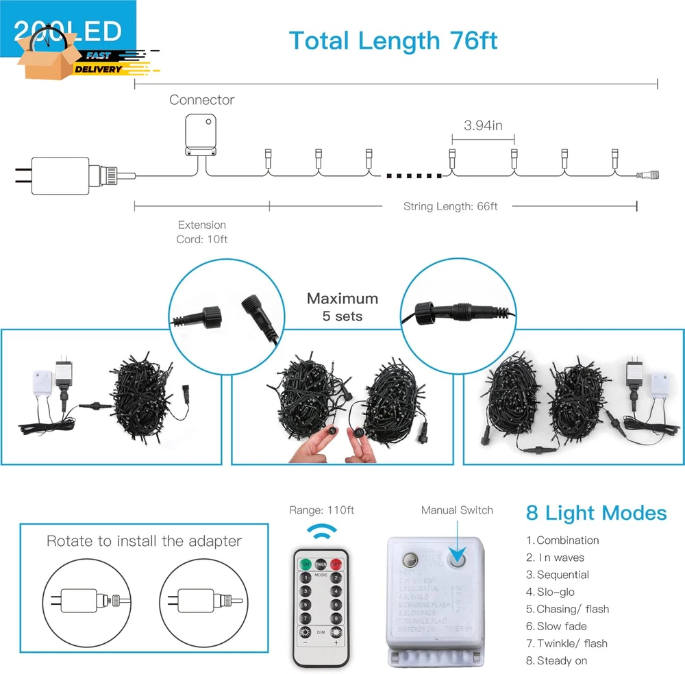 Special Feature: Corded Package Dimensions: 7.13 x 4.06 x 3.74 inches; 1.1 Pounds Additional Features: Corded Style Name: Modern Indoor/Outdoor Usage: Outdoor, Indoor Indoor Outdoor Usage: Outdoor, Indoor gtin13: 7445025254275 Controller Type: button,remote Seasons: winter Brand: Does not apply Number of Light Sources: 200 Type: Does not apply Light Color: Multicolor Voltage: 120 Volts Item Weight: 0.5 Kilograms Occasion: Easter, Wedding, Christmas, Halloween, Thanksgiving Water Resistance Level: Waterproof Power Source: Corded Electric Wireless Communication Technology: Infrared Control Method: Remote Style Number: SDSW-200MC Occasion Type: Easter, Wedding, Christmas, Halloween, Thanksgiving Item model number: SDSW-200MC Included Components: Remote Style: Modern Size: 200 LED Light Source Type: LED UPC: 7445025254275 Material Type: Plastic, Rubber Color: Multicolor Number of Items: 1 Theme: Jewelry,Christmas