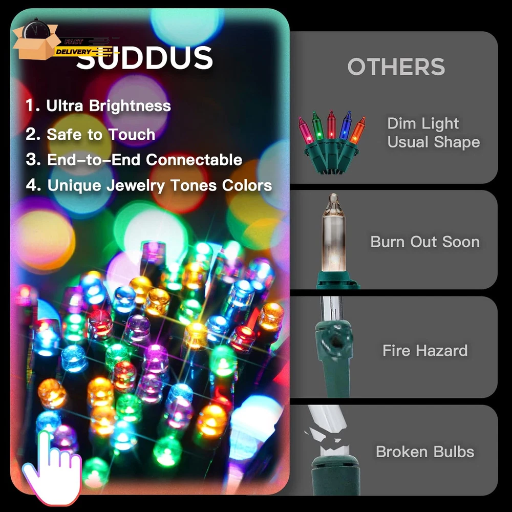 Store New Arrivals Add to Favorite View Feedback Contact 200 LED Multicolor Christmas Lights, 8 Modes Blinking Christmas Tree Lights with Remote, Colored Christmas String Lights for Outdoor Indoor Party Decoration Description Item model number SDSW-200MC Light Source Type LED Style Modern Number of Items 1 Power Source Corded Electric Number of Light Sources 200 Control Method Remote Theme Jewelry,Christmas Style Number SDSW-200MC Controller Type button,remote Wireless Communication Technology Infrared Occasion Type Easter, Wedding, Christmas, Halloween, Thanksgiving Seasons winter Additional Features Corded Package Dimensions 7.13 x 4.06 x 3.74 inches; 1.1 Pounds Indoor/Outdoor Usage Outdoor, Indoor Material Type Plastic, Rubber Light Color Multicolor Water Resistance Level Waterproof Item Weight 0.5 Kilograms Occasion Easter, Wedding, Christmas, Halloween, Thanksgiving Special Feature Corded Color Multicolor Indoor Outdoor Usage Outdoor, Indoor Voltage 120 Volts Included Components Remote Style Name Modern Size 200 LED πŸŽ„[Long Length and END-TO-END]: 200 LED multi colored Christmas Lights 66ft long, plus a 10ft extension cord. The updated mini outdoor Christmas lights are end-to-end connectable. It could be extended to a maximum of 6 light strings (total 396ft/1200led). Choose more than one, these extra-long strings of lights can be used to decorate any big scene you want. Just need 1 remote to control all lights and 1 socket for electricity. πŸŽ„[Super Bright and 4 Brightness Levels]: Super brightness Christmas tree lights to give your Christmas decoration icing on the cake. Both day and night, it is particularly conspicuous. The Christmas lights have 4 brightness levels, you just need to press the dim +/- button on the remote for settings of 100%, 75%, 50%, or 25%. πŸŽ„[5 Gorgeous Colors and 8 Modes]: SUDDUS blinking christmas lights have five unique colors: lime green, aquamarine, rose, ruby, and orange. SUDDUS exclusive multi-color Christmas lights have 5 superior jewelry tones colors, and higher quality. This 200led colored Christmas lights have 8 lighting modes: steady on and 7 flashing modes (comb, in waves, sequential, slo-glo, chasing/ flash, slow fade, and twinkle/ flash). Creating a colorful and twinkling dream world for you. πŸŽ„[Waterproof and Safety]: IP44 Christmas string light is waterproof (Both the plugs and end-to-end connectors have caps to block the ingress of water), suitable for indoor and outdoor decorations, including trees, pathways, garlands, houses, roofs, balcony, party, porch, garden and anywhere. UL588 safety-certified Christmas lights come with 3 strands of wires, which can withstand long working times. So it will be more durable. It will not have an overheating problem. Save to touch any time. πŸŽ„[Remote Control and Timer Function]: The range of the remote control is 32ft. With a wireless remote, you don’t need to walk across your yard to control the lights. The updated XMAS lights have 3 different Timer Functions to meet your various needs. When you press this button, you can free your hands and it will work functionally. Product Description Holiday Joy Shines Brightest with Festive Christmas Lights! The video showcases the product in use. The video guides you through product setup. The video compares multiple products. The video shows the product being unpacked. The colorful and twinkling lights bring joy to children and families, often becoming a source of wonder and excitement. Christmas lights are not just decorations; they become a backdrop for family photos and cherished memories. A Tree Filled with Kids' Holiday Delight Christmas Comfort Begins at the Fireplace's Glow Make Your Home's Yard the Talk of the Town From lawn to porch, create a merry winter wonderland with SUDDUS Christmas Lights! A well-decorated Christmas yard becomes a visual focal point in the community, drawing the attention of neighbors and passersby. It becomes a beacon of holiday cheer and celebration. IP44 Waterproof No matter what the weather, this Christmas light can work normally. Perfect for Christmas trees, garden decorations, balconies, shrubs, and fences. Safe to Touch It is safe to touch it at any time, do not worry about overheating. The light comes with 3 strands of wires, which can withstand a long working time. 8 Modes Christmas lights have 8 lighting modes: 1 steady on and 7 flashings. The memory function of the remote control can remember the last mode you set. 3 Timer 6: 6hr on, 18hr off. 8: 8hr on, 16hr off. 6639: 6hr on, 6hr off, 3hr on, 9hr off, every 24 hours Limitless Creativity with Connectable Christmas Lights! Whether you're decorating a vast garden, an expansive front yard, or creating a breathtaking holiday scene within your home, connectable Christmas string lights provide the flexibility and adaptability you need to bring your creative ideas to life. SUDDUS CHRISTMAS LIGHTS Add to Cart Add to Cart Add to Cart Add to Cart Add to Cart Add to Cart Add to Cart Customer Reviews 4.5 out of 5 stars 460 4.3 out of 5 stars 8 4.4 out of 5 stars 583 4.5 out of 5 stars 703 4.4 out of 5 stars 6,521 4.3 out of 5 stars 685 4.3 out of 5 stars 3,159 Price $29.99 $ 29 . 99 $24.99 $ 24 . 99 $29.99 $ 29 . 99 $24.99 $ 24 . 99 $14.99 $ 14 . 99 $18.99 $ 18 . 99 $15.98 $ 15 . 98 Power Source Plug in Plug in Plug in Plug in Battery Battery USB Color Multicolor Multicolor Warm White Warm White Warm White Warm White Warm White LED Quantity 200 LED 360 LED 200 LED 100 LED 200 LED 100 LED 200 LED Connectable YES YES YES YES NO NO NO Special Features Unique Light Color Unique Light Color Diamond-Shape Led Bulbs Clear Wired Strand Flexible Copper Wire Globe Shape Bulb Vertical Waterfall Lights ABOUT US We offer the best prices around on high quality products. Our E-store includes media such as books, movies, music and games while offering electronics, toys, sporting apparel, clothing, tools, general home, garden items and more. SHIPPING We are always