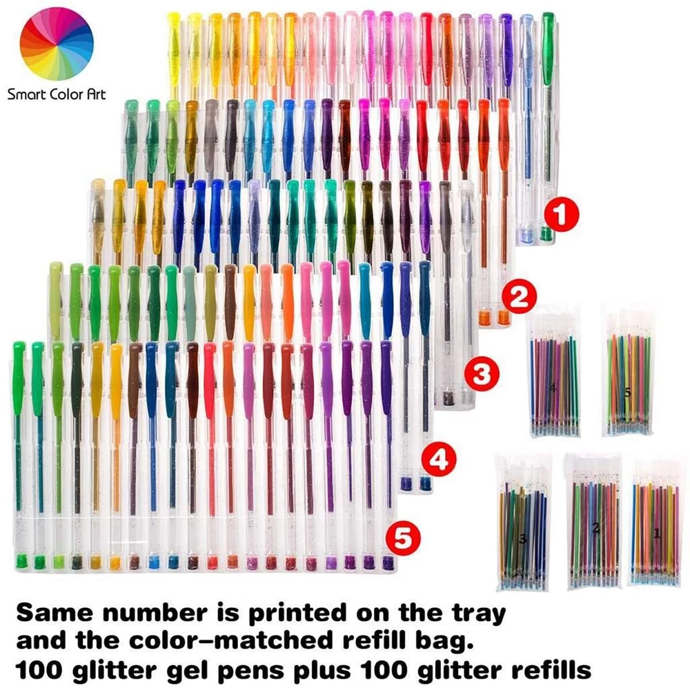 200 Pack Glitter Gel Pens Set, Smart Color Art 100 Colors Gel Pens with 100 Refills for Adult Coloring Books Drawing Painting Writing Smart Color Art 200 Pack Glitter Gel Pens Set includes 100 unique glitter gel pens and 100 glitter refills. Super smooth writing and long lasting. Ideal for kids and adults coloring, drawing and doodling. Packed in a see-through plastic case which is totally eco-friendly and exquisite. Acid-free and non-toxic, conforms to ASTM D-4236. Get it and Enjoy it!