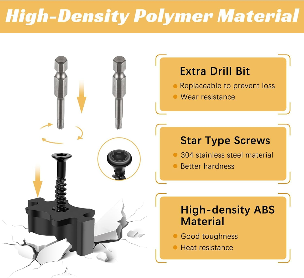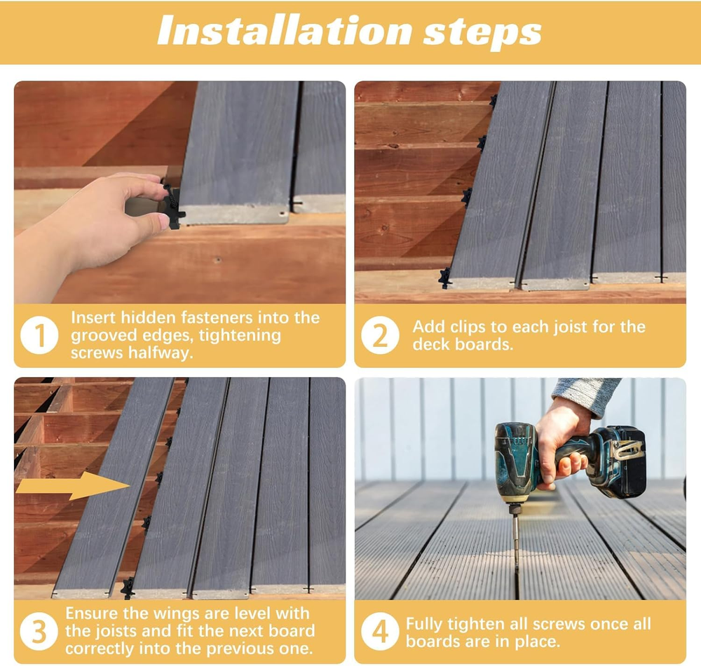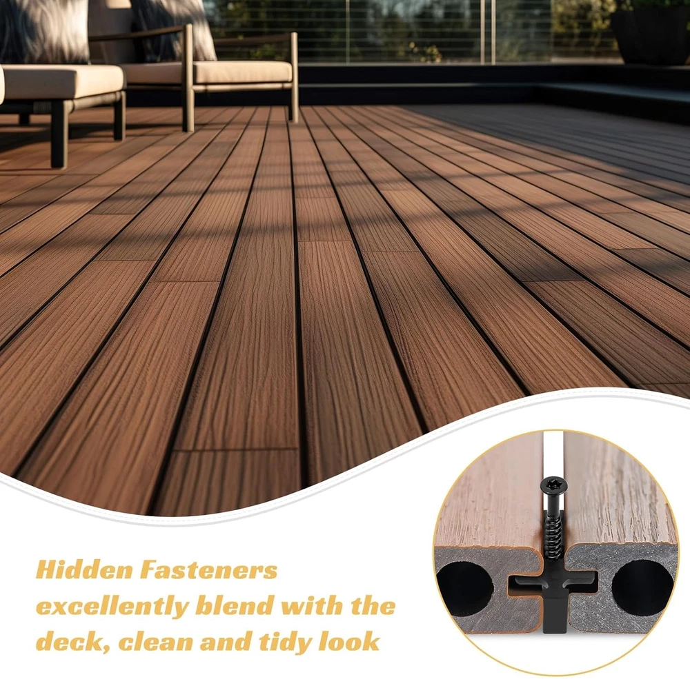 Match with Trex Board: Use our hidden fasteners to make your entire deck look clean and tidy. The fastener thickness is 3mm (0.125 inches) which matches most brands of edge groove composite, hardwood, wood decking, and composite decking. Premium Quality: Hidden fasteners are specially designed for easy installation of composite decks with grooves, making installation easier, and ensuring stability and reliability. Universal hidden deck fastener clips help create a compact and seamless finish, bringing you a nice user experience. Reliable to Use: Our hidden fasteners are made of high-density polymer material, durable and corrosion-resistant, ensuring long-term reliability in all weather conditions. The high strength and perfect toughness of composite decking clips provide a better fastening effect on the deck. Spare Parts Included: Hidden fasteners with each package include 100pcs of fastener clips with screws, and 2 driver bits, providing plenty of quantity for your use, replacement, and sharing demands, which can give you a nice shopping experience. Characteristic: Composite hideaway fastener's black-coated screw heads blend in with the deck providing a clean and screw-free effect for the deck, walk barefoot without worrying about being scratched. The consistent spacing and hidden installation, create a clean and tidy look for the deck. Easy to Install: Insert the hidden fasteners into the groove edges of the joist separately, and only tighten half of the screws. Then the next board fits into the previous board correctly. Fully tighten all the screws once all the boards are in place. Product Description Gyykzz Hidden Deck Fasteners, create a clean and polished finish that enhances the beauty of your outdoor spaces! Hidden Fasteners with High-Density Polymer Material Note: For manual measurement, please allow slight errors in size. The color may have a slight difference due to different screen displays. Easy Installation 1. Insert fasteners, tighten screws halfway. 2. Attach clips to each joist. 3. Align wings with joists, and fit the next board in place. 4. Fully tighten screws after all boards are installed. Hidden fasteners for a clean and tidy deck appearance Match most brands of edge groove composite ✔Deck fasteners match most brands, ensuring a clean and tidy look. ✔Premium quality for easy installation and stability. ✔Reliable and durable in all weather conditions. ✔Includes spare parts for convenience. ✔Screw heads blend in, creating a seamless deck surface. ✔Easy installation process for a secure finish. Material: High-Density Polymer Quantity: 100/200/500 Pack Size: 32x13x6 mm Thickness: 3mm(0.125 inch) Drive System: Star shape Match with Trex Decking Designed with a thickness of 3mm (0.125 inches), our fasteners are specifically engineered to effortlessly match the most popular brands of edge groove composite, hardwood, wood decking, and composite decking. Exceptional strength and perfect toughness Hidden fasteners are designed to securely hold the decking boards in place, preventing any movement or warping. Their high-density polymer material ensures optimal performance, even in the harshest weather conditions. Create a compact and seamless finish With their precise dimensions, our hidden deck fasteners effortlessly blend in with the overall structure of your deck, providing a seamless and visually appealing finish.