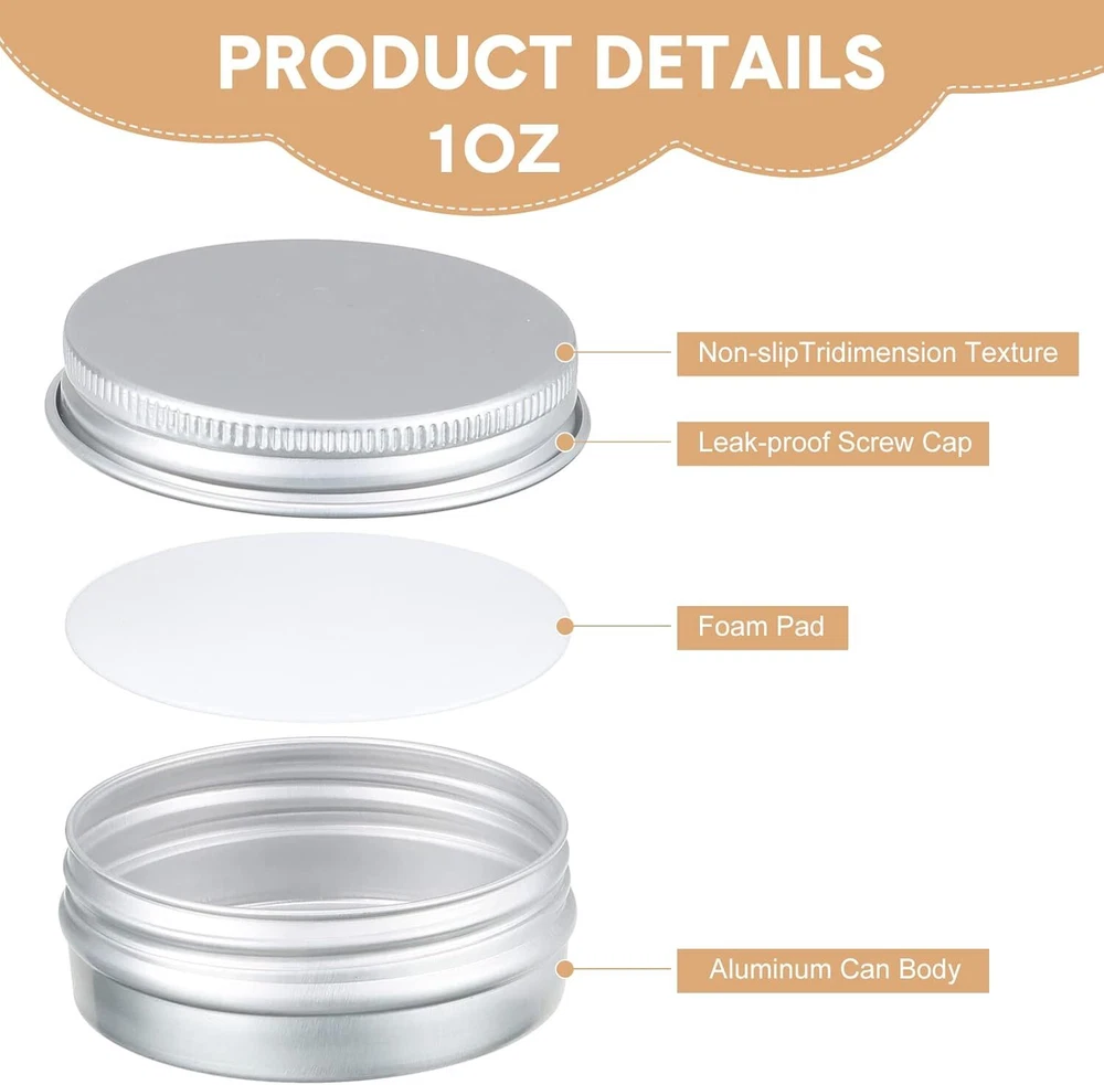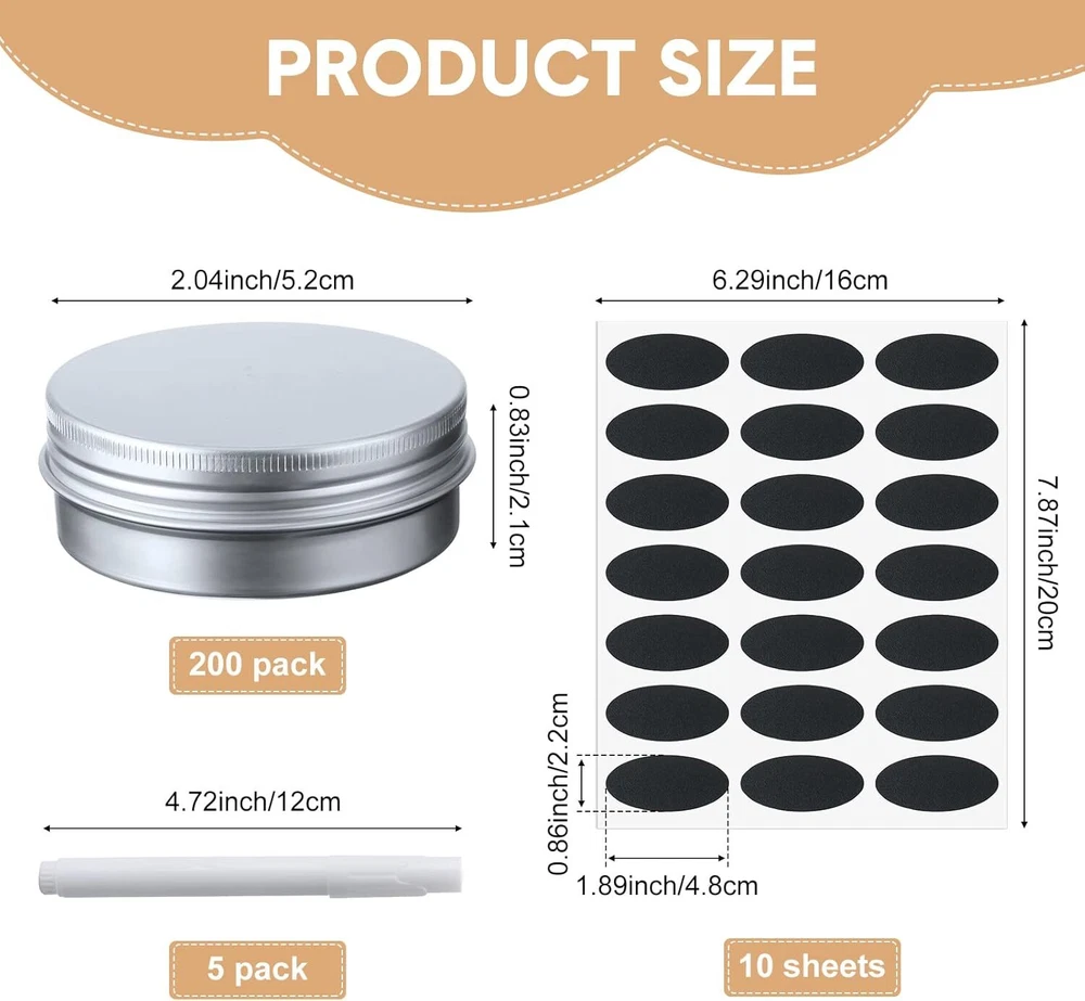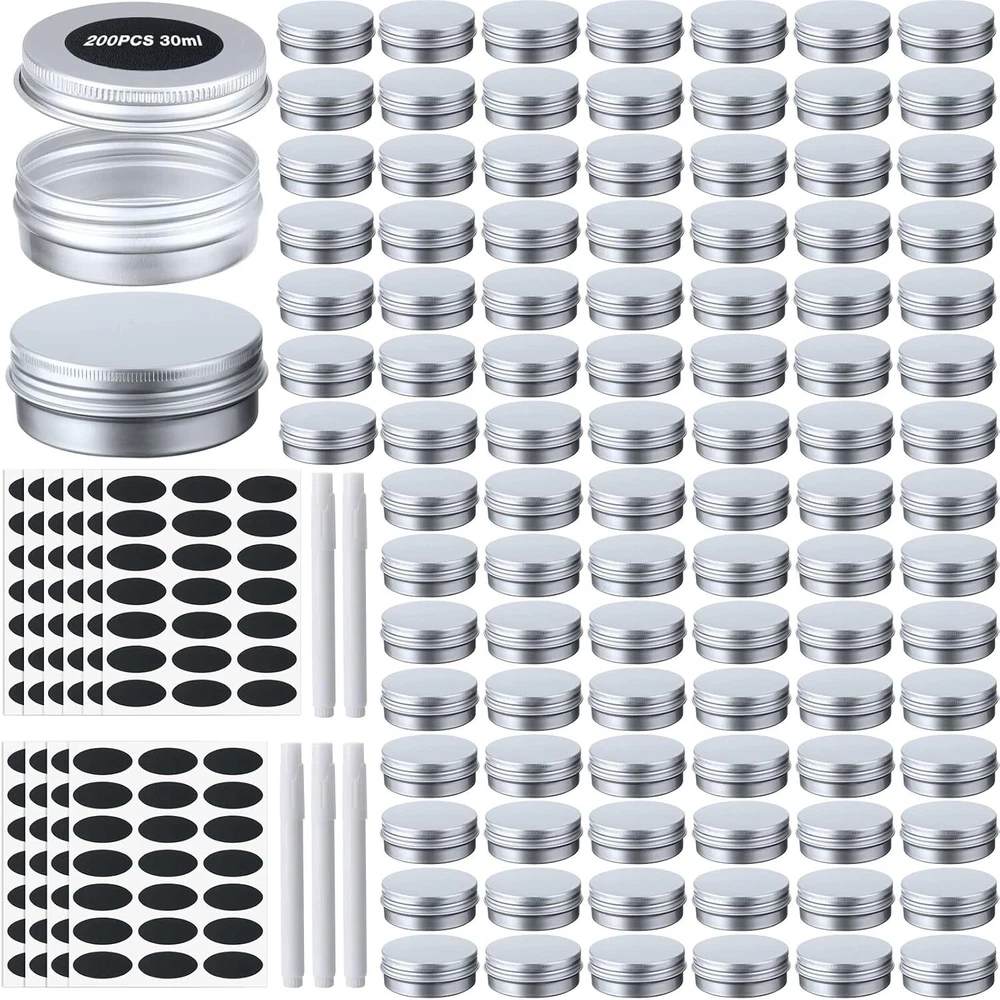 200 Pack Metal Tins Aluminum Containers with Lids Screw Top round Tin Cans for C What You Receive: you will get 200 pieces of screw top tins, 5 pieces of white markers, 210 pieces of black round labels, capacity of each metal can is 1 oz, practical to store many small items and the nice combination can better meet your daily using and replaceable needs; You can also share them with your family members or friends Quality Material: aluminum containers with lids is made of aluminum, sturdy, light and easy to carry; They have a smooth surface and a comfortable touch; It doesn't take up much space in your handbag, you can carry it with you on trips, business trips, camping, etc Screw Design: aluminum tin cans are round with screw top cover, easy to open and close, screw cover design can ensure that you easily tighten the lid, will not let the contents leak; What's more, the gasket inside the lid also increase sealing effect Elegant and Practical: the metal salve containers have small size with exquisite design, it has no pointed edges, all edges are round, you won't get scratched by it; These aluminum storage containers can organize many small items and help you stay away from clutter while easily carrying and storing them Wide Applications: 1 oz metal tins can be applied to store a variety of items such as keys, candy, hair rings, hair clips, hair ropes, necklaces, jewelry and more; It's portable and suitable for storing different items in bedroom, office, kitchen, living room, which makes your home cleaner and more tidy Shipping We offer FREE shipping on all orders! We ship within Three business days of payment, usually sooner. Local pickups and combined shipping options are not provided at this time. Return You can return a product for up to 30 days from the date you purchased it. Any product you return must be in the same condition you received it and in the original packaging. Please keep the receipt. Payment We accept payment by any of the following methods: PayPal Please pay as soon as possible after winning an auction, as that will allow us to post your item to you sooner! Feedback Customer satisfaction is very important to us. If you have any problem with your order, please contact us and we will do our best to make you satisfied. Contact Us If you have any queries, please contact us via ebay. We usually respond within 24 hours on weekdays. Please visit our eBay store to check out other items for sale! Thank you for shopping at our store.