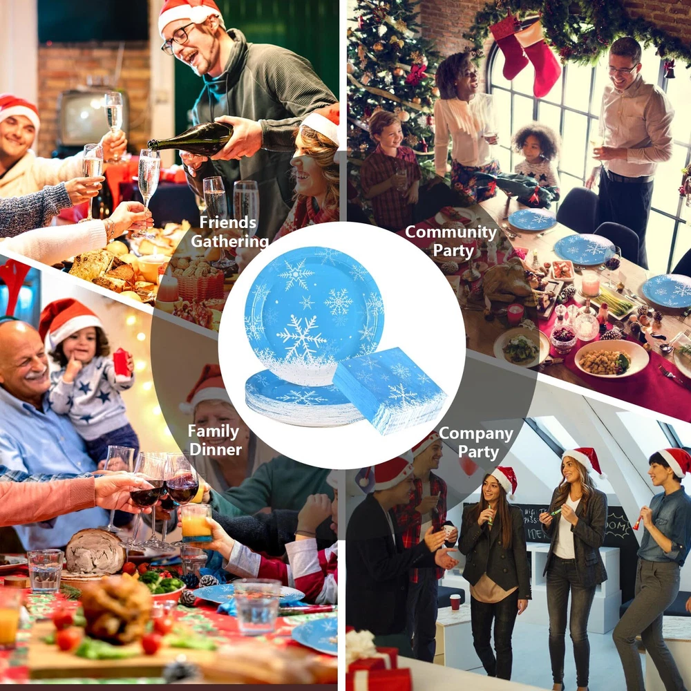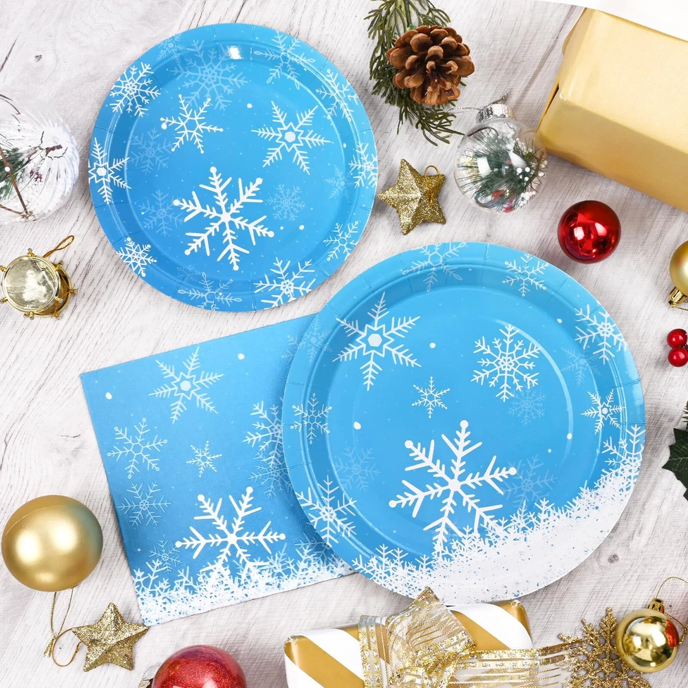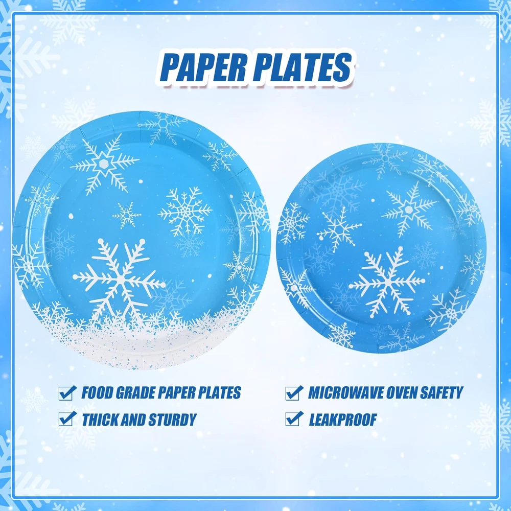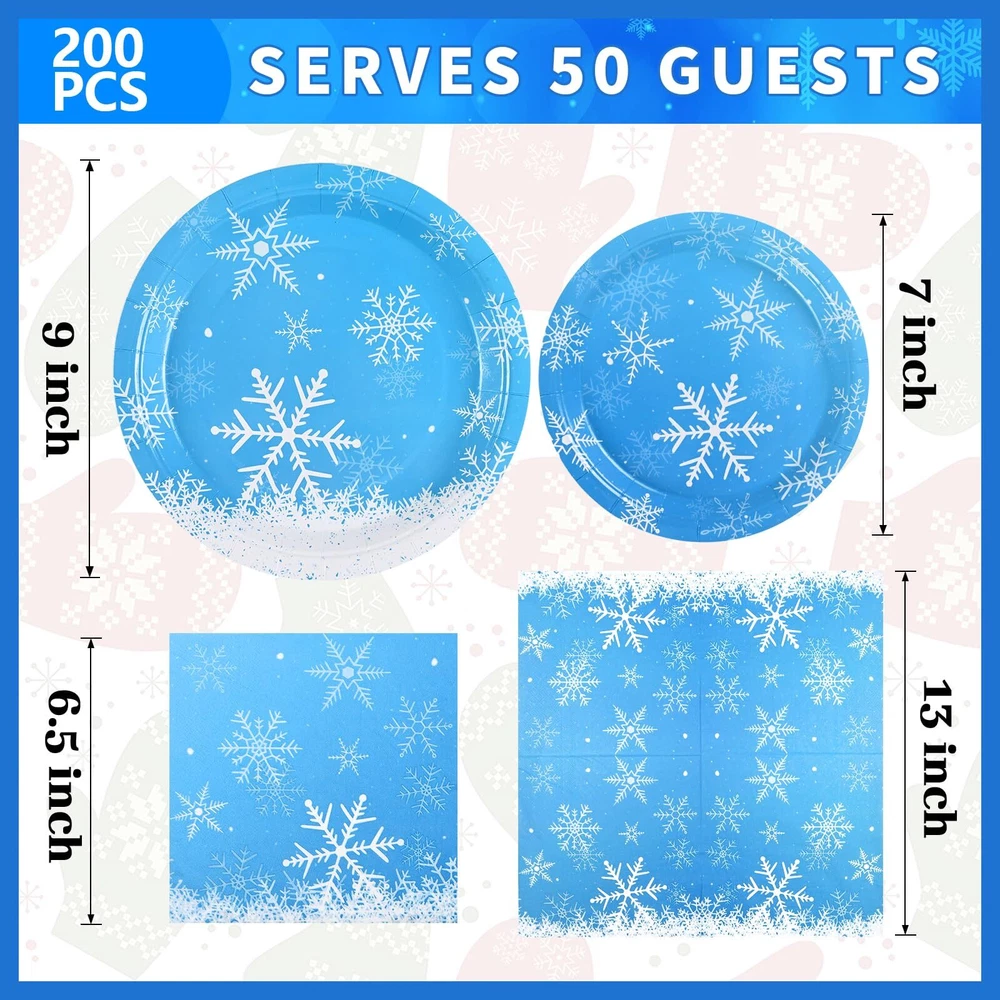 PAPER PLATES AND NAPKINS PARTY SUPPLIES: The beautiful Christmas plates and napkins will be a great decoration for Christmas gatherings. This Christmas plates and napkins set is ideal for any occasion and daily life. It suits for birthday, barbecues, wedding, Celebration, Christmas themed parties. SERVES 50 GUESTS: Our Christmas plates and napkins set comes with 50PCS of 9" dinner paper plates, 50PCS 7" paper dessert plates, 100PCS luncheon napkins (folded 6.5" x 6.5"). 200PCS disposable heavy duty plates and napkins sets ideal for Christmas party. CHRISTMAS Snowflake PATTERN: The blue Christmas disposable plates and napkins set is printed with Christmas Snowflake patterns.The Christmas plates and napkins will be the best Christmas table decoration. HIGH QUALITY: Thickened Christmas paper plates allow for holding various foods. Leakproof and microwave oven safety disposable plates fit every party. Highly absorbent & no crumbs Christmas dinner napkins will your good cleaning helper. DISPOSABLE & CONVENIENT: Do you worry about cleaning after every party? The disposable Christmas dinnerware set can be throwed directly inside the trash without washing.They will make your Christmas parties more relaxed and enjoyable.