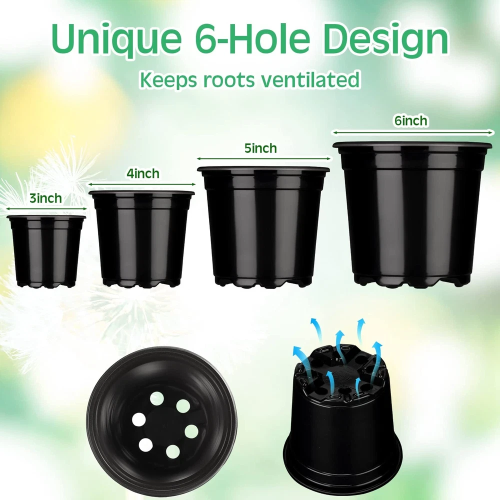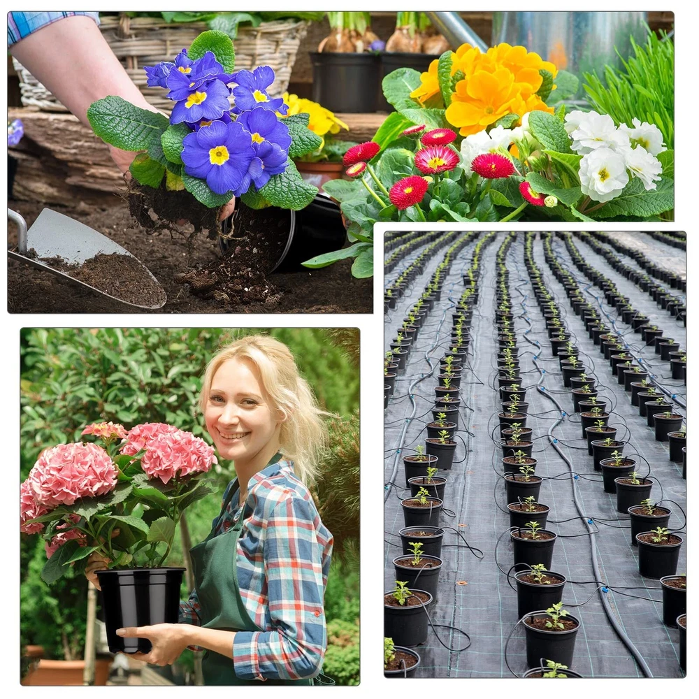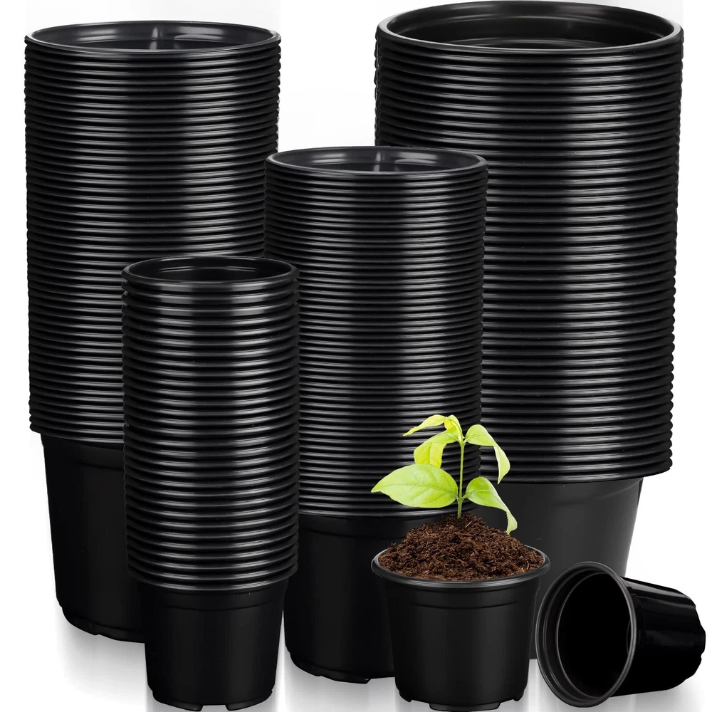 Description Features: Nice gifts: These nursery seedling pots are suitable for sending to your friends, colleagues, relatives, neighbours, family members and others who like planting and gardening, they will be happy to receive these gifts. Make your own garden: Our plastic potting containers are suitable for planting most small and medium sized plants, designed into black color, which can decorate your garden, office and room with plants and flowers. Specifications: Material: PP plastic Color: black Size: approx. 3 x 2.5 inches, 4 x 3.5 inches, 5 x 4.5 inches and 6 x 5.3 inches Package includes: 200 x Plastic nursery pots Notes: Manual measurement, please allow slight errors on size. The color may exist a slight difference due to different screen displays. Rich in Quantity: you will receive 200 pieces of plastic nursery pots in 4 different sizes, enough quantity and different size to meet your needs and replacements, and you can also share some with your friends and family members Reliable Material: these plant containers are made of PP material, reliable and reusable, sturdy and lightweight, not easy to break or fade, which can serve you for a long time and you can use them with confidence 4 Sizes to Choose: the planter nursery pots are designed into 4 different size, namely approx. 3 x 2.5 inches, 4 x 3.5 inches, 5 x 4.5 inches and 6 x 5.3 inches, 50 pieces of each size, you can choose your desired sizes according to your needs, suitable for seeding, cutting and transplanting Drainage Holes Design: these seed starter pots are designed with drainage holes in the bottom, which can help ventilate and drain, improving seed survival and preventing root rotting; The top edge is raised to make them easy to stack for storage Wide Range of Applications: the round plastic flower pots are practical and useful tools, which can be widely applied for planting vegetable, flowers, succulents, orchids, herbs, lilies and so on, suitable for placing in your garden, lawn, yard, patio, living room and other places you like