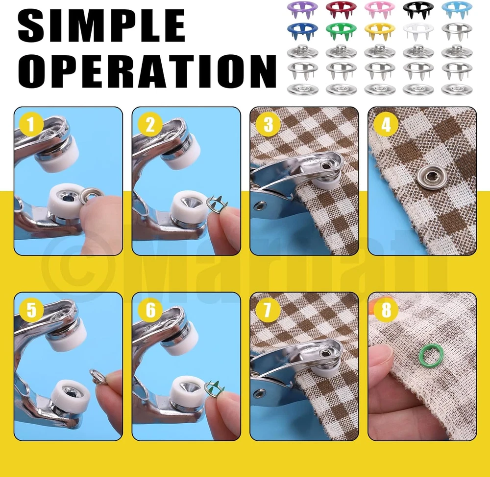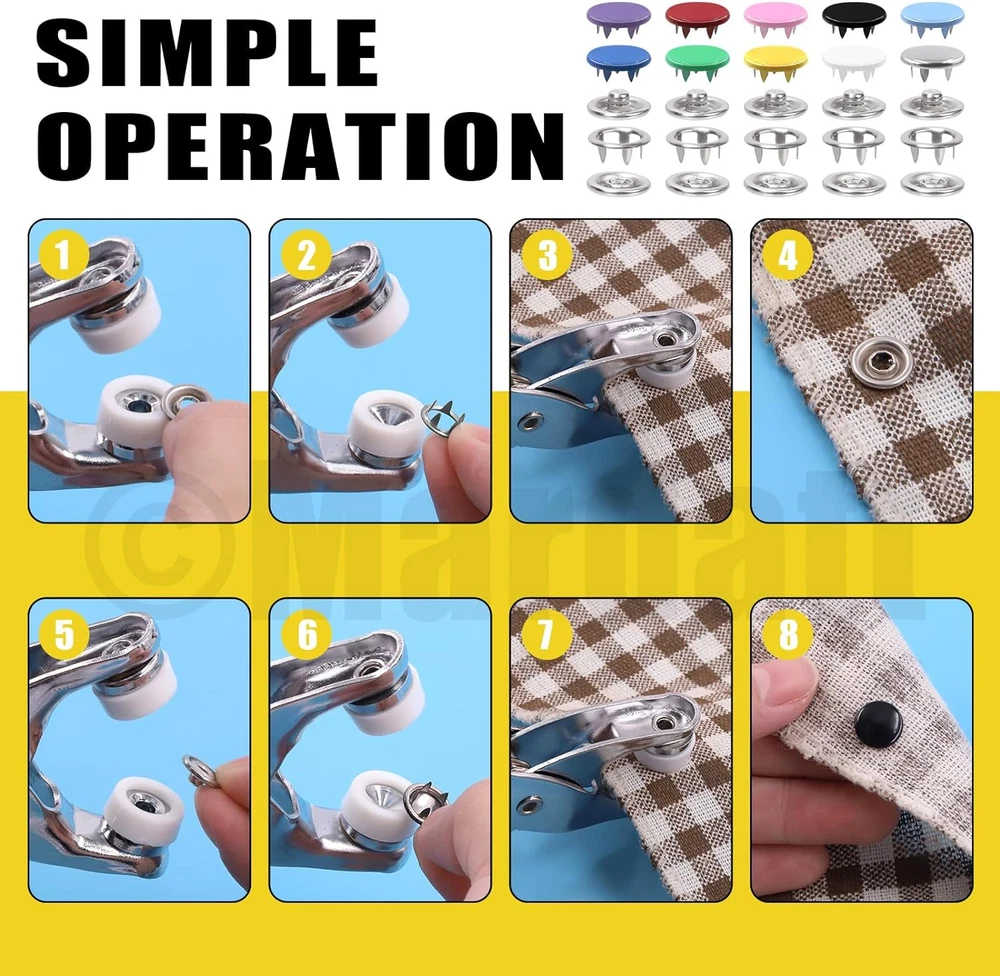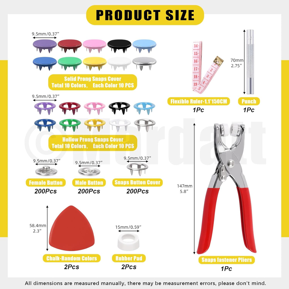 Store New Arrivals Add to Favorite View Feedback Contact 200 Sets Snap Fasteners Tool Kit Includes Hollow and Solid Metal Prong Snaps Buttons, Snaps Fasteners Pliers, Setting Tool and Ruler for DIY Leather Sewing Clothing(9.5Mm,10 Colors) Description Item model number M912 Style Hollow and Solid Snaps Buttons Color Multicolor Material Metal Country of Origin China Item Weight 1.02 pounds Head Style Button Model Name snapfastener Recommended Uses For Product Craft Product Dimensions 7.09"L x 6.69"W ✿【What You Will Get】In this kit, you will get 100 sets(400pcs) hollow snaps, 100 sets(400pcs) solid metal snaps, 2pcs spare rubber mats, 1pcs punching tool, 1pcs snap pliers, 2pcs sewing chalks and 1pc soft ruler, totally 807pcs. Each set of hollow/solid snaps consist of 1pcs male snap, 1pcs female snap and 2pcs hollow prong rings. All are packaged in a transparent plastic box for easy storage and carrying, avoiding mess and loss. The sufficient quantity can meet your daily using demands. ✿【High Quality Material】The snaps buttons are made of high quality copper material, rust proof and anti-corrosion, not easy to fade and deform, strong and durable. The snap pliers are made of high-quality aluminum body and feature a non-slip handle for comfort hold, easy to operate. ✿【Various Colors & Sizes】There are 10 different colors available for you: purple, red, pink, black, sky blue, blue, silver, green, yellow and white, which can meet your DIY button making of various colors of fabrics. Metal Snap size: approx. 6.5 mm/ 0.23" in inside diameter, 9.5 mm/ 0.35" in outside diameter, suitable for most crafts. ✿【Easy to Use】Just align the buttons on the pliers, place the clothes in the middle of the pliers opening, and then press the pliers down to make a pair of buttons. No need for hammer and drilling hole. These snap fasteners have five sharp corners on each prong, which can be securely fastened to ensure they do not fall off, so you can use it with confidence! ✿【Wide Application】The snap fasteners kit are widely used for DIY making clothes, such as cloth bags, quilt covers, backpacks, curtains, paper bags, pouch, bodysuit, shirts, raincoats and other household projects. You can also DIY snap button sewing kits with family or friends who enjoy handcrafting, exercise your hands-on skills, and have fun from DIY! Mardatt 807Pcs Snap Fasteners Tool Kit Includes Hollow and Solid Metal Prong Snaps Buttons, Snaps Fasteners Pliers, Setting Tool and Ruler for DIY Leather Sewing Clothing(9.5mm,10 Colors) Specifications: ➹Product Type: Snap Fasteners Tool Kit ➹Material: Copper ➹Size: Snap Buttons: 9.5 mm/0.37" in OD Please refer to the second picture for specific dimensions. ➹Color: purple, red, pink, black, sky blue, blue, silver, green, yellow, white ➹Quantity: 807Pcs ❥How to Use? ①Determine the positive and negative positions of the buttons on the pliers. Put the male and female snaps on the upper side of the pliers with holes. Place the prong rings on the underside of the pliers (no hole). ②Press the handle. ③Insert a colored hollow claw ring and a male buckle into the pliers. ④You can use the bar to hit it, prevent the buckle from loosening. Work done! ❥Why Choose Us? ★Premium Quality: The snap fasteners kit are made of high quality copper with solid construction, not easy to fade and break, long service time. ★Stable Structure: The snaps buttons feature five sharp corners, which can make the snap steady, not easy to fall off. ★Wide Application: Suitable for DIY crafts, cotton, clothing, backpacks, shirts, shoes, skirt and other sewing items. Suitable for women, professional or novice tailors. ❥Package Includes: 400Pcs/100 Sets x Hollow Metal Snap Buttons(10 colors, 10 sets of each color) 400Pcs/100 Sets x Solid Metal Snap Buttons(10 colors, 10 sets of each color) 1Pcs x Snap Fastener Pliers 2Pcs x Spare Rubber 2Pcs x Sewing Chalks 1Pcs x Punching Tool 1Pcs x Ruler Totally 807Pcs. ABOUT US We offer the best prices around on high quality products. Our E-store includes media such as books, movies, music and games while offering electronics, toys, sporting apparel, clothing, tools, general home, garden items and more. SHIPPING We are always working hard to ensure your package arrives as soon as possible. Please understand that some factors like weather, high postal traffic, and the performance of shipping companies are outside of our control. We offer free shipping to the lower 48 states and ship within 2 business days of payment, usually sooner. We do not accept P.O. Boxes. Please provide a physical address. RETURNS We offer a 30-Day Return Policy on items which you are not completely satisfied with. You have the option for a full-refund or an exchange of the item. No returns are available on items shipped outside of the USA. PAYMENT We accept PayPal. CONTACT US This page content is yet to come Please ad us to your favorite seller and visit again later Thank You CUSTOMER SATISFACTION We try our very best to make sure every customer is completely satisfied. If there's a problem, message us! We're happy to help.