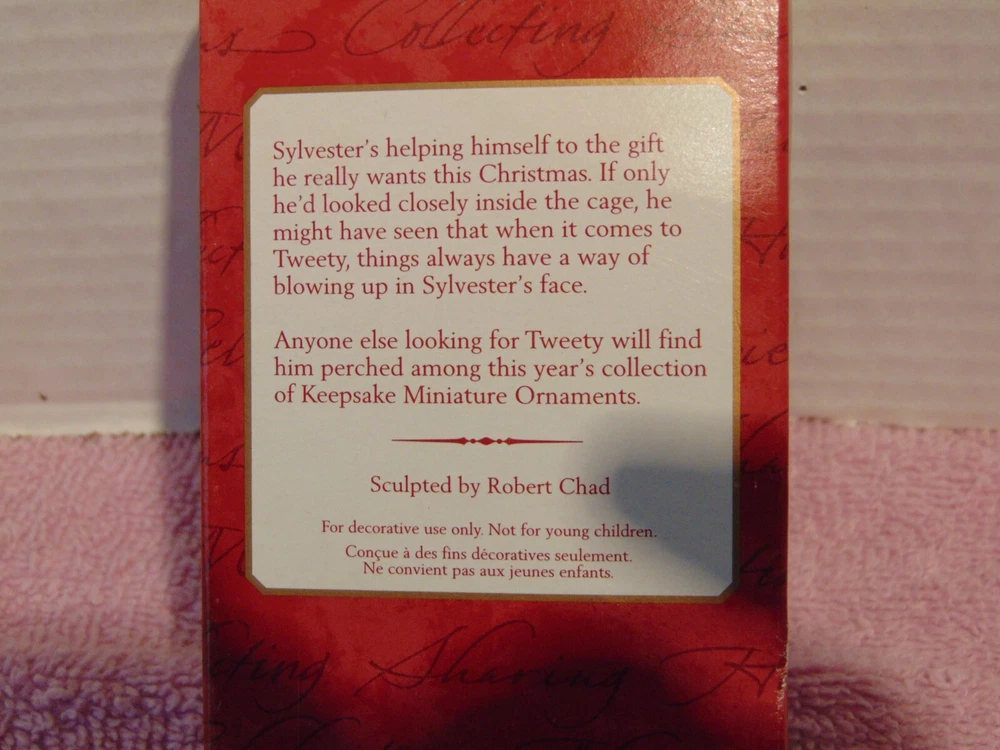 Subject: Cat Recipient: Father Color: Multicolor Collection: Ornaments Original/Licensed Reproduction: Original UPC: 0015012595116 GTIN: 0015012595116 gtin13: 0015012595116 Character: Tweety, Tweety Bird, Sylvester Brand: Hallmark Item Weight: 5 oz Antique: No Age Level: Over 18 Years Material: Mixed Materials, Resin, Plastic, Acrylic Occasion: Christmas Time Period Manufactured: 2000-2009 Vintage: No Pattern: No Pattern Size: Medium Type: Ornament Features: Standing, Artist Designed, Musical, Hanging, Vintage, Metallic, Handmade, Decorative, Attached Items, Animated, Retro Design Theme: Christmas Shape: Animal Franchise: Looney Tunes Handmade: No Item Height: 4 in Year Manufactured: 2000