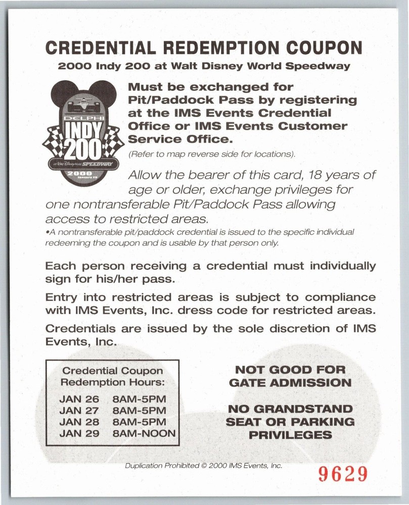 Welcome to my listing for: 2000 Indy 200 Walt Disney World Speedway Credential Redemption Coupon Card This was part of the large well cared for Charlie Walker collection. Charlie was very active in the Indianapolis community. One of his main passions was the track - which was where you would find him through the entire month of May. Charlie served at IMS for over 55 years with the legendary Tom Carnegie on the Public-Address team before retiring in 2014. Mr. Walker passed in 2018. On light card stock. Unused. NOS. Showing barely any signs of wear or handling consistent with its age. No tears, creases, separations, tears, stains, folds, indents or loss. Colors are vibrant. Clean. I have a few of these - all in identical very good condition as the example in the photos. It measures approx. 4" x 5" Click HERE to see other tickets that I have available here on eBay. Click HERE to see all other Indy 500 items that I have available here on eBay. This will ship securely in a rigid mailer or box via USPS First Class mail service with a tracking number. The shipping cost for the first purchase is $4.00 and no extra cost for additional lapel pins, tokens, tickets, sheet music, stock certificate or letterhead purchases shipped in the same package. Please contact me if you are buying multiple items over more than one day. I have over 21,000 unique items here on eBay - Click HERE to visit my eBay store & save with combined shipping for multiple buys: When possible, use the "add to cart" feature to select multiple items and before paying, use the "request an invoice" option before paying so I can combine and lower shipping costs. I have enjoyed buying and selling great looking vintage quality collectibles for over 40 years. I hope that you enjoy them as much as I have while owning them. Unless noted otherwise, all items I offer here on eBay are original and are not reproductions. Please have a look the provided photos for condition as they are part of the item description and contact me with any questions BEFORE bidding or making a purchase. All items are securely packed and are shipped mostly via USPS. Please rely on my near 23+ yr. 4,200+ 99.9% feedback rating as a guide to your buying decision. I hope that all is well with you and your family and thanks for stopping by! - Jerry