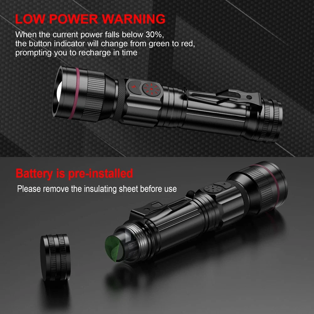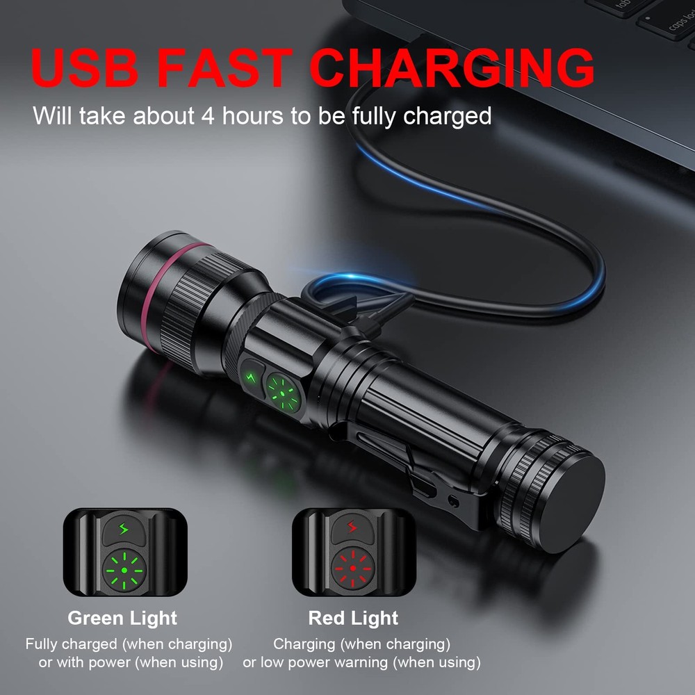 Dual Switch Design & Power Indicator: These flashlights have 2 switches to control 5 light modes, much more convenient. One of the rechargeable flashlight switches is specially designed for emergencies.(Just one-click to strobe, keep you always safe in emergency.) This flashlight has an intelligent low battery warning function to remind you to charge it. When the power is less than 30%, the indicator will turn from green to red. Power indicator will also help you better master charging status Ultra Bright Rechargeable Flashlights: With the upgraded powerful LED chip, the high-lumen tactical flashlight delivers up to 2000 lumens(max). Its ultra-bright beam effortlessly illuminates an entire backyard. Easily zoomable from wide to narrow beam. Also with a pocket-clip for portable carry. It is small & compact enough to fit in your hands, pocket or backpack allowing for easy storage and quick access USB Rechargeable & Long-lasting: You don’t need to be busy replacing batteries constantly, very handy rechargeable flashlight and built-in 2000mAh Large-capacity rechargeable battery, the led flashlight only takes about 4 hours to fully recharge with overcharge protection. A single charge can provide up to 12 hours of continuous runtime in low mode and 3 hours in high mode Reliable & Waterproof: With a solid aluminum built and 3-layers of USB port waterproof protective cover design. Never worry about using the flash light in heavy rain, snow or other extreme weather. Perfect flashlight for use around the house, dog walking, or camping Great Value & 100% Satisfaction: A great gift idea for both men and women. Includes 2 x rechargeable flashlights, 2 x Rechargeable Battery, 2 x USB Cable,1 x User Manual. 90 days money back & 1 years . Friendly . Buy with confidence
