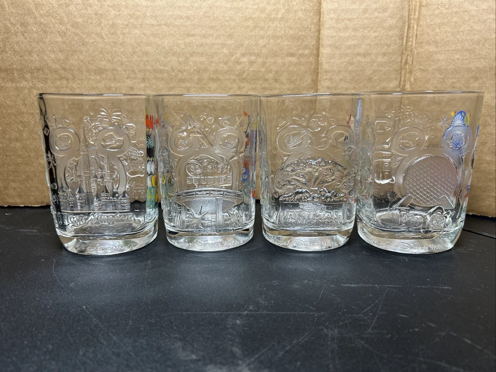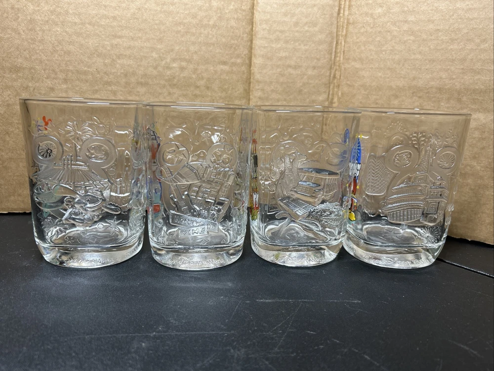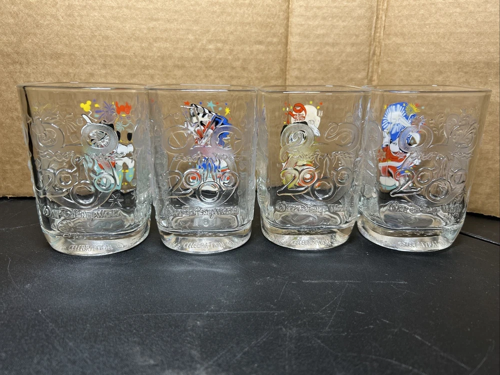 2000 McDonald's Walt Disney World Mickey Mouse Glass Cups/Tumblers -- Set of 4 This set of four glass cups/tumblers is a must-have for any Disney fan. Featuring the iconic Mickey Mouse, these cups were manufactured in France and are a perfect addition to any Disneyana collection. With a height of 4 1/2" and a width of around 3", these glasses are the perfect size for enjoying your favorite beverage. Perfect for collectors or as a gift for any Disney lover, these glasses are sure to bring a touch of magic to your day. These glasses have no chips or cracks and the graphics are in great condition. Please view all photos.