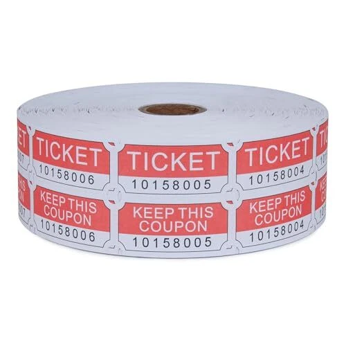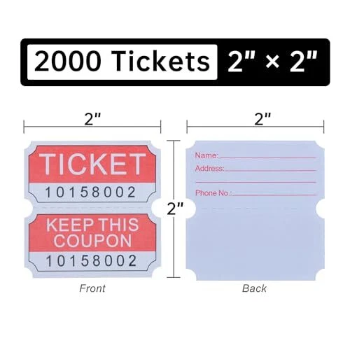 Add some excitement to your party or social event with this Double Roll of Raffle Tickets. Our consecutively numbered double tickets include 2000 tickets per roll and each ticket has a tear-off ticket stub. Our roll of tickets are perfect for raffles, fair and carnival games, school dances, prize drawings, admission tickets, and more. SIZE AND COUNT:2000 Pairs of 2” x 2” double tickets, each pair with a deposit ticket and keep ticket, and split into 2” x 1” halves-red CONSECUTIVE NUMBERS:consecutive numbers are printed in edge of raffle tickets,which avoid fake tickets sneak into these tickets and make counting more efficient. EASY TO TEAR:There are perforated lines between raffle tickes,so that it's very easy to tear apart. EASY TO WRITE:Name/Address/City/Phone can be filled in the back of raffle tickets which be printed "TICKET".These raffle tickets include deposit tickets and keep tickets. SCENARIOS:These raffle tickets are great for 50/50 raffles,giveaways,fair,carnivals,drawings,door prizes,events,trade shows and so on.