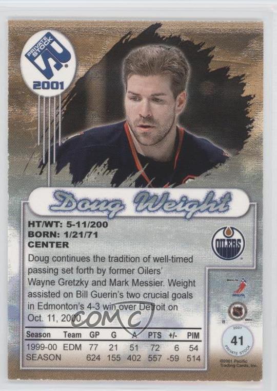 2000-01 Pacific Private Stock - [Base] - Retail #41 Doug Weight - Ice Hockey Card - Featuring the Edmonton Oilers - Featuring Doug Weight Search for more: 2000-01 Pacific Private Stock Search for more: 2000-01 Pacific Private Stock - [Base] - Retail View all of our Listings Auctions Buy It Now About Us Located in the beautiful Pacific Northwest, COMC (Check Out My Cards) is the world's largest consignment service for trading card singles. More than 10,000 people have used our consignment service to list over 50 million trading cards. Find out how we can help you consign your items on eBay by contacting us through eBay messaging. COMC -- "The Safe & Easy Way to Buy & Sell" Representative Image - Select Specific Item above to see image of actual item Representative Image - Select Specific Item above to see image of actual item Raw Condition for Modern Cards Unless otherwise noted, raw modern cards are listed in Near Mint-Mint condition or better. A NM-MT card appears to be Mint at first glance, but upon closer inspection, may exhibit some of the following: minor print defects (e.g. roller marks, print line, dimple), minor scratches, slight edge wear, and slight corner wear. Centering is clearly visible in the images provided and does not factor into our condition assessment. Raw Condition for Vintage Cards Unless otherwise noted, raw vintage cards are listed in Excellent condition or better. An EX card may exhibit some of the following: minor rounding of corners, surface wear, print defects, light scratches, and slight edge wear/chipping. Centering is clearly visible in the images provided and does not factor into our condition assessment. Domestic Shipping Combined shipping for multiple items is available. To receive combined shipping, please ensure all desired items are in your eBay shopping cart before proceeding to checkout. eBay limits orders to 40 items per order. We automatically combine multiple orders placed on the same day. If you place multiple orders on the same day, please contact us to request a refund of applicable shipping costs. Signature confirmation may be required on invoices over $400. All cards are protected and shipped securely. International Shipping COMC offers eBay's International Shipping (EIS) for international orders under $2,500* (see country exceptions below). All duties and import fees are paid at checkout; in the rare event that there are additional import fees upon delivery, these are borne by the buyer. EIS packages route through a shipping hub in Erlanger, KY before shipping to their final destination. Please note that EIS does not allow for combined shipments. The shipping rates are determined by eBay and cannot be adjusted. *Maximum sale price exceptions: Colombia, Kuwait ($2,000); Taiwan ($1,539); Chile, Costa Rica, Guatemala, Honduras, Trinidad and Tobago ($1,000); Antigua and Barbuda, Aruba, Belize, Dominica, Grenada, Philippines, Saint Kitts and Nevis, Saint Lucia, Montserrat, Turks and Caicos Islands ($500); Dominican Republic, El Salvador ($200). Please request a shipping quote through eBay messaging for orders that exceed the maximum sale price supported by eBay's International Shipping. You will be responsible for all duties and import fees for international orders shipped outside the EIS. All cards are protected and shipped securely. Payment COMC does not accept offers on our cards through our eBay storefront. COMC utilizes eBay’s managed payments system. If you are experiencing difficulties making a payment, please contact eBay for assistance. Return Policy Returns are only accepted on the rare occasion the item is not as described. If you are making a return, please initiate the return process through eBay so a mailing label can be provided for you. Prior to listing, our expert team carefully assessed this item to represent it accurately. Please review the description and high-definition images prior to purchasing to ensure this item meets your satisfaction. We welcome you to contact us if you have further questions about this item. Trust and Integrity COMC carefully assesses each item consigned to us to prevent fraudulent items from entering the marketplace. If you believe an item offered on COMC may be fraudulent, please contact us with details so we can investigate the issue. Items we determine are outside our supported items policy may be removed. Last Modified: 3/1/2025 6:30:02 PM PDT