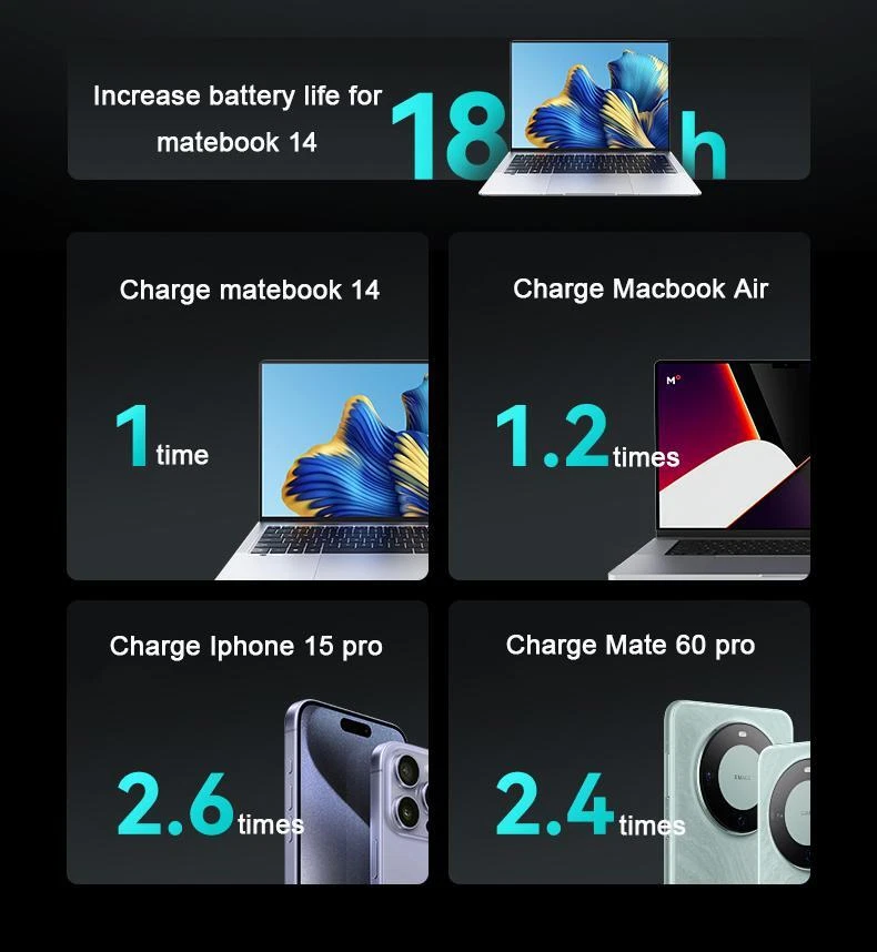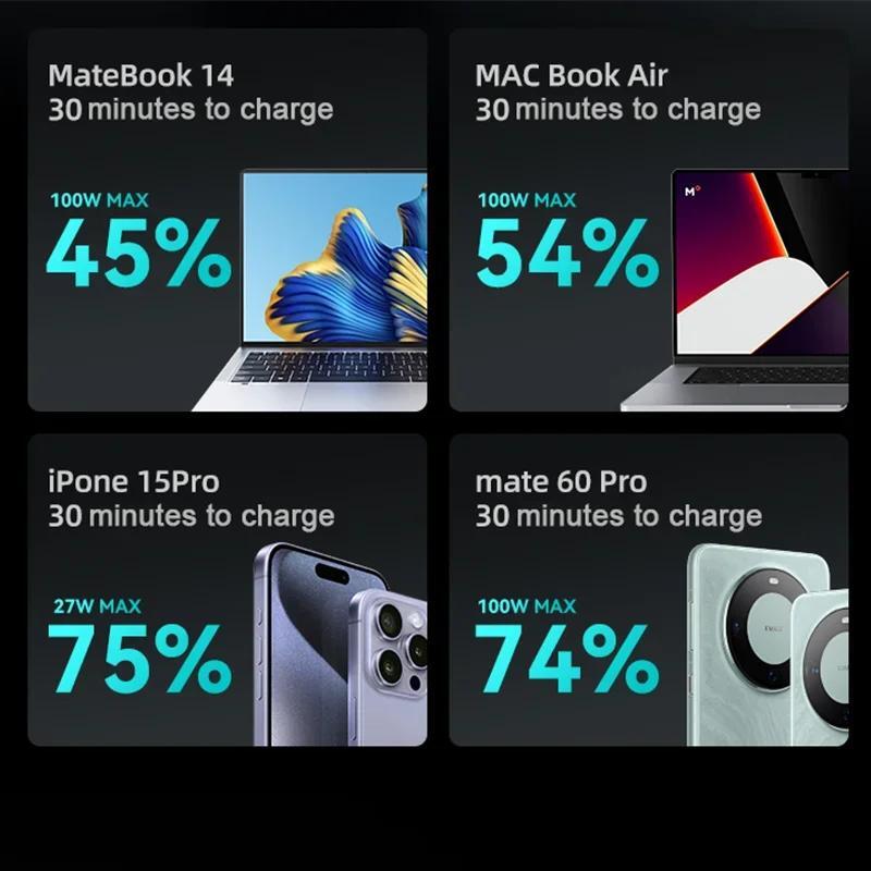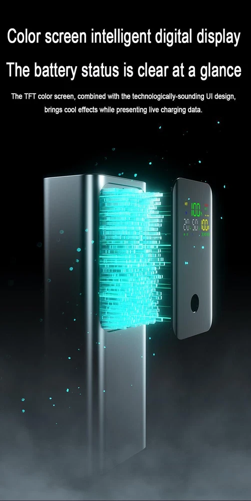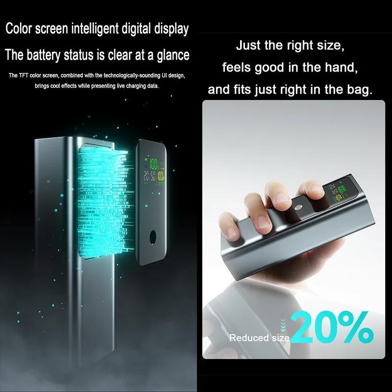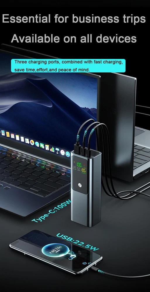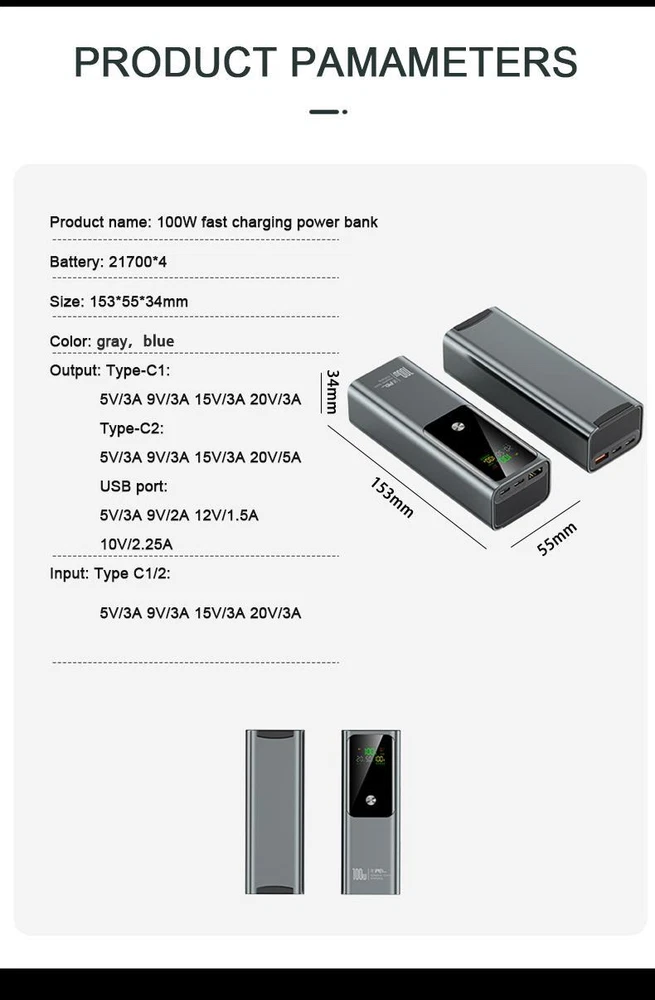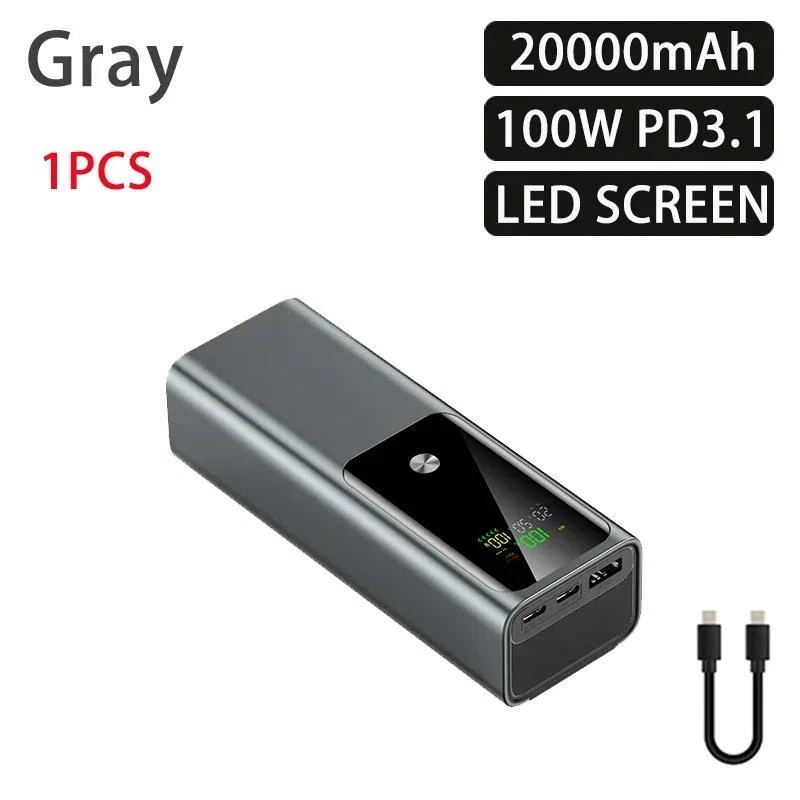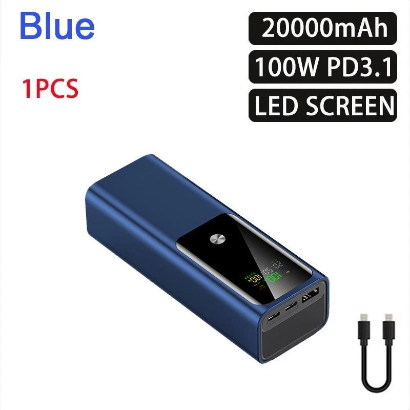 Ranwomen Powerbank 20000mAh 100W PD3.1 2PCS Battery Portable Bidirectional Fast Charging For Laptop Tablet Phone Apple Samsung Color:Gray,Blue Fast charging protocol:PD QC FCP SCP AFC UFCS and other Battery capacity:20000mAh(21700 specification lithium battery*4) The power level of the power bank is closely related to the temperature, the cable used, and the device being charged. Maximum output power:100W(PD3.1) Supported devices: mainstream laptops (USB-C charging), smartphones, tablets, mainstream electronic devices Screen material:LED Size:153*55*34mm Output: Type-C1: 5V/3A 9V.3A 15V/3A 20V/3A Type-C2: 5V/3A 9V/3A 15V/3A 20V/5A USB port: 5V/3A 9V12A 12V/1.5A 10V/2.25A Input: Type C1/2: 5V/3A 9V/3A 15V/3A 20V/3A Weight: 421 grams/ (power bank only) Highlight: *100W Total output,equipped with Dual USB-C and one USD-A port,quickly charge a laptop at 100W for maximun effciency *Smart LED display,track power levels and charging status at a glance. *Lightweight body, easy to carry. Package Include 1*20000mAh Powerbank 1*Fast charging cable 1*Manual 100w PD 3.1 Super fast charging LED display, intelligent temperature control 100W Bidirectional charging, fast charging 100W PD3.1 Fast charging,Intelligent power adjustment, suitable for most devices 20,000 mAh large battery with high battery density to ensure continuous output 421(laboratory data, not representative of final weight), small and lightweight, easy to carry LED screen intelligent display, charging data is clear at a glance Product specific data