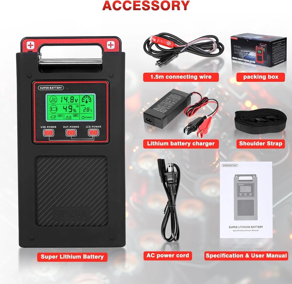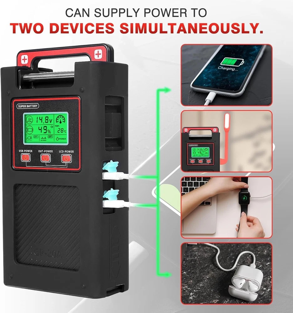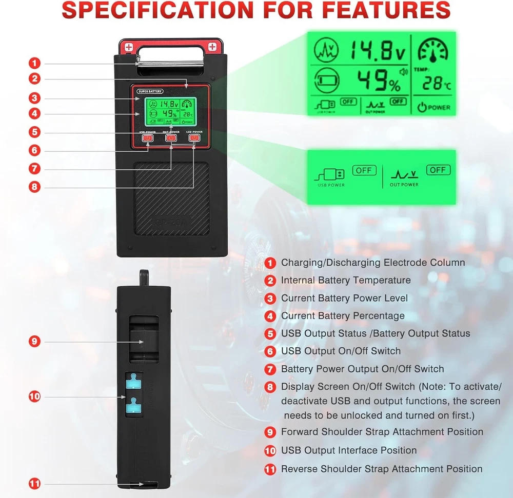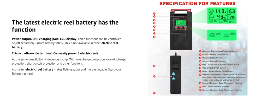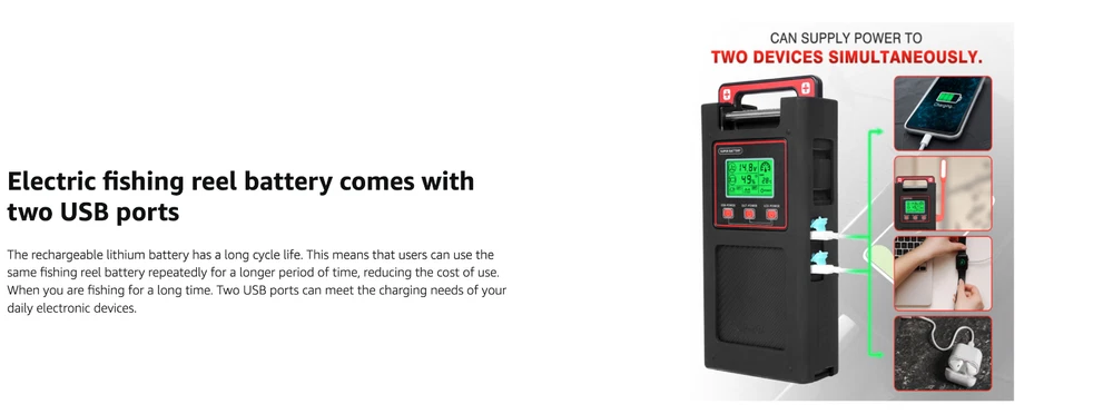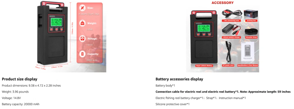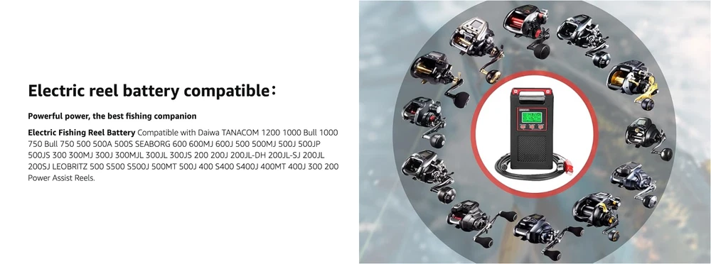 Compatible with Daiwa TANACOM 1200 1000 Bull 1000 750 Bull 750 500 500A 500S SEABORG 600 600MJ 600J 500 500MJ 500J 500JP 500JS 300 300MJ 300J 300MJL 300JL 300JS 200 200J 200JL-DH 200JL-SJ 200JL 200SJ LEOBRITZ 500 S500 S500J 500MT 500J 400 S400 S400J 400MT 400J 300 200 Power Assist Reels. Smarter electric reel battery. Rated voltage 14.8V 20000 mAh. Overall size: 9.38 inches * 4.72 inches * 2.28 inches. Weight approx.: 3.96 lbs. Comes with a shoulder strap. Easy to carry The battery contains a 59.05-inch electric fishing reel connection line. Power output. USB charging port. LCD display. Three modes can be controlled on/off individually. The smarter electric fishing reel battery makes fishing easier and more enjoyable. Two USB ports. Can power two electronic devices at the same time. The extra wide 2.75-inch rust-proof terminals can power up to 3 electric reels simultaneously. Built-in independent IC control chip with over-current protection, over-voltage protection, short-circuit protection, and temperature protection. Each product is strictly inspected by the factory quality control department before it is delivered to you. Buyer pays actual USPS shipping cost.