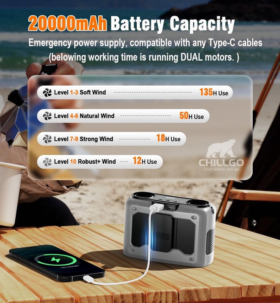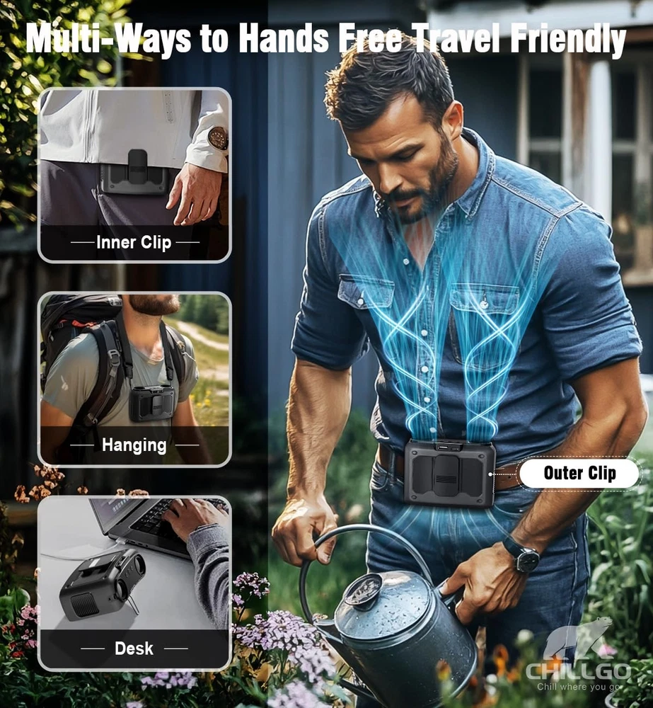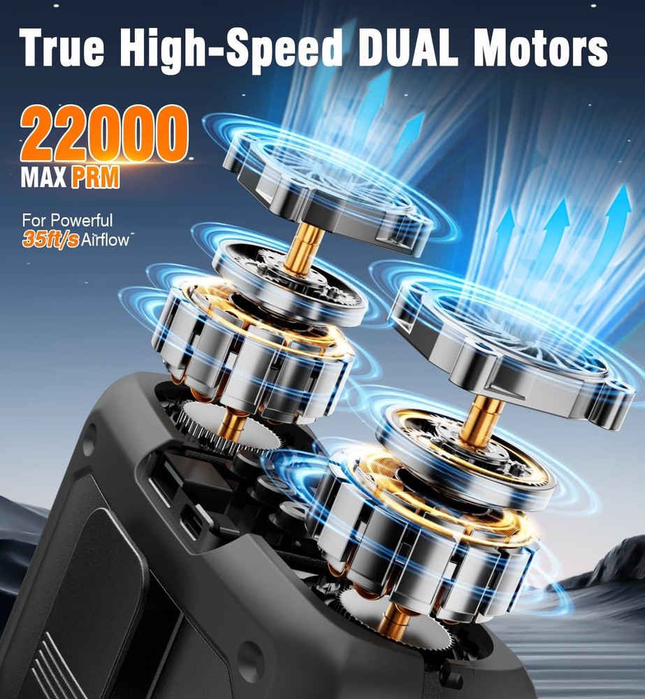 Introducing our 5-in-1 Dual Motor Fan, designed for ultimate cooling comfort! Powered by strong dual motors, it delivers 2-4X faster wind speed, ensuring a refreshing breeze like never before. The innovative airflow channel, with a bottom air inlet and top outlet, provides smooth, superior wind feel for an exceptional experience. Thanks to quick charge technology and a large battery, enjoy long-lasting power without frequent recharges. The high-quality silicone guard offers robust protection against drops and shocks, ensuring durability. This portable, multi-functional fan clips to your waist, hangs around your neck, or is held in your hand, adapting to your needs. It even supports reverse charging in emergencies! With elegant packaging, a detachable strap, charging cable, and detailed guide, it's perfect as a gift or personal use. Experience the perfect blend of style, functionality, and convenience with this must-have portable fan! Dual Motors, Strong Breeze - Powerful dual motors, this portable waist fan significantly enhanced wind speed: Powered by dual motors, this fan is durable. With an upgraded airflow channel, the wind speed can reach 2 - 4 times stronger, providing a more refreshing experience