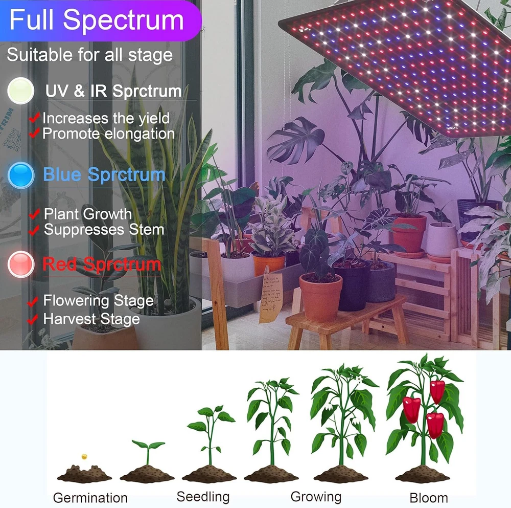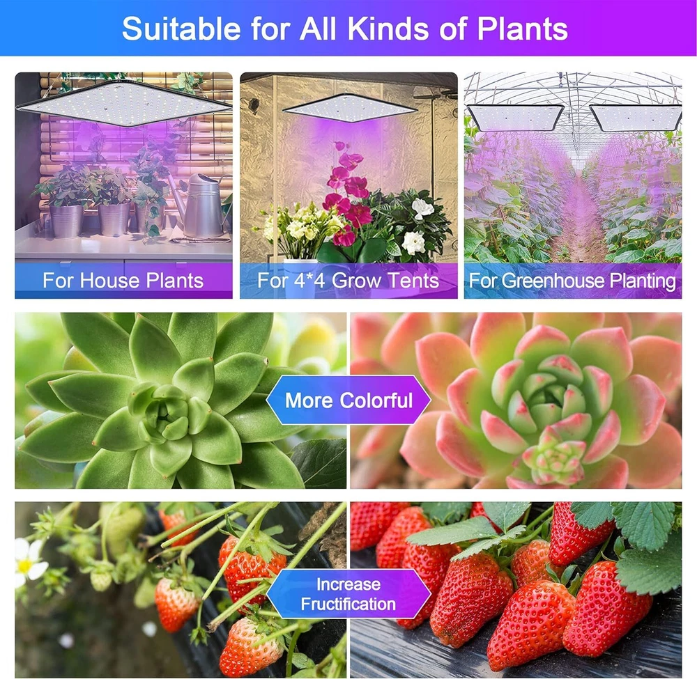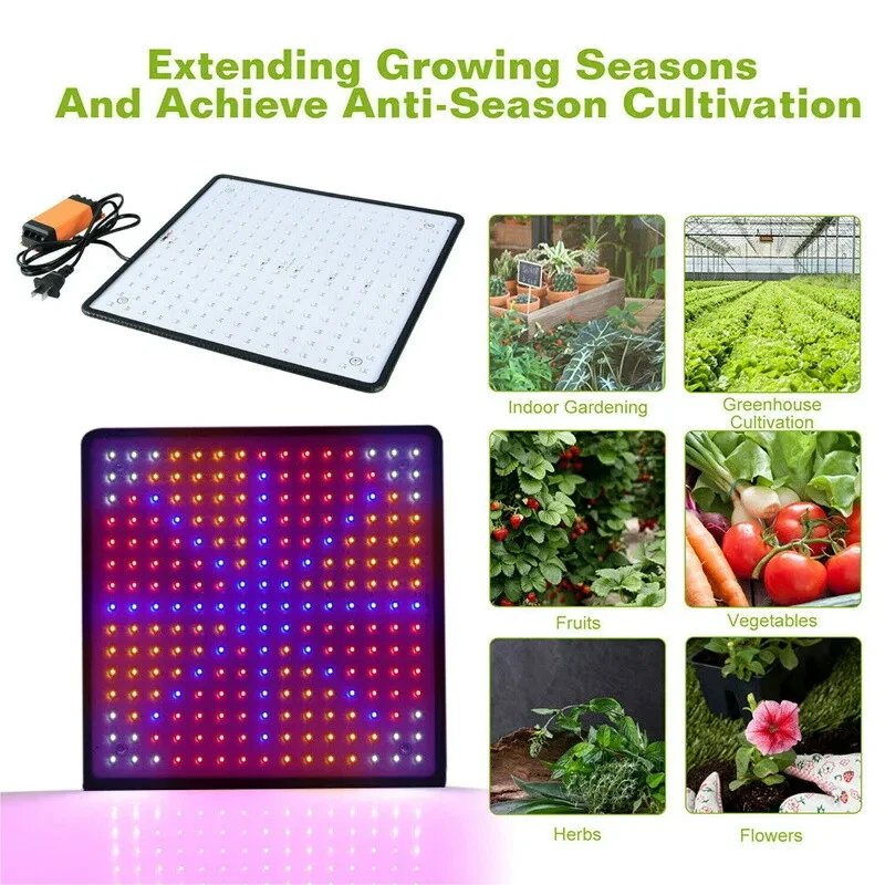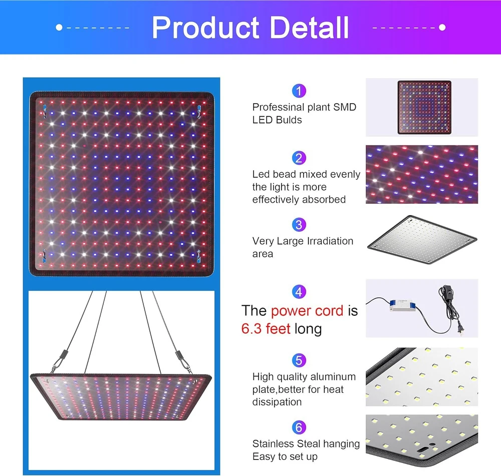 Product Description: Introduc tions : This LED Plant Growth Lamp is good for personal growers. If you want better growing result, please turn to this LED grow light. By providing extra light, it won't let your plants stop growing during night. The reasonably designed color of the light beam and wavelength will dramatically stimulate growing, while the consumption is very low. Made with premium material and fine workmanship, it is lightweight and durable! Trust us! Feat ures : 1. Low heat 2. High intensity LED chips, energy saving 3. Effective light spectrum brings proper wavelength that are beneficial to plants 4. Quality heat sinks and built-in cooling fans to solve heat problem 5. Zener protection to make sure that one out led will not affect the others 6. Good for seedling, germination, growing stage and blooming stage 7. Can be used to grow houseplants, vegetables, lettuce, tomatoes and herbs 8. Perfect for green house Specifications: Number of light: Red 77pcs / Blue 47pcs / Orange 7pcs / White 27pcs Power Factor: >97% Recommended Coverage: One panel per 21.5 to 32.3 square feet Lifespan: >50,000hours Worldwide Voltage: 85v-240v Working Frequency: 50~60Hz Material: Iron & Acrylic Color: White Recommended Lighting Times: Veg: 18h/6h(on/off) or 20h/4h(on/off) Flower:12h/12h(on/off) P ackage Include: 1 X LED Plant Grow Light 1 X LED Grow Light Hanger 1 X Power Cord
