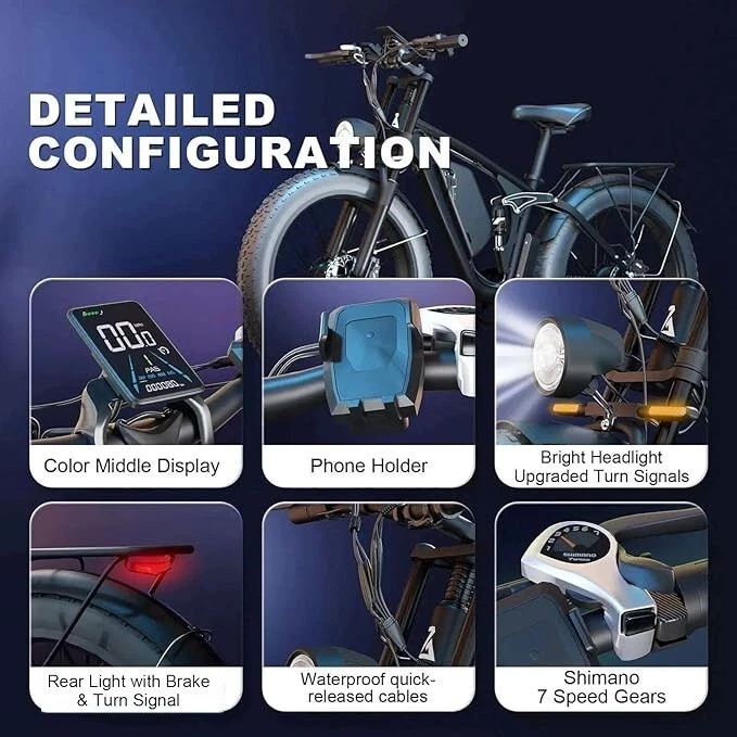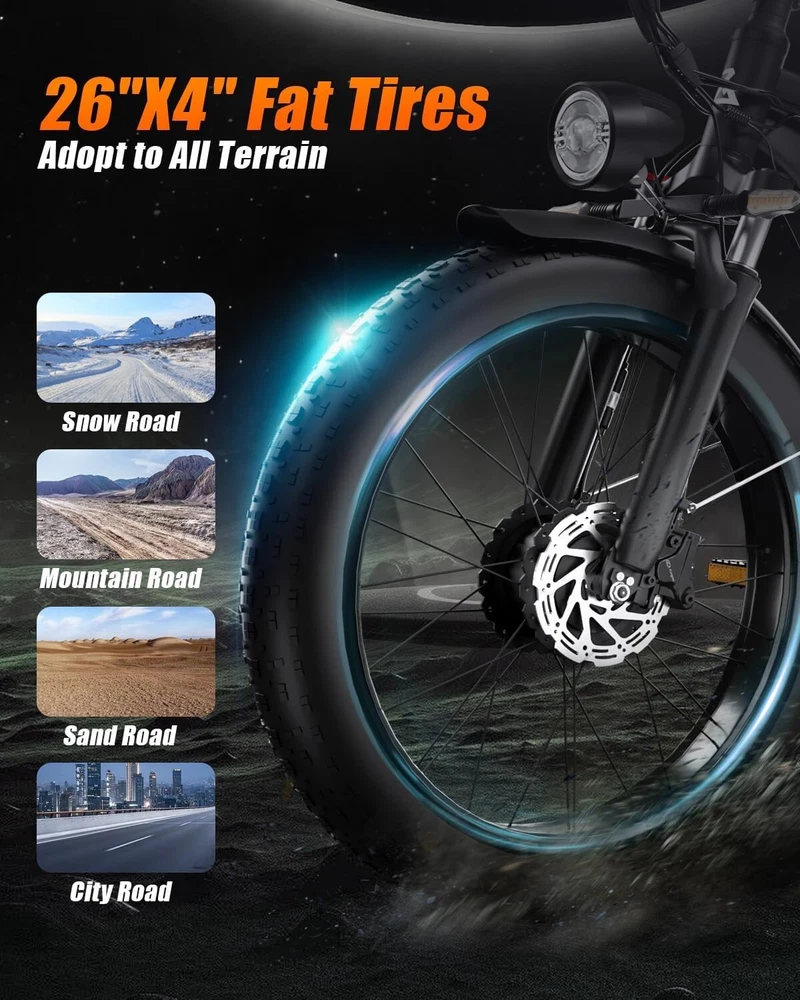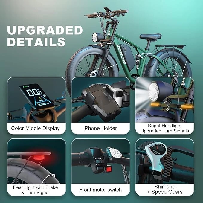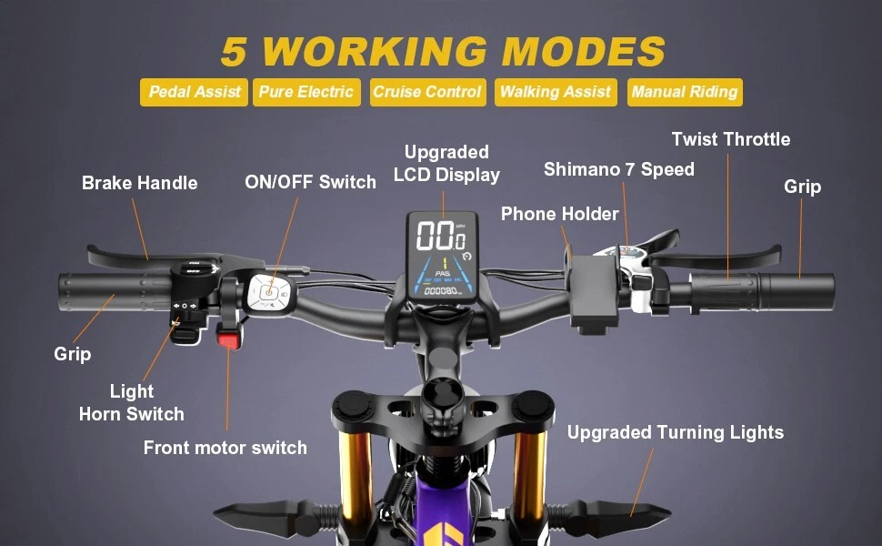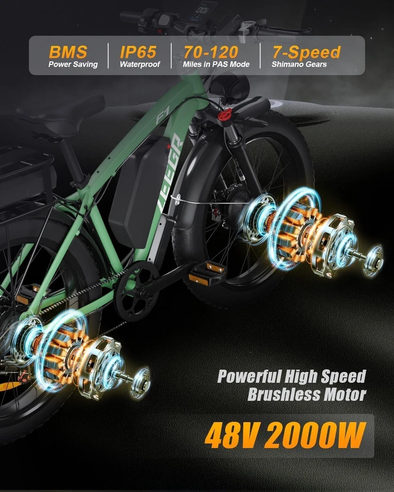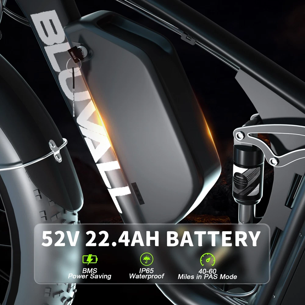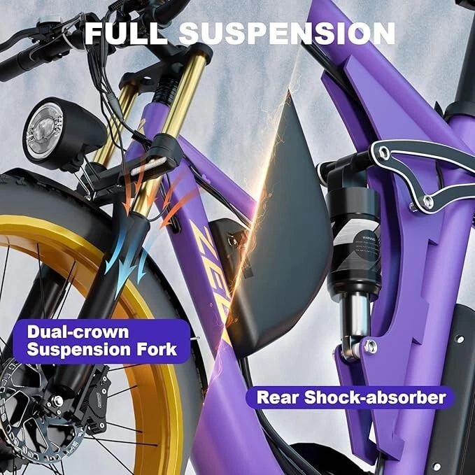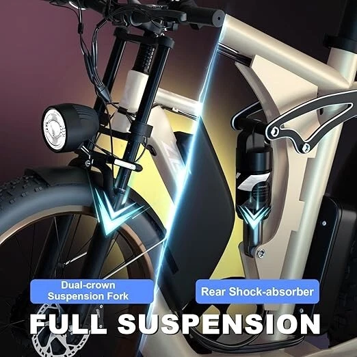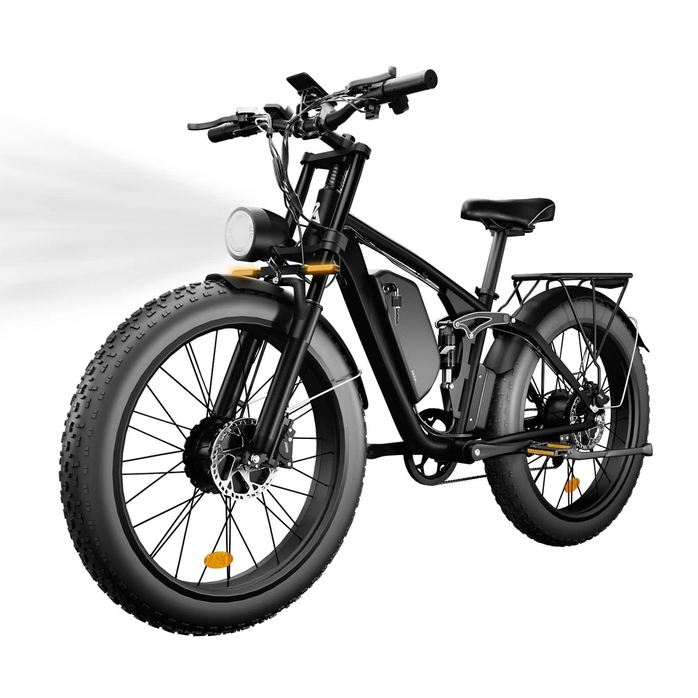 S1 Full Suspension Description 【Dual Motor Electric Bikes for Adults】 TWO upgraded 48V / 52V 1000W high speed Front & Rear brushless motors provide electric bicycles with stronger power and climbing ability, helps to reach the top speed of 35MPH with ease. Removable large capacity 48V/52V 22.4Ah battery offers a long riding range up to 40-60 miles in pedal assist mode. It takes only 5-8 hours to fully charge the battery 【Big Capacity Lithium Battery Ebike】 Large capacity 48V / 52V 22.4Ah battery offers ebikes long riding range of 40-60 miles,the waterproof battery of ebike is not only large capacity and long lasting, but it's also removable, convenient to take home or office for charging.Upgraded 54.6V 2A charger completes charging quickly in 5-8 hours 【Full Suspension 26" Fat Tire Electric Bike】 Equipped with a dual-crown front suspension fork and rear shock absorber , which greatly reduces bumps during riding. 26" x 4" fat tires also provide good grip and excellent shock absorption. This full suspension ebike offers a more comfortable riding experience in the snow, beach, mountain, city roads, helps you conquer most road conditions 【Hydraulic oil Brakes & Shimano 7 Speed Gears】 The ebikes for adults adopt front and rear hydraulic oil brakes, which provides more effective braking in rainy weather, heavy off-road, long downhill and adverse conditions. The bike frame is made of high quality 6061 aluminum alloy, more lightweight and durable. Equipped with professional Shimano 7 speed gears, more accurate and stable 【 5 Riding Modes 】 Enjoy versatile riding with 5 modes: dual motor electric, single motor electric, pedal assist, cruise, and bike mode. With 5 levels of assist, the bike can reach speeds up to 35 mph, depending on battery charge, load, and road conditions. Choose from speeds of 12, 18, 24, 29, or 35 mph.Whether cruising or conquering tough terrain, ride faster, farther, and freer. Don’t just ride—feel the power beneath you! 【Upgraded Lights for Night Riding】 The color LCD display keeps track of real-time speed, battery level, pedal assist level and mileage. This electric bicycle comes with an upgraded bright headlight & turn signals & rear brake light, making you visible and safe at night 【Easy to Assemble】 This e-bike comes 85% pre-assembled. 【1-year warranty】If there is any problem, pls contact us, we’ll reply your message within 24 hours. Pls keep the original bike box for 30 days for possible return 【Custom Service】 Contact US: Monday - Friday (9:00 AM - 6:00 PM); Saturday - Sunday (Closed). Due to the time - zone differences, please be informed that all emails will be replied to within 24 - 48 hours. We appreciate your patience and understanding during this time. We provide lifetime technical support, and committed to providing 1-Year warranty service. Specification S1 Double Engine Electric Bicycles, (Front 1000W + Rear 1000W), 1x 52V 22.4AH Battery Waterproof Wiring, Shimano 7 Speed MTB 26" Fat Tires 1. Wheel size: 26" 2. Frame: 18", Aluminum Alloy 6061 3. Handlebar Sets: Aluminum Alloy with Matte, H31.8*680,S31.8*90, SP31.6*350mm 4. Fork: Dual Crown suspension, Rear shock 1000 pounds 5. Shifting Lever: SHIMANOTX50-7,SHIMANOTZ30 & TY500 7PS 6. Crank sets: Aluminum alloy, Square hole, 48T 7. Brake:Brand Logan Hydraulic oil brake 8. Tire: CHAOYANG 26"* 4.0" 9. Riding Mode: Electric Power Assist(5shifts); Pure Electric(5shifts); Pure Human riding 7 Speed, cruise function 10. Travel Range: Pure Electric 20~25Miles; Electric Power Assist 40~60Miles 11. Max Speed: 35mph,Battery Charging Time: 8~10 hours 12. Monitor: 81F Middle digital display F1Upgrade AWD Dual Motors Dual Batteries (Dual 48V 22.4AH Battery) 【Dual Powerful 2000W Motors】 Equipped with total 2000W high speed brushless motors(Front & Rear), our ebikes can deliver great power, faster start-ups, and enhanced hill climbing ability. The top speed of our electric bike can be up to 35 MPH, which can give you an exciting level of acceleration, making driving fun and enjoyable. Whether for work, school, or outdoor exploration, it fulfills all needs. 【Dual 48V 22.4 Battery 】 Dual batteries cover a range of 70-120 miles per charge (5-8 hours) so that it can meet travel or daily commute needs. Utilizing pedal assist, the range extends to an impressive 120 miles (single motor) and 70 miles (dual motors), with throttle mode, it covers up to 60 miles (single motor) and 40 miles (dual motors) .ensuring you travel without worries. (Calculation based on rider's weight of 75kg. Range varies according to road condition, weather, rider's weight etc.) Removable battery makes charging more convenient whether you are at home or in the office. Dual battery ebike with unique keys makes you enjoy a safe and comfortable riding. It boasts an IP65 waterproof rating for adding durability. 【Front Suspension and Hydraulic Disc Brakes】 Adopting high-strength shock absorbing fork with with mechanical lockout can absorb the bumps of long-distance rugged road. Ebikes for adults use dual disc brakes, which provides more sensitive and effictive braking in adverse conditions, which enhances the safety when riding. The 7-speed gear system caters to all your riding and training needs with little noise. 【Anti-slip and Wear-resistant Tires】 26" fat tire electric dirt bike can confront any surfaces with confidence, unparalleled stability and traction whether it's cruising along sandy beaches, navigating rocky trails, or conquering urban streets and tackle any challenge, making your e-bike adapted to complex terrains and keep you safe. Fat tires are more anti-slip and wear-resistant than small thin tires. 【4 Working Modes】 Pure electric, pedal assist and pure human riding modes with different shifts for you, you can feel free to switch your riding mode according to your needs or mood. Frontlight, taillight and turnlight let other drivers see you and illuminate your path, making you ride electric 