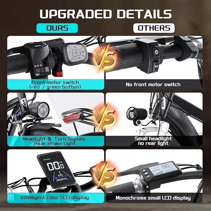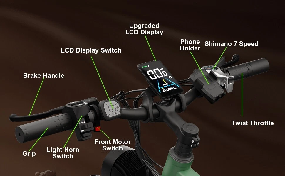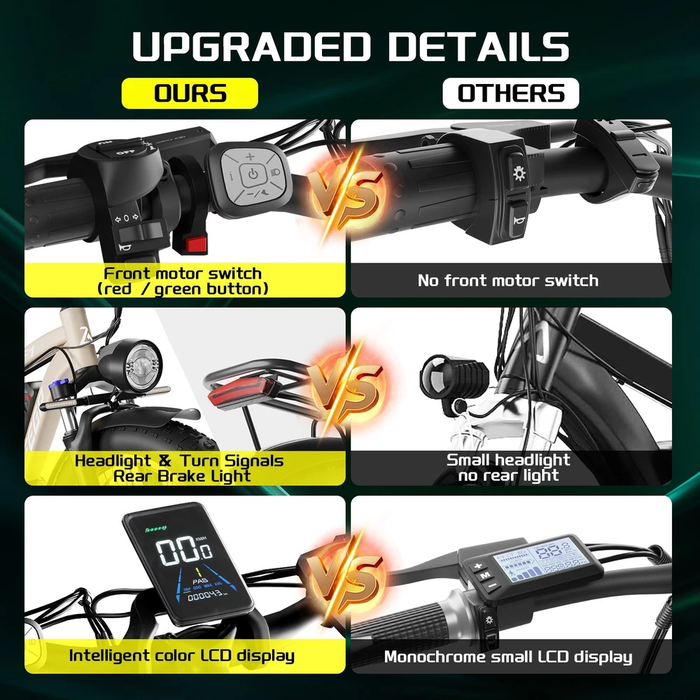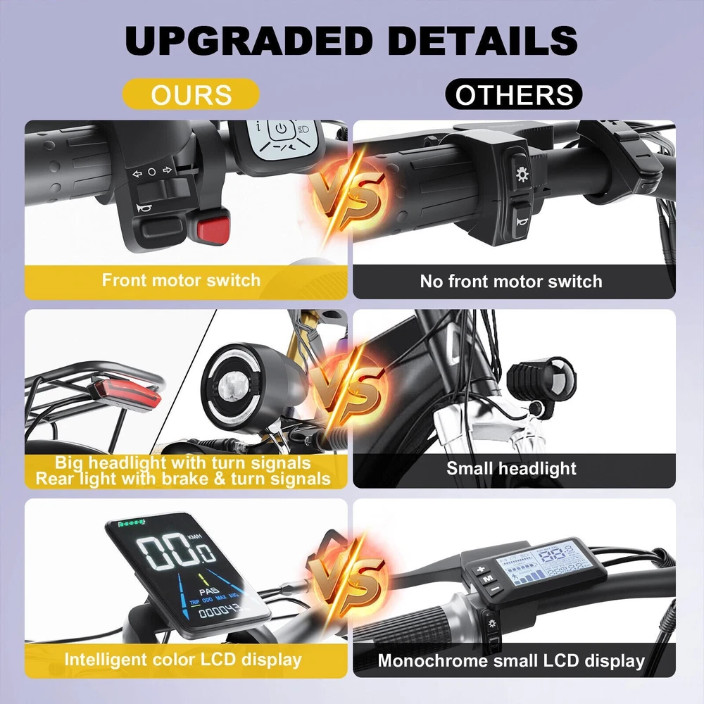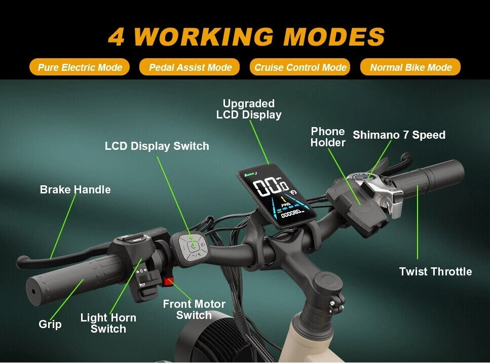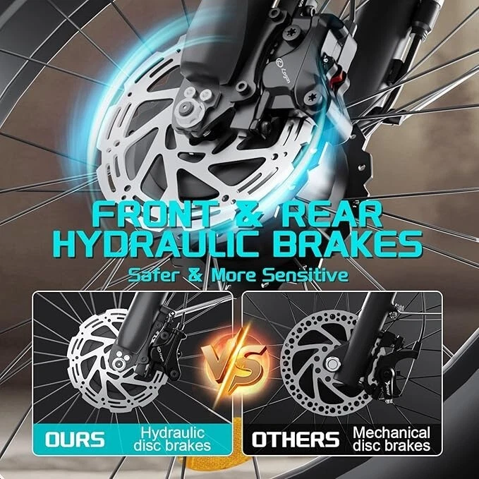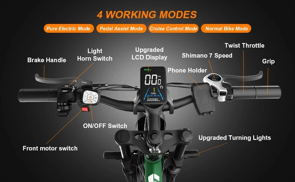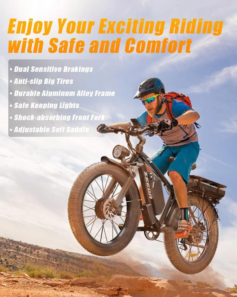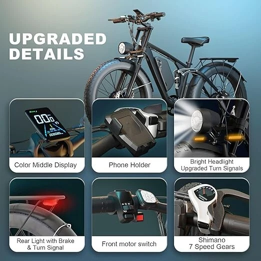 S1 Full Suspension Description 【Dual Motor Electric Bikes for Adults】 TWO upgraded 48V / 52V 1000W high speed Front & Rear brushless motors provide electric bicycles with stronger power and climbing ability, helps to reach the top speed of 35MPH with ease. Removable large capacity 48V/52V 22.4Ah battery offers a long riding range up to 40-60 miles in pedal assist mode. It takes only 5-8 hours to fully charge the battery 【Big Capacity Lithium Battery Ebike】 Large capacity 48V / 52V 22.4Ah battery offers ebikes long riding range of 40-60 miles,the waterproof battery of ebike is not only large capacity and long lasting, but it's also removable, convenient to take home or office for charging.Upgraded 54.6V 2A charger completes charging quickly in 5-8 hours 【Full Suspension 26" Fat Tire Electric Bike】 Equipped with a dual-crown front suspension fork and rear shock absorber , which greatly reduces bumps during riding. 26" x 4" fat tires also provide good grip and excellent shock absorption. This full suspension ebike offers a more comfortable riding experience in the snow, beach, mountain, city roads, helps you conquer most road conditions 【Hydraulic oil Brakes & Shimano 7 Speed Gears】 The ebikes for adults adopt front and rear hydraulic oil brakes, which provides more effective braking in rainy weather, heavy off-road, long downhill and adverse conditions. The bike frame is made of high quality 6061 aluminum alloy, more lightweight and durable. Equipped with professional Shimano 7 speed gears, more accurate and stable 【 5 Riding Modes 】 Enjoy versatile riding with 5 modes: dual motor electric, single motor electric, pedal assist, cruise, and bike mode. With 5 levels of assist, the bike can reach speeds up to 35 mph, depending on battery charge, load, and road conditions. Choose from speeds of 12, 18, 24, 29, or 35 mph.Whether cruising or conquering tough terrain, ride faster, farther, and freer. Don’t just ride—feel the power beneath you! 【Upgraded Lights for Night Riding】 The color LCD display keeps track of real-time speed, battery level, pedal assist level and mileage. This electric bicycle comes with an upgraded bright headlight & turn signals & rear brake light, making you visible and safe at night 【Easy to Assemble】 This e-bike comes 85% pre-assembled. 【1-year warranty】If there is any problem, pls contact us, we’ll reply your message within 24 hours. Pls keep the original bike box for 30 days for possible return 【Custom Service】 Contact US: Monday - Friday (9:00 AM - 6:00 PM); Saturday - Sunday (Closed). Due to the time - zone differences, please be informed that all emails will be replied to within 24 - 48 hours. We appreciate your patience and understanding during this time. We provide lifetime technical support, and committed to providing 1-Year warranty service. Specification S1 Double Engine Electric Bicycles, (Front 1000W + Rear 1000W), 1x 52V 22.4AH Battery Waterproof Wiring, Shimano 7 Speed MTB 26" Fat Tires 1. Wheel size: 26" 2. Frame: 18", Aluminum Alloy 6061 3. Handlebar Sets: Aluminum Alloy with Matte, H31.8*680,S31.8*90, SP31.6*350mm 4. Fork: Dual Crown suspension, Rear shock 1000 pounds 5. Shifting Lever: SHIMANOTX50-7,SHIMANOTZ30 & TY500 7PS 6. Crank sets: Aluminum alloy, Square hole, 48T 7. Brake:Brand Logan Hydraulic oil brake 8. Tire: CHAOYANG 26"* 4.0" 9. Riding Mode: Electric Power Assist(5shifts); Pure Electric(5shifts); Pure Human riding 7 Speed, cruise function 10. Travel Range: Pure Electric 20~25Miles; Electric Power Assist 40~60Miles 11. Max Speed: 35mph,Battery Charging Time: 8~10 hours 12. Monitor: 81F Middle digital display F1Upgrade AWD Dual Motors Dual Batteries (Dual 48V 22.4AH Battery) 【Dual Powerful 2000W Motors】 Equipped with total 2000W high speed brushless motors(Front & Rear), our ebikes can deliver great power, faster start-ups, and enhanced hill climbing ability. The top speed of our electric bike can be up to 35 MPH, which can give you an exciting level of acceleration, making driving fun and enjoyable. Whether for work, school, or outdoor exploration, it fulfills all needs. 【Dual 48V 22.4 Battery 】 Dual batteries cover a range of 70-120 miles per charge (5-8 hours) so that it can meet travel or daily commute needs. Utilizing pedal assist, the range extends to an impressive 120 miles (single motor) and 70 miles (dual motors), with throttle mode, it covers up to 60 miles (single motor) and 40 miles (dual motors) .ensuring you travel without worries. (Calculation based on rider's weight of 75kg. Range varies according to road condition, weather, rider's weight etc.) Removable battery makes charging more convenient whether you are at home or in the office. Dual battery ebike with unique keys makes you enjoy a safe and comfortable riding. It boasts an IP65 waterproof rating for adding durability. 【Front Suspension and Hydraulic Disc Brakes】 Adopting high-strength shock absorbing fork with with mechanical lockout can absorb the bumps of long-distance rugged road. Ebikes for adults use dual disc brakes, which provides more sensitive and effictive braking in adverse conditions, which enhances the safety when riding. The 7-speed gear system caters to all your riding and training needs with little noise. 【Anti-slip and Wear-resistant Tires】 26" fat tire electric dirt bike can confront any surfaces with confidence, unparalleled stability and traction whether it's cruising along sandy beaches, navigating rocky trails, or conquering urban streets and tackle any challenge, making your e-bike adapted to complex terrains and keep you safe. Fat tires are more anti-slip and wear-resistant than small thin tires. 【4 Working Modes】 Pure electric, pedal assist and pure human riding modes with different shifts for you, you can feel free to switch your riding mode according to your needs or mood. Frontlight, taillight and turnlight let other drivers see you and illuminate your path, making you ride electric 