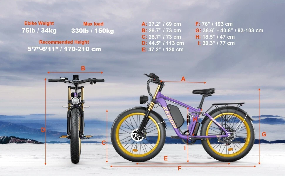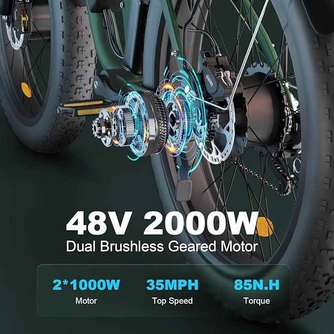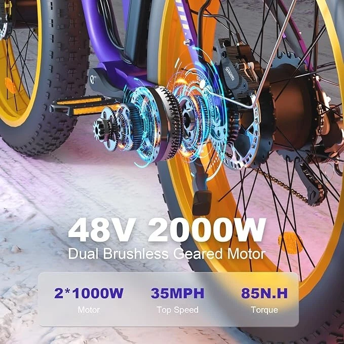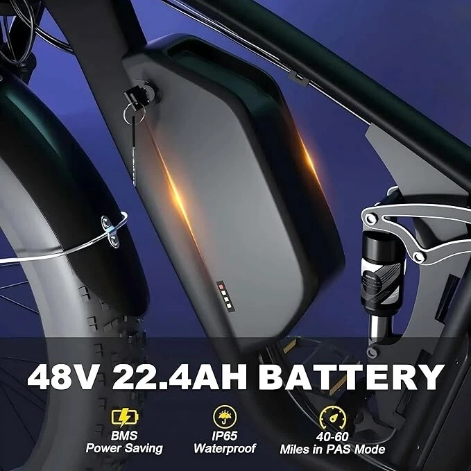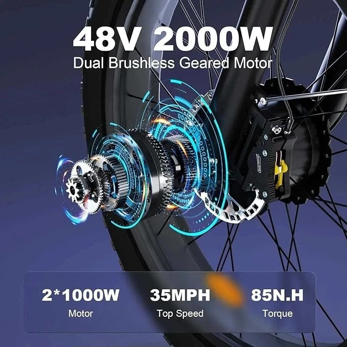 V1 / S1 Full Suspension Description 【Dual Motor Electric Bikes for Adults】 TWO upgraded 48V/52V 1000W high speed Front & Rear brushless motors provide electric bicycles with stronger power and climbing ability, helps to reach the top speed of 35MPH with ease. Removable large capacity 48V/52V 22.4Ah battery offers a long riding range up to 40-60 miles in pedal assist mode. It takes only 5-8 hours to fully charge the battery 【Big Capacity Lithium Battery Ebike】 Large capacity 48V/52V 22.4Ah battery offers ebikes long riding range of 40-60 miles,the waterproof battery of ebike is not only large capacity and long lasting, but it's also removable, convenient to take home or office for charging.Upgraded 54.6V 3A charger completes charging quickly in 5-8 hours 【Full Suspension 26" Fat Tire Electric Bike】 Equipped with a dual-crown front suspension fork and rear shock absorber , which greatly reduces bumps during riding. 26" x 4" fat tires also provide good grip and excellent shock absorption. This full suspension ebike offers a more comfortable riding experience in the snow, beach, mountain, city roads, helps you conquer most road conditions 【Hydraulic Disc Brakes & Shimano 7 Speed Gears】 The ebikes for adults adopt front and rear hydraulic disc brakes, which provides more effective braking in rainy weather, heavy off-road, long downhill and adverse conditions. The bike frame is made of high quality 6061 aluminum alloy, more lightweight and durable. Equipped with professional Shimano 7 speed gears, more accurate and stable 【 5 Riding Modes 】 Enjoy versatile riding with 5 modes: dual motor electric, single motor electric, pedal assist, cruise, and bike mode. With 5 levels of assist, the bike can reach speeds up to 35 mph, depending on battery charge, load, and road conditions. Choose from speeds of 12, 18, 24, 29, or 35 mph.Whether cruising or conquering tough terrain, ride faster, farther, and freer. Don’t just ride—feel the power beneath you! 【Upgraded Lights for Night Riding】 The color LCD display keeps track of real-time speed, battery level, pedal assist level and mileage. This electric bicycle comes with an upgraded bright headlight & turn signals & rear brake light, making you visible and safe at night 【Easy to Assemble】 This e-bike comes 85% pre-assembled. 【1-year warranty】If there is any problem, pls contact us, we’ll reply your message within 24 hours. Pls keep the original bike box for 30 days for possible return Specification Motor 48V/52V 1000W Front & Rear brushless motors Battery 48V/52V 22.4AH lithium-ion battery Display Multifunctional color LCD Display Frame 6061 aluminum alloy Transmission Shimano 7 speed Full Suspension Suspension fork & rear suspension Brake Hydraulic disc brakes Throttle Twist throttle Light Front light & rear brake light & turn signals Tire 26" * 4.0" fat tires 4 Modes Pure electric, pedal-assist, cruise mode, normal bike mode Max Load 330lb (150kg) Range (PAS mode) 40-60 miles (65-95km) Max Speed 35MPH (56KM/H) Charging Time 5-8 hours Bike Size 76.0"*28.7"*44.5" (193*73*113CM) Package Size 58.3"*12.6"*31.5" (148*32*80CM) Bike Weight 75 lbs (34 kg) Package Weight 97 lbs (44 kg) F1 Description 【Dual Powerful 1000W Motors】 The electric bike is equipped with high-speed front & rear 1000w motors, top speed is up to 35MPH . It has stronger hill-climbing performance and offers more power for daily commuting and long travel. You can get excellent riding experience in the snow, beach, mountain, city road, and conquer most road conditions 【Large Capacity Battery 】 With a removable 48V 22.4Ah battery, this fat tire electric bike supports a longer range up to 40-60 miles in pedal assist mode. Your adventures and daily commutes will become wilder and more cost-effective. Upgraded 54.6V 3A charger completes charging quickly in 5-8 hours 【Hydraulic Disc Brakes & Suspension Fork】 The hydraulic disc brakes enable the ebike to brake more quickly and smoothly when riding at high speed, shortening the braking distance even on a wet road. The lockable suspension fork helps you pass rough terrain with less effort. The 26" x 4" fat tires provide good grip and excellent shock absorption for greater durability 【Excellent Riding Performance】 Electric mountain bike frame is made of high quality 6061 aluminum alloy, more sturdy and durable. Equipped with professional 7 speed gears, more accurate and stable. Upgraded headlight, turn signals and rear brake light, intelligent LCD display, this electric bicycle will be a better choice for long time travel and night riding 【4 Working Modes】 Pure electric mode, pedal-assist mode (5 levels), cuise mode, normal bike mode. This adult electric bike can meet your daily commuting needs and outdoor needs, either it is to explore new trails outdoors, get in some exercise, or rush into work 【Professional Customer Service】 1-year warranty. If there is any problem, pls contact us, we’ll reply your message within 24 hours. Pls keep the original bike box for 30 days for possible return Specification Motor 1000W dual motors,brushless front & rear motors Battery 48V 22.4AH lithium-ion battery Display Multifunctional color LCD Display Frame 6061 aluminum alloy Transmission Shimano 7 speed Fork Suspension fork Brake Hydraulic disc brakes Charger 54.6V 3A US Standard Throttle Twist throttle Light Front light & rear brake light & turn signals Tire 26" * 4.0" fat tires 4 Working Modes Pure electric, pedal-assist (5 levels), cuise mode, normal bike mode Max Load 330lb (150kg) Range (PAS mode) 40-60 miles (65-95km) Max Speed 35MPH (56KM/H) Charging Time 5-8 hours Bike Size 76.0"*28.7"*44.1" (193*73*112CM) Package Size 58.3"*11.4"*30.3" (148*29*77CM) Bike Weight 73 lbs (33 kg) Package Weight 93 lbs (42 kg) The item is UL 2849 certified with a link to the UL Product iQ < https://productiq.ulprospector.com/en >