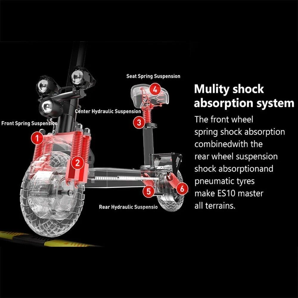 2000W Adults Electric Scooters Dual Motors Drive 48V Commute Off Road E-Scooter 2023 Upgraded iENYRID Electric Scooter ES10 Foldable Electric Scooter comes with a 960Wh (48V 20Ah) battery assisting 25-38 miles cruising range. ES10 becomes an excellent choice for high-quality and comfortable riding. It is suitable for commuting to work, shopping in supermarkets, mountain cross-country and traveling. Powerful Motor & Long Lasting Battery ES10 electric scooters f With powerful Dual 1000W Motors, detailed parts, detachable seat and foldable design,, brings faster acceleration and climbing ability to this electric scooter, which can reach 35 mph max and max 30°climbing angle. Comfortable Commuting IENYRID ES10 adult off road electric scooter comes with upgraded 10-inch off-road tires and front and rear dual suspension to ensure max comfort even on bumpy roads. Also, the aviation-grade aluminum frame is stronger and lighter, which makes the scooter much more elegant to look at and handle as well. And it has a max load of 280 lbs. Foldable Electric Scooter Easy to fold and carry, carry it on public transportation or store it in your car to get to wherever you want. Dynamic, Easy storage in car trunks and other compact spaces, occupying little space and suitable for travel and transportation commute. IPX5 Super Waterproof & LED Intelligent Lighting System The waterproof frame and deck are tightly sealed against water, accredited with an IPX5 ingress protection rating painting. The head of the e scooter is equipped with three LED lights with different functions to ensure safe and worry-free riding at night. Specification: Type: Electric Scooter for Adults Model: IE - ES10 Motor: 2000W Battery specification: 48V 20AH Charger specification: Input AC100-240V, output 54.6V 2A Max aviation plug Controller specification: DC48V/36A Charging time: 4-8 hours Drive mode: front and rear wheel dual drive Max Speed: 31MPH Max Range: 38 Miles Max Load: 280 lbs Maximum climbing ability: ≤ 30 ° Tires: 10 in off-road pneumatic tires Frame Material: aluminum alloy Braking method (front/rear): mechanical braking Front shock absorber: Yes Rear shock absorber: Yes Front headlights: integrated with horn Tail lights: Yes Edge light: Yes Brake lights: Yes Net Weight: 66 lb Front and rear tire pressure: 50 ± 10psi Product Size (L x H x W): 47.24 x 49.6 x 23.62 in (unfolded), 45.67 x 20 x 23.62 inch (folded) Package Contents: 1 x Charger 1 x User Manual 1 x Electric scooter Warning: It is illegal to ride electric scooters on public roads (except under very specific circumstances), pavements or cycle paths. They are intended only for use on private land with the owner’s permission