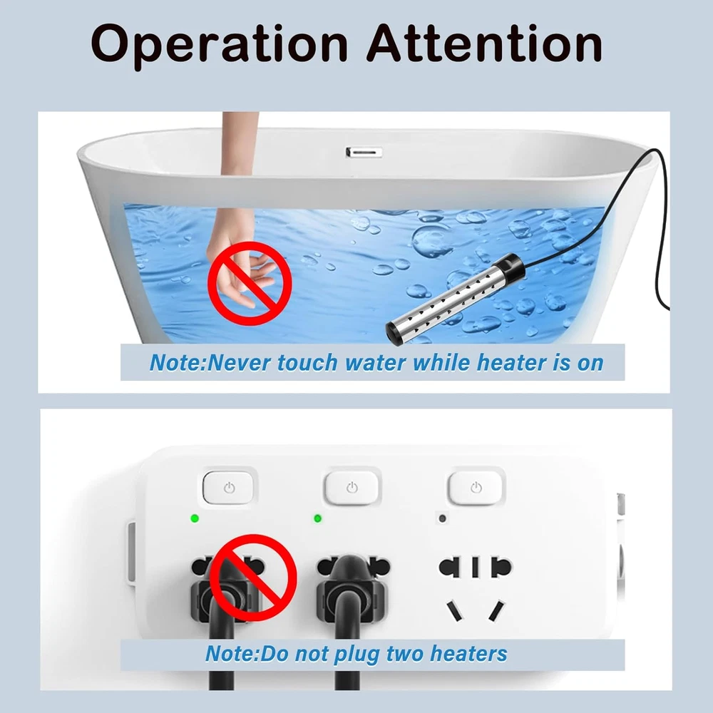 Fast Heating: The 2000W electric water heater features a porous design with excellent thermal conductivity. It will quickly heat 5 gallons of water with high power within a few minutes. If too much water is heated, it may take longer or require the use of two or more immersion water heater. Safety Design: Instant water heater, equipped with high-quality stainless steel protective cover, effectively preventing direct contact between heating elements and humans or animals, rust proof and safety. Our upgraded design ensures optimal performance. It is recommended not to use continuously for more than three hours and not to forget to unplug the power. Easy To Operate: Immerse the bucket heater in water at the appropriate level and plug it into any grounded 120V AC socket. Equipped with a digital LCD thermometer, it is easy to measure water temperature. Check the power indicator light to ensure that the immersion water heater is working properly. Note: When the portable water heater is working, people and animals should not be in the water. Widely Applicable: Immersion water heaters can be used not only in small inflatable swimming pools (multiple in use), but also in hot tubs, bathtubs, buckets, washbasins, camping showers, and more. This hot tub heater is easy to carry and ultra lightweight, making it perfect for travel and road trips. Packaging Includes: Before using the immersion heater, please carefully read the instructions and follow the precautions. Our portable water heater includes 1 pool water heater, 1 digital thermometer, 1 stainless steel cleaning ball, and 1 instruction manual. Product Description