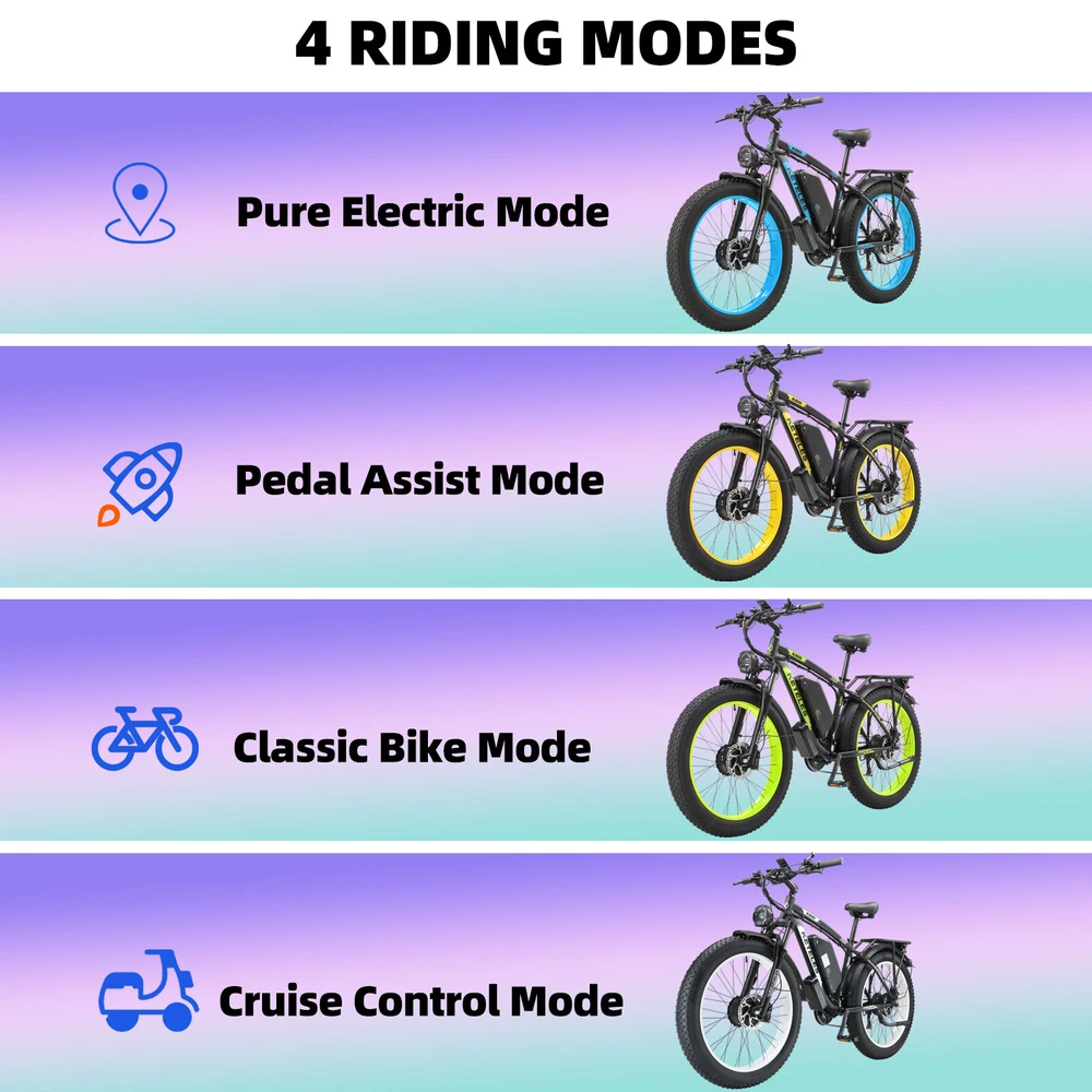 2000W K800 KETELES 26 inches FatTire 48V E-Bike 23Ah 21 Speed Mountain Bicycle Note: Our products have been certified under UL2849 safety standards. About this item: *Powerful Motor E-bike: The K800 is a powerful all-wheel drive electric bike for adults. 2000W brushless motor (1000W front and rear) with Shimano 21-speed gear for an easy ride, with a top speed of about 35MPH, with a long range of more than 40 miles. Equipped with 48V, 23AH detachable lithium battery, so you can bring the battery to your home or office to recharge. Charging time: Approximately 5-8 hours, 2000 cycles of charging. *Fat Tires 26"x4.0" Ebike: Fat Tire and front suspension to ride smoothly on any terrain, including rocky roads, sandy beaches, snowy suburbs and so on. *Smart Display: Mileage 5-speed LCD display computer shows your speed per hour, total distance and remaining battery power for a better riding experience. You can then control the display of miles or kilometers as a unit of speed or mileage through the settings menu. *Four Riding Modes: This electric bike offers a range of riding modes to suit your preferences. You can choose from pure electric mode, pedal assist mode, classic bike mode, or even activate cruise control mode for easy riding. Each mode has its own unique benefits, allowing you to enjoy a customized riding experience every time. *Easy installation: 85% of the bike is pre-installed, you only need to manually install a few simple accessories. *1 Year Warranty: We provide 1 year warranty. If you have any questions about this item please directly contact us. Warm Tips: 1.New electric bike passes road test before packing, therefore dust on the tires is inevitable. 2.Upon arrival, mark down the serial number, which locates on the middle axle tube, and register to vehicle management center. It is necessary to track your ebike while preventing loss. 3.Please be aware of the height of electric bike. Package Included: *1 x Electric bicycle * 1 x Headlight *2 x Fenders *1 x Charger *1 x Battery *1 x Tool kit *8 x Tools *2 x Pedals *1 x Taillight *1 x Rear rack *1 x Air cylinder *1 x Lock Specification: Bike Type E-Bike Age Range Adult Brand KETELES Number of Speeds 21 Color Black-Green Tire 26"x4.0" inch Fat Tire Frame 6061 Aluminum Alloy Frame Brake Hydraulic Brake with Power Cut-off Feature Throttle Twist Throttle on the Right side of Handlebar Display Smart LCD display that shows speed, battery status, pedal assist level, etc. Brake Hydraulic Brake with Power Cut-off Feature Headlight LED Headlight powered by battery Voltage 48 Volts (DC) Range Fully Electric Mode Range: around 40~60km Pedal Assist Mode Range: around 70~90km Model Name K800 Front Motor 48V 1000W Brushless Geared Hub Motor Rear Motor 48V 1000W Brushless Geared Hub Motor Wattage 2000 watts Item Weight 38kg Maximum Weight Recommendation 200 Kilograms Warranty 1 year Suggested Users Unisex-adult 48V 1000W*2 75N.m Powerful Motor The high-speed brushless gear hub motor is a highly efficient and advanced motor that offers several benefits for riders. It has a simple structure, low noise, low energy consumption, and excellent riding experience. Moreover, it is easy to maintain, has remarkable waterproof performance, and adapts to various weather and terrain conditions. LED Headlights Ride at night, safe and sound! Bicycle front LED light, illuminate your every step! This bicycle front light has a super strong LED lamp, which can emit dazzling light in the dark night, clearly showing your front road condition, ensuring your safety when riding at night. No need to worry about the dangers of riding at night. Electronic Tail Lights and Full Coverage Fenders The bolded rear frame can bear more weight, the full-cover fender protects the rider from being splashed by mud and water during riding, and the bright electronic tail light helps to ensure night riding safety, reminding other traffic participants to pay attention to the rider and prevent accidents. System of riding It has a complete riding assistance system, and it can switch easily among different riding modes, to handle various riding environments. Shimano 21-Speed According to the road conditions and their objectives, riders can change different gear proportions to enhance riding and climbing efficiency. The shifting is precise, the chain does not slide or drop off, suitable for all kinds of terrains, speed can be freely altered. Aluminum Suspension Fork The suspension fork resists the bumps on the road, making the journey comfortable. It sensitively absorbs and alleviates shocks, enhancing the comfort and stability of riding, making the ride smooth and precise, allowing the rider to confidently handle various terrains, reducing the interference of bumps. The powerful and lockable aluminum alloy fork has high strength, light weight, corrosion resistance, more durable and safe. Disc brake system Front and rear hydraulic disc brake system, with power-off function, quickly and smoothly stopping. 2 larger and thicker 180mm disc rotors, providing more effective braking power, more confident downhill. Payment Delivery details Terms of sales About us Contact us Payment We accept Credit Card, Debit Card and eCheck payments through Payoneer. Delivery details 1. Thank you very much for purchasing our products. 2. All the items double checked well packed bafore shipping. 3. Itme will be dispatchec within 2 business day(not includes the holiday and weekend) after your payment. 4. We usually use Fedex or UPs logistics to transport your package, and the delivery time would be about 5-7 business days. 5. When you have completed your payment, please leave your correct phone number and address, you could contact us by courier for any quesiton. And keep your phone open, prevent the delivery staff contacting you and causing the package to be returned. Terms of sales We guarantee 100% customer satisfaction. We check all items before sending out, if you received an broken/ defective item, please take 
