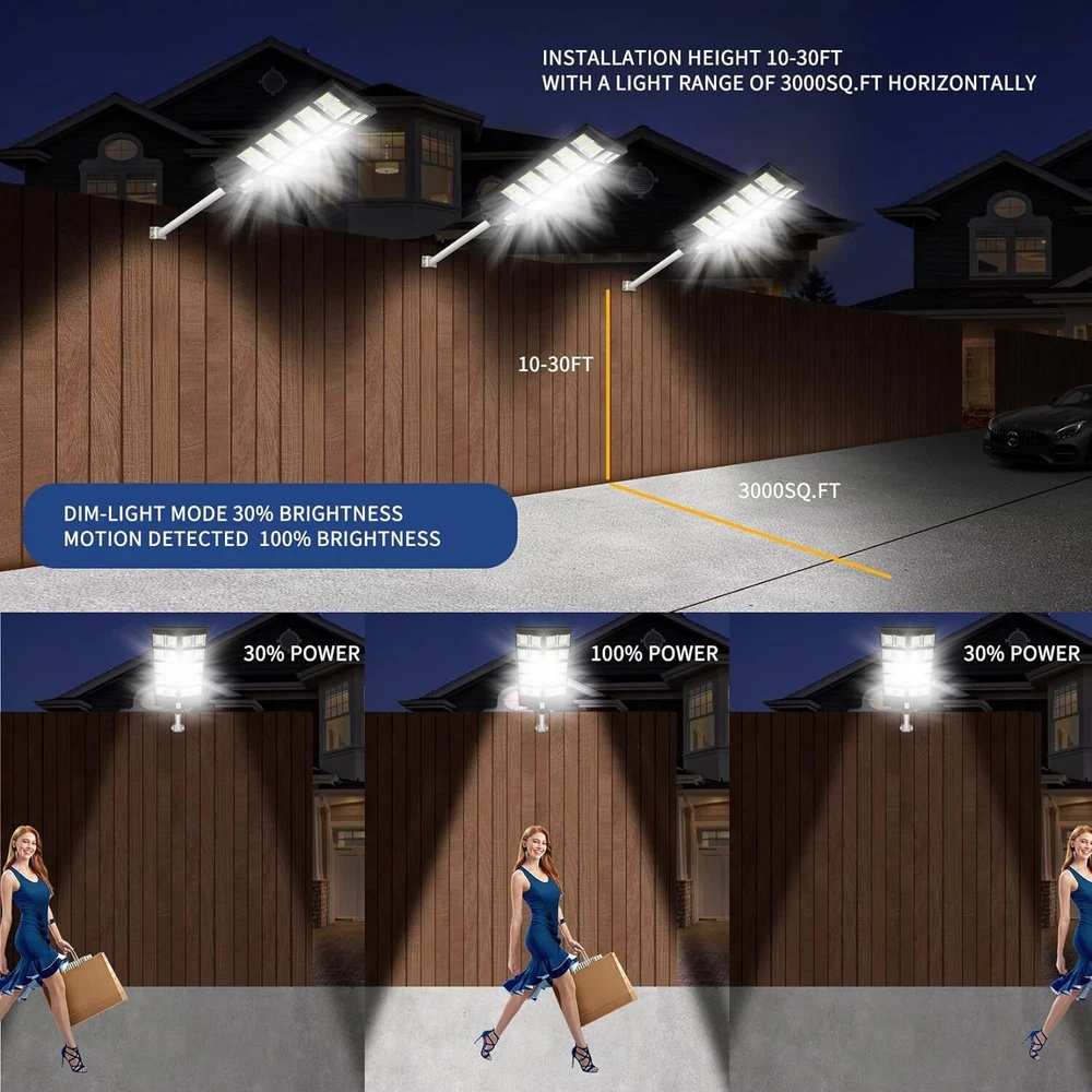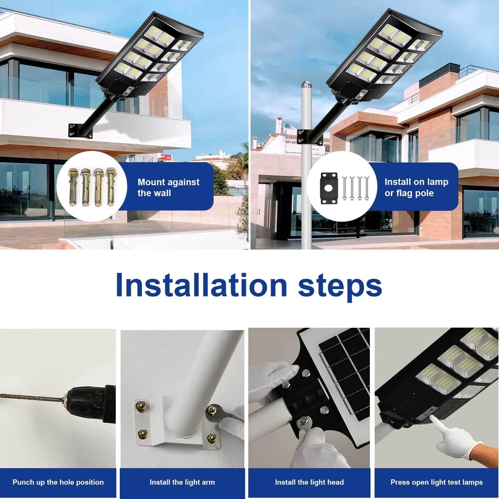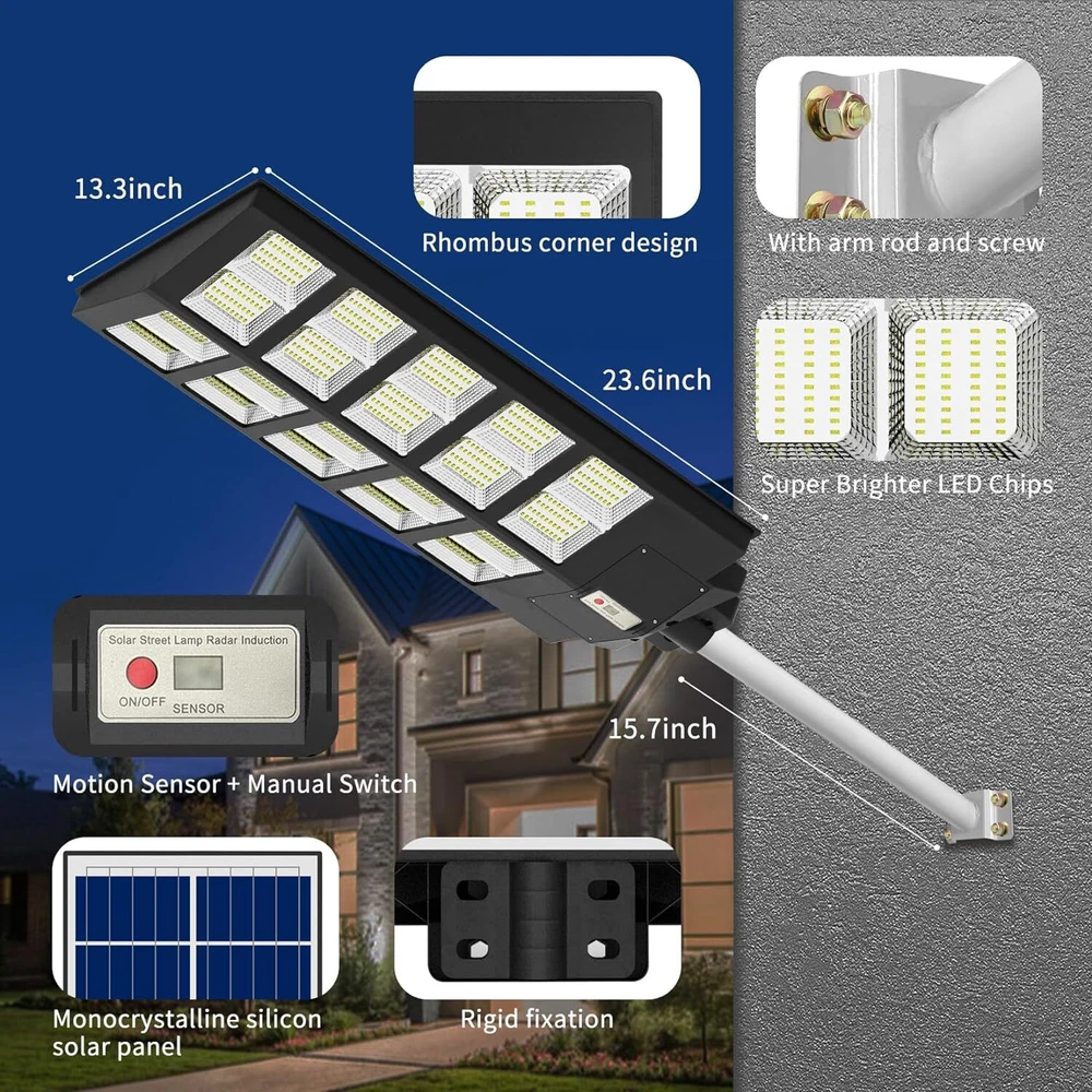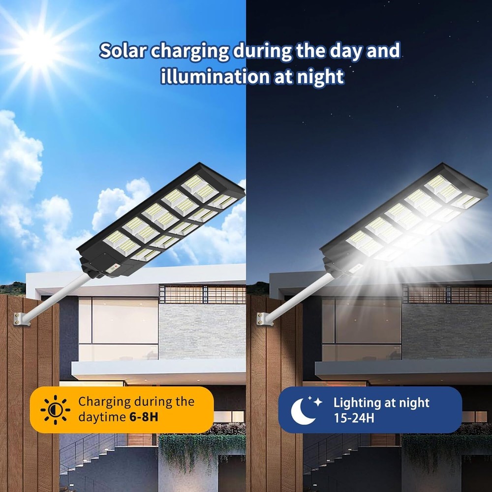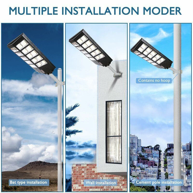 NEW-00021 100% Genuine High Quality Fast Shipping 1000000000LM 2000W Commercial Solar Street Light IP67 Dusk-Dawn Road Lamp+Pole PRODUCT DESCRIPTION 2000W LED Solar Flood Light Motion Sensor Security Wall Street Yard Outdoor Lam Advantage: 【Fast charging and Dusk to Dawn】 Our commercial solar street light outdoor comes with 6500k cool white light, Built-in Super Bright LED Beads, it is more bright other led beads, it provided the clear and bright vision. The conversion rate of solar panel installation reaches 22.5%. Fully charging 6-8 hours in the daytime, the led street light can continue to work for more than 14 hours . Powered by solar and save electricity bill, automatically turns on at dusk and turns off during the day. Dusk to Dawn. No worry lighting lasts. 【Motion Sensor + Remote Control+Timing mode】 These led road street light are equipped with remote control, it is good for long distance to control, remote distance:12m. You can choose different lighting modes ( Light Sensing Mode, Motion Sensing Mode ) and light brightness for your needs. There are 4 levels of brightness that can be adjusted. Remote control operation can be timed,it Provides 5 Timing sets: 2H/3H/5H/6H/8H. Radar sensor mode, the lights are 100% brightness when motion is detected, and the lights are dim and 30% brightness when no motion, intelligently saving electricity, and increasing the lifetime of street lights. 【220° solar panel design and wide-angle lighting】 We have upgraded the solar panel and it has two-way wide-angle lighting, the lighting angle reaches 220°, and benefits from super bright led beads, allowing it provide a wider range of lighting and brighter light compared with ordinary 180° street lights. Illumination area up to 1600-1900sq.ft, we recommended installation height:6-8M.It can be lighting up street and offer convenience for walking at night. 【IP67 Waterproof and Durable】 The outdoor solar street light adopts high-quality material, which is lightning-proof, rain-proof, oxidation-proof and anti-exposure. IP67 waterproof function makes it work on a rainy day. Its adaptable working temperature is -22℉~140℉. This outdoor Solar Parking lot Lights pole has 15000mAh battery capacity, is more stable and longtime lasting. 【Easy to install and wide application】 This street light solar powered has 2 installation ways, it is easy to install on poles and walls. The installation accessory included in the package, no wiring is required, which can be easily installed outdoor. Perfect for street and roads, parking lot, basketball court, garage, garden, street, courtyard, farmhouse and squares, etc. Product Features: -Solar power& environmental protection: Solar panels convert solar energy into electricity.NO wires,easy to install.Big capacity battery can save up to 100% electricity. -Ip67 Waterproof & Anti-corrosion : Made of good quality durable ABS material and can be used in outdoor for any bad weather conditions. The working temperature is -50℉-140℉. - Light Control &Remote Control: LED solar flood light will automatically turn on at dusk and turn off at dawn.Remote control functions including 2h/3h/5h/6h/8h setting ,25%/75%/50%/100% brightness. -Super Bright: Imported LED lamp bead light source.Two-way lamp beads wide-angle lighting The brightness is several times higher than traditional light bulbs. -Human body sensing & radar sensing: The light is bright when there are people, and the light is slightly bright when there are no people -Safe to use: Built-in protection circuit for long life. -Multiple installation methods: Pole-mounted and wall-mounted which can be installed on light poles/walls/small diameter cylinders . -Widely Application: Outdoor wall or pole in Plaza, Park, Garden, Courtyard, Street, Walkway, Pathway,Campus, Farm, Perimeter Security and etc. Specification: 2000w 800LED Wattage: 2000W Fully charged lighting: 20 hours Solar panel: 6V/30W Battery capacity: 3.2V 2.0AH Product function: radar + light control + remote control Lamp body size: (H*W*L)68*8.5*35cm/26.77*3.35*13.78inch Lamp beads: 800 Irradiation area: 250 square meters Installation height: 4-6m Material: ABS engineering plastic PC cover Waterproof :IP67 Remote control :Normal light or induction mode Remote control battery type: 2*AAA (included) Life: 100000 (h) Installation Instructions: 1. Please link the shell and light pole of the street light with which is installed on the shell with hex key. 2. Please bore the hole into the wall. 3 .Please tighten the nut with a hex wrench and secure it Package including: Solar Street Lights *1 Remote control*1 Lamp Pole is INCLUDED*1 About Us Payment Shipping Returns Contact Us Welcome to our store, your support is the biggest driving force for us to move forward. Our main business is solar street lights, solar controllers, solar panels and so on. The product is directly connected with the factory to ensure product quality. Please rest assured to buy, we will provide you with a perfect shopping experience! We accept payment via Paypal only. Payment must be completed within 10 days. If you have any problems about payment, please contact us via ebay message. We only ship to confirmed Paypal addresses. Please comfirm that your paypal address is in line with your shipping address. Please kindly note that the combined shipping is not provided because the shipping fee is calculated by weight. Also, the each additional item means exactly the the same color and size. It takes about 7-15 working days to US; about 10-30 working days to other countries. Transit time may be a little delayed because of the bad weather and customs inspection. If you do not receive your item within 30 working days since payment finished, please contact us immediately for further assistance. If you have any issue about Item. Please contact us with 7 days since you receive the item and and return to us within 30 days from the delivery date for exchange or refund. If you need return, plea