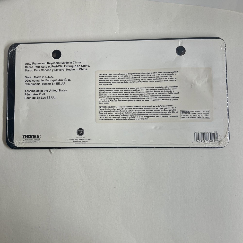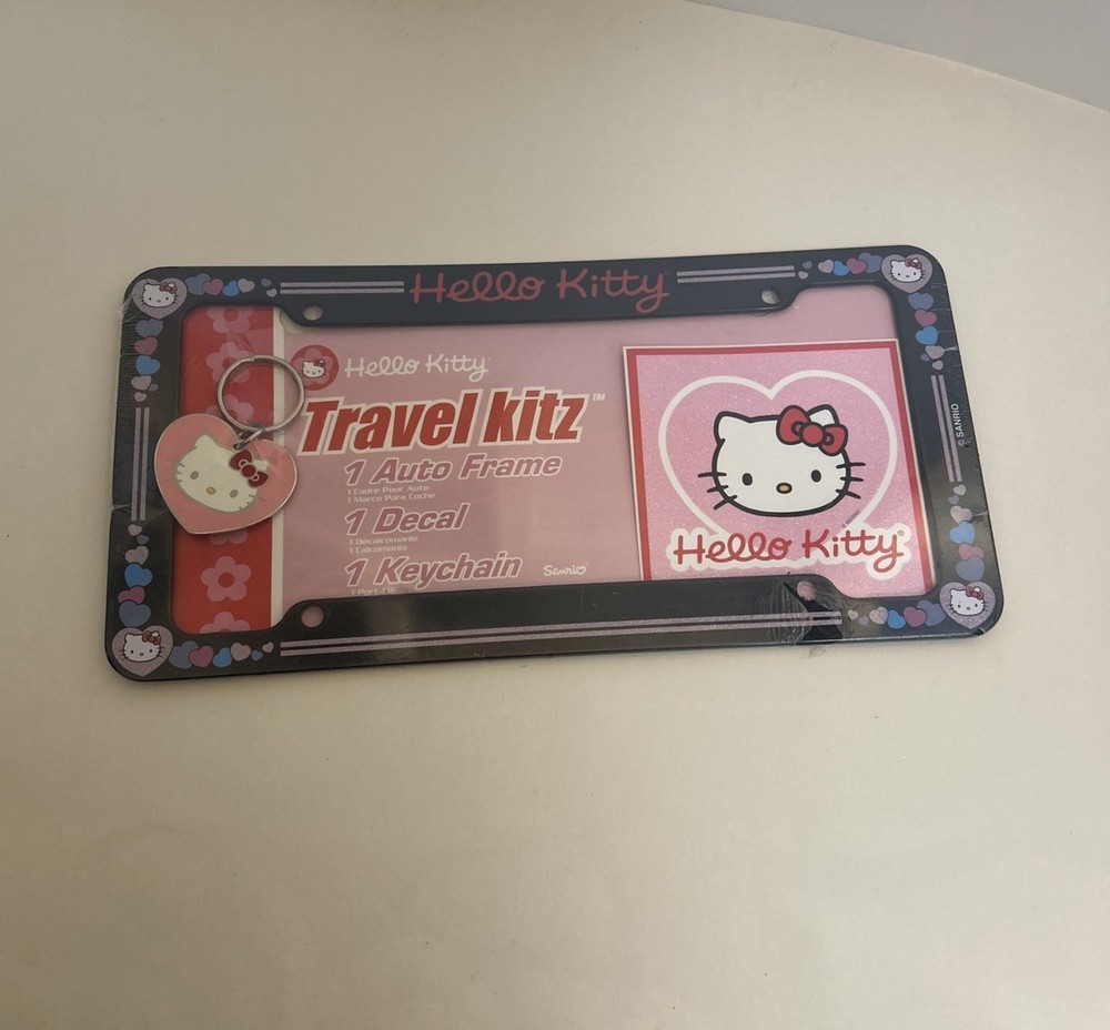 The product is a 2007 Sanrio Hello Kitty black sparkle heart license plate frame. This accessory features the popular cartoon character Hello Kitty with a black color and sparkle heart design, adding a touch of fun and nostalgia to any vehicle. It is a unique and cute way to showcase love for the cute and iconic Hello Kitty character from Sanrio.