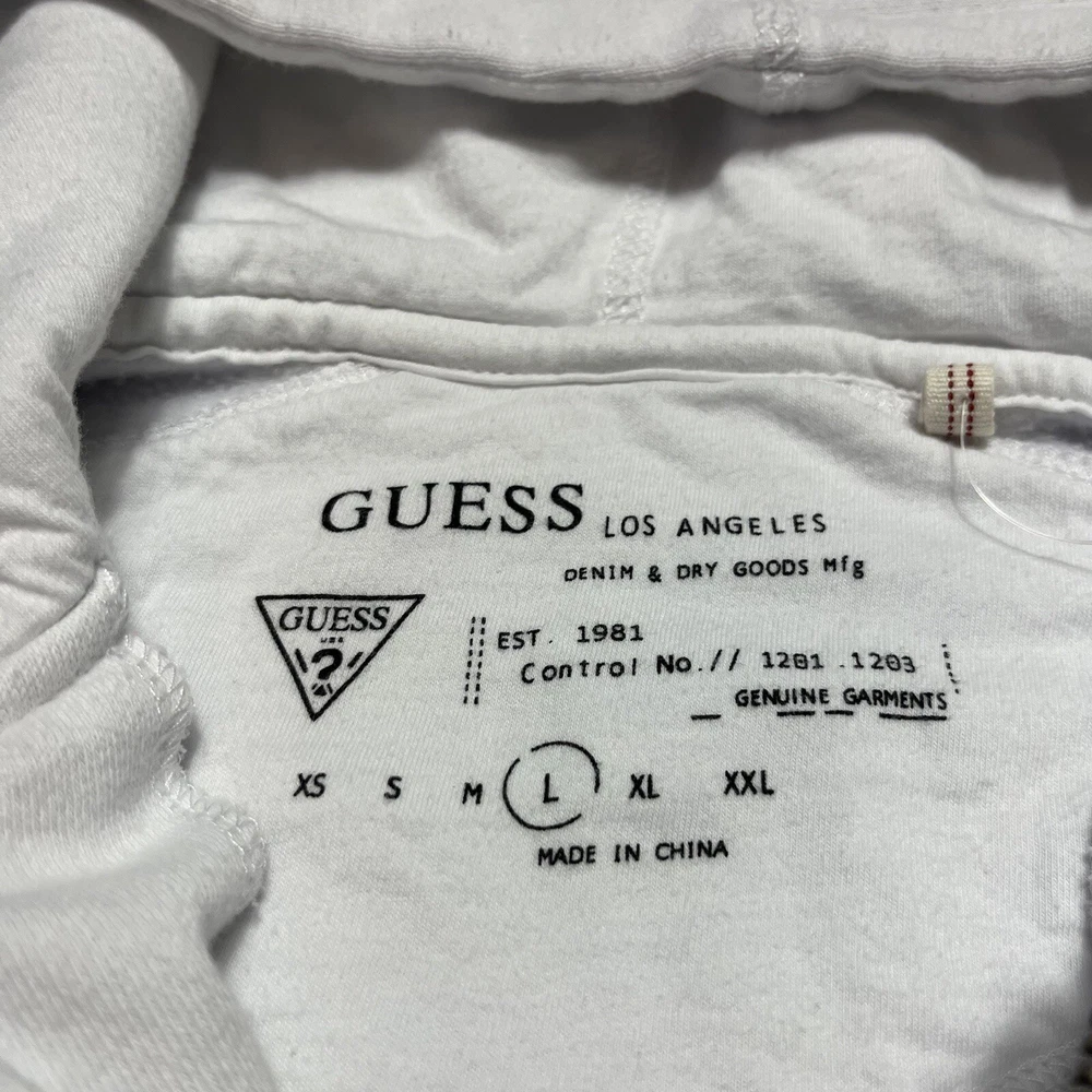 Neckline: Crew Neck Style: Full Zip Accents: Logo Pattern: Solid Garment Care: Machine Washable Color: White Size Type: Regular Personalize: No Sleeve Length: Long Sleeve Character: Peace Material: Cotton Brand: GUESS Performance/Activity: CrossFit, Cross Training, Golf, Gym & Training, Weightlifting Theme: Army Closure: Zip Features: All Seasons Type: Hoodie Season: Fall, Spring, Summer, Winter Fit: Regular Department: Men Size: L