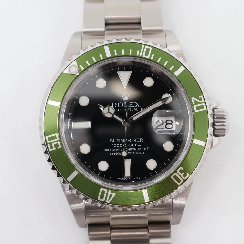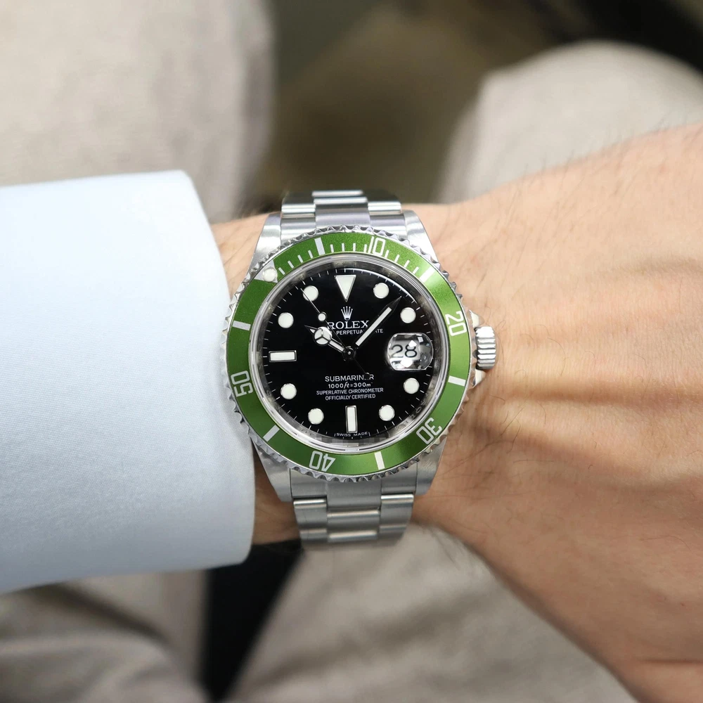 Very good preowned condition. Clean bezel insert, dial and hands. Calibrated timekeeping. Original box and papers are included. 2000's Mint Rolex 16610LV Submariner 40mm Automatic Black Dial Steel Watch Description Very good preowned condition. Clean bezel insert, dial and hands. Calibrated timekeeping. Original box and papers are included. Ships from Address 608 5th Ave, STE 408 - New York New York, 10020 Phone 16465368182 Condition Pre Owned Highlights Weight 134.7g Case Size 40 mm Wrist Fit 7.75 Inches Box Yes Papers Yes SKU 018668 General Info MSRP 19500 Brand Rolex Type Wristwatch Department Men Model Number 16610LV Country/Region of Manufacture Switzerland Style Sport Model Rolex Submariner 16610LV Vintage No Features/Other Details Year Manufactured 2000-2009 Customized No Handedness Right With Original Packaging Yes With Service Records No With Booklet Yes With Papers Yes Seller Warranty Yes SKU 018668 Features Date Indicator, Luminous Hands, Sapphire Crystal, Screwdown Crown, Self-Winding, Swiss Made, Swiss Movement, Water-Resistant Band/Bracelet Details Band Color Gray Band Material Stainless Steel Closure Double-Locking Fold-Over Clasp Band Type Bracelet Band Width 15.5 mm Lug Width 20 mm Wrist Fit 7.75 Inches Case Details Case Material Stainless Steel Case Color Black Water Resistance 100 m (10 ATM) Watch Shape Round Caseback Screwback Case Finish Polished Case Size 40 mm Case Thickness 13 mm Bezel Details Bezel Type Count-Up/Dive, Unidirectional Rotating Bezel Color Green Display Dial Color Black Display Analog Indices Round Indexes Movement Movement Mechanical (Automatic) Number of Jewels 41 Jewels Movement Caliber Calibre 3135 Shipping Warranty Return Policy FAQ All in stock items are shipped within one business day. Same day shipping is available upon request. Due to insurance purposes, all packages are shipped with a tracking number and signature is required. We do not ship to PO Boxes. Import duties, taxes, and charges are not included in the item price or shipping cost. These charges are the buyer's responsibility. Please check with your country's customs office to determine what these additional costs will be, prior to bidding or buying. All watches sold by Luxxwatches are covered with in-house warranty for a period of Watches that lose time, gain time, do not change day or date, or have any other signs of not working properly will be serviced under our warranty program.The Luxxwatches warranty does not cover any damage resulting from water damage or physical harm. Additionally, the warranty does not cover polish for the watch case, any damage to crystal, band, bezel, straps, screws, crown/stem, finishes, clasps/buckles which are a result of normal wear and tear. Any lost parts of the watch, including stones, is not covered with the warranty. Any damage incurred as a result of exceeding the limitations of the watch manufacturer’s water resistance guidelines will not be covered with the warranty. Any third-party repairs, outside modifications or customizations will void the warranty. All the items purchased from Luxxwatches are covered with a 30-day money back guarantee. If you are not fully satisfied with your purchase, you may exchange or return your item for a refund within 30 days of first receiving your item. Item must be in the same condition as it was received, and include all original booklets, box & packaging. Any signs of wear, water damage, or altering will result in refusal of your return.Special order items, such as items we do not have in our warehouse and are specially ordered from our distributor or items that have been customized, are non-returnable.We offer free returns on eligible items, please contact us for the return shipping label. How to start an automatic watch? It’s very important to wind an automatic watch properly, prior to its use. The initial wind provided may only last a short while, making the watch appear defective once it stops ticking. To ensure your watch functions to the fullest of its capabilities, wait for it to stop and then wind the watch counter-clockwise 15-20 times. Next, push the crown back, screwing it down to preserve the water-resistance. *Be mindful that excessively winding the watch may cause damages to the movement, so don’t overdo it. Unlike self-winding watches, the crown doesn't need to be wound on quartz models. If it still isn’t ticking, simply bring it by for a battery replacement. Why the watch is running slow? A watch can lose time for various reasons including, but not limited to a dying battery, which will cause the second-hand to begin jumping across several seconds at once instead of passing each individually, magnetization, causing tension between small parts within the movement and natural friction from the watch being worn. If the watch is a mechanical model (Automatic or Manual-wind) this can also be a sign that the watch needs to be overhauled. How to use a chronograph? Operating a Chronograph requires using the pushers on the side of the case. The top pusher is used to start and stop the chronograph hand while the one at the bottom is used to reset it. Once the top pusher is pressed, the hand will run continuously, which you can track using the accompanying sub-dial. In order to reset the chronograph, it has to be stopped first. Otherwise the button will do nothing when pressed. How to set the date & time? Whether you have a screw or push-down crown, setting the date and time is simple. If its a screw-down, unscrew it by turning it downward, counterclockwise prior to following these steps. Pull out the crown to the first integer to operate the date alone, allowing the time to continue ticking. Pulling the crown out farther, you’re then allowed to adjust the time, which also shifts the date after each 24-hour cycle. Once you have your watch set, simply push the crown back in all the way and screw it fully closed to preserve its water-resistance. *Do not change the date when the watch is betwee