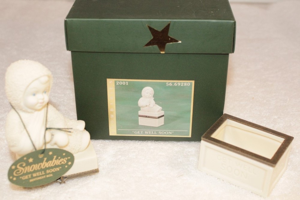 SNOWBABIES 1 Please visit our Ebay Store: jmcards.com15 We combine shipping! There is no combine shipping on items that have $1.25 shipping charge 2001 DEPARTMENT 56 SNOWBABIES "GET WELL SOON" SENTIMENT BOX STOCK PHOTO APPROX SIZE: 4 3/8" TALL, 2 1/4" WIDE THANKS FOR LOOKING KIM JOE MANZELLA SPORTSCARDS Powered by SixBit's eCommerce Solution