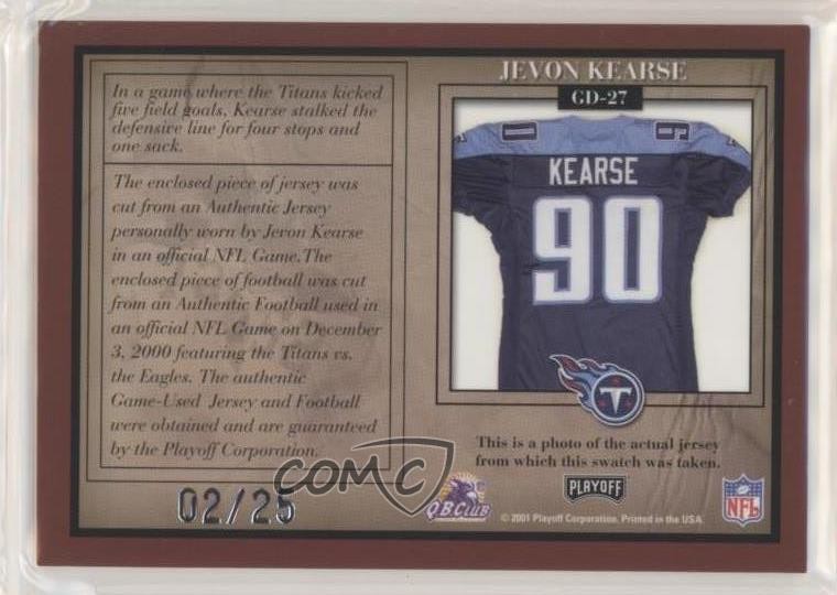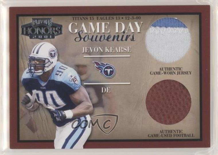 This is an amazing collector's piece for any Titans or Jevon Kearse fan! The dual football prime jersey is a rare find with only 25 made, making it a must-have for serious collectors. The design is sharp, and the memorabilia adds great value. Highly recommended for anyone looking to add a unique card to their collection!