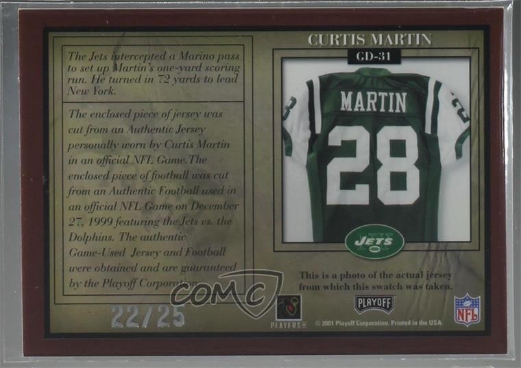 2001 Playoff Honors - Game Day - Souvenirs Dual Football Prime Jersey #GD-31 Curtis Martin Qty Made: 25 - Football Card - Featuring the New York Jets - Featuring Curtis Martin Search for more: 2001 Playoff Honors Search for more: 2001 Playoff Honors - Game Day - Souvenirs Dual Football Prime Jersey View all of our Listings Auctions Buy It Now About Us Located in the beautiful Pacific Northwest, COMC (Check Out My Cards) is the world's largest consignment service for trading card singles. More than 10,000 people have used our consignment service to list over 50 million trading cards. Find out how we can help you consign your items on eBay by contacting us through eBay messaging. COMC -- "The Safe & Easy Way to Buy & Sell" Representative Image - Select Specific Item above to see image of actual item Representative Image - Select Specific Item above to see image of actual item Raw Condition for Modern Cards Unless otherwise noted, raw modern cards are listed in Near Mint-Mint condition or better. A NM-MT card appears to be Mint at first glance, but upon closer inspection, may exhibit some of the following: minor print defects (e.g. roller marks, print line, dimple), minor scratches, slight edge wear, and slight corner wear. Centering is clearly visible in the images provided and does not factor into our condition assessment. Raw Condition for Vintage Cards Unless otherwise noted, raw vintage cards are listed in Excellent condition or better. An EX card may exhibit some of the following: minor rounding of corners, surface wear, print defects, light scratches, and slight edge wear/chipping. Centering is clearly visible in the images provided and does not factor into our condition assessment. Domestic Shipping Combined shipping for multiple items is available. To receive combined shipping, please ensure all desired items are in your eBay shopping cart before proceeding to checkout. eBay limits orders to 40 items per order. We automatically combine multiple orders placed on the same day. If you place multiple orders on the same day, please contact us to request a refund of applicable shipping costs. Signature confirmation may be required on invoices over $400. All cards are protected and shipped securely. International Shipping COMC offers eBay's International Shipping (EIS) for international orders under $2,500* (see country exceptions below). All duties and import fees are paid at checkout; in the rare event that there are additional import fees upon delivery, these are borne by the buyer. EIS packages route through a shipping hub in Erlanger, KY before shipping to their final destination. Please note that EIS does not allow for combined shipments. The shipping rates are determined by eBay and cannot be adjusted. *Maximum sale price exceptions: Colombia, Kuwait ($2,000); Taiwan ($1,539); Chile, Costa Rica, Guatemala, Honduras, Trinidad and Tobago ($1,000); Antigua and Barbuda, Aruba, Belize, Dominica, Grenada, Philippines, Saint Kitts and Nevis, Saint Lucia, Montserrat, Turks and Caicos Islands ($500); Dominican Republic, El Salvador ($200). Please request a shipping quote through eBay messaging for orders that exceed the maximum sale price supported by eBay's International Shipping. You will be responsible for all duties and import fees for international orders shipped outside the EIS. All cards are protected and shipped securely. Payment COMC does not accept offers on our cards through our eBay storefront. COMC utilizes eBay’s managed payments system. If you are experiencing difficulties making a payment, please contact eBay for assistance. Return Policy Returns are only accepted on the rare occasion the item is not as described. If you are making a return, please initiate the return process through eBay so a mailing label can be provided for you. Prior to listing, our expert team carefully assessed this item to represent it accurately. Please review the description and high-definition images prior to purchasing to ensure this item meets your satisfaction. We welcome you to contact us if you have further questions about this item. Trust and Integrity COMC carefully assesses each item consigned to us to prevent fraudulent items from entering the marketplace. If you believe an item offered on COMC may be fraudulent, please contact us with details so we can investigate the issue. Items we determine are outside our supported items policy may be removed. Last Modified: 7/12/2025 7:58:28 AM PDT