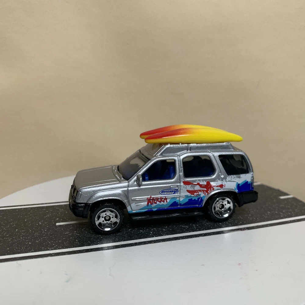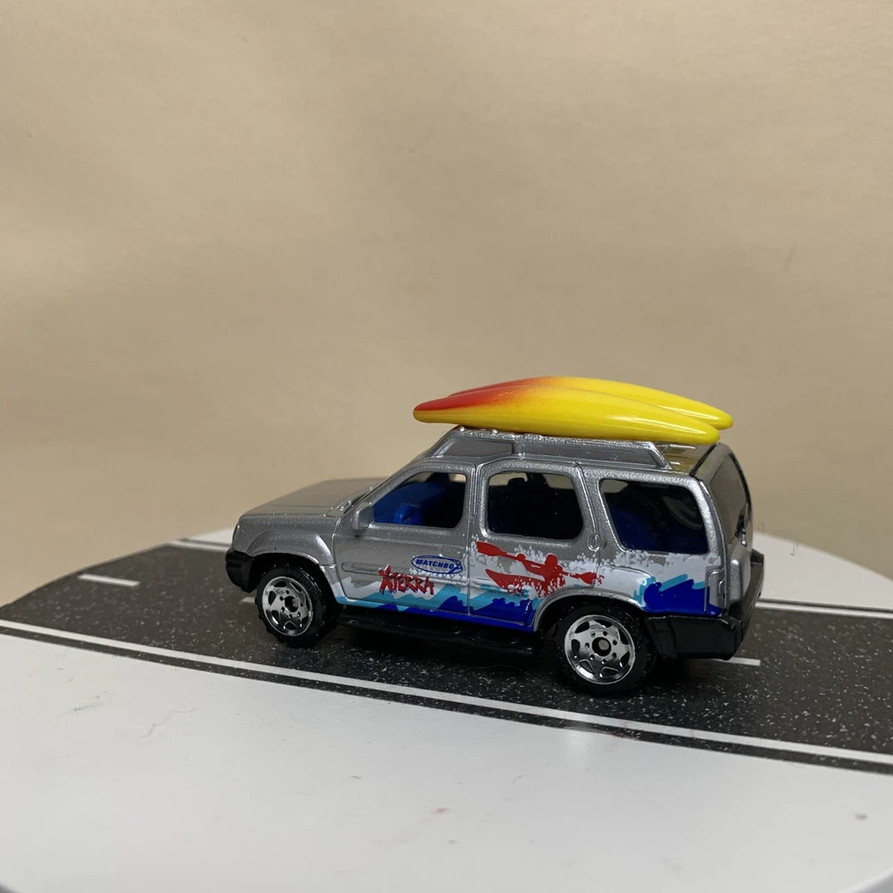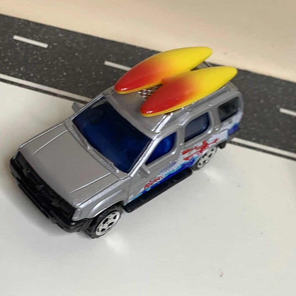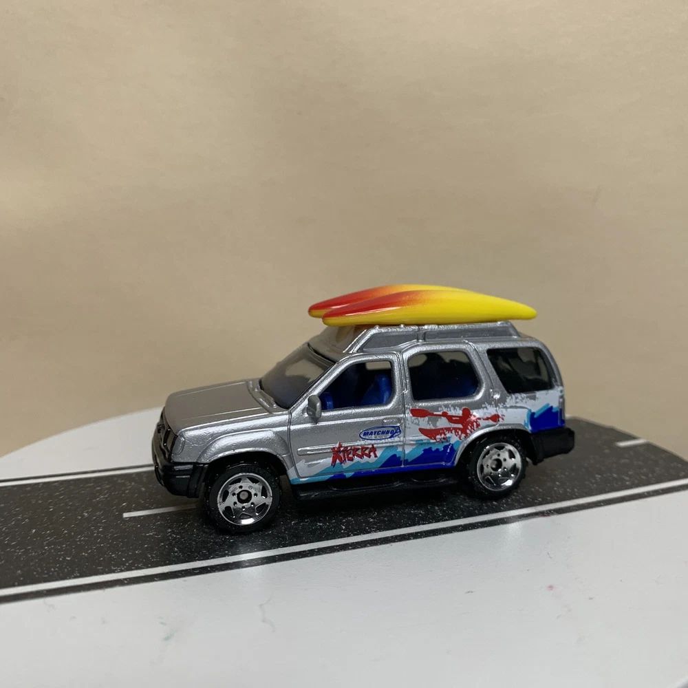 2001 Matchbox #32 Nissan Xterra SUV Silver w/Surfboards & Surfing Graphics NM