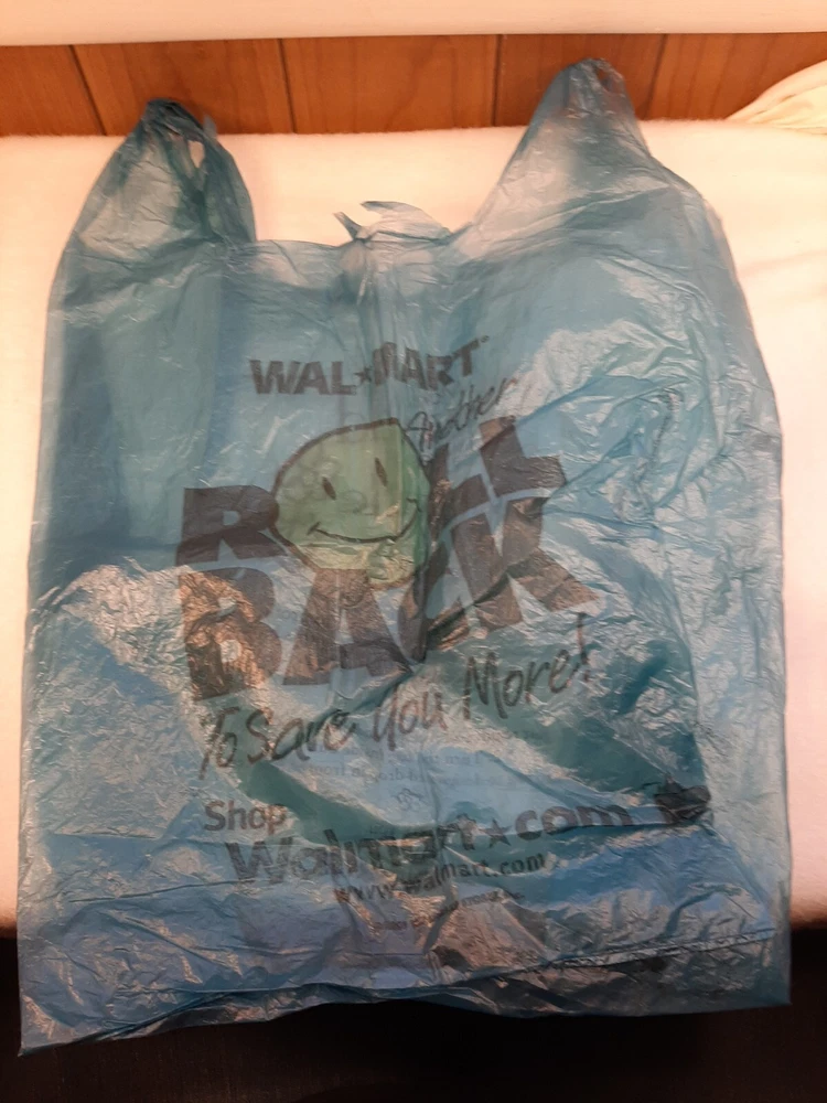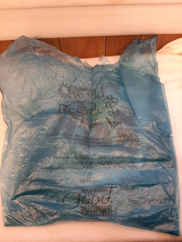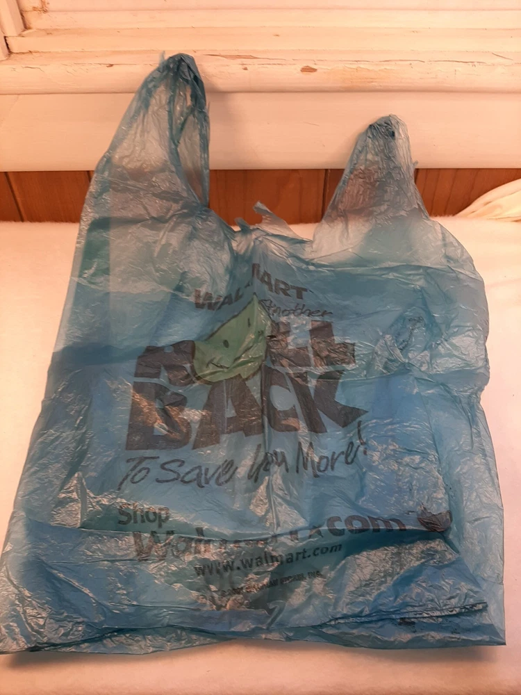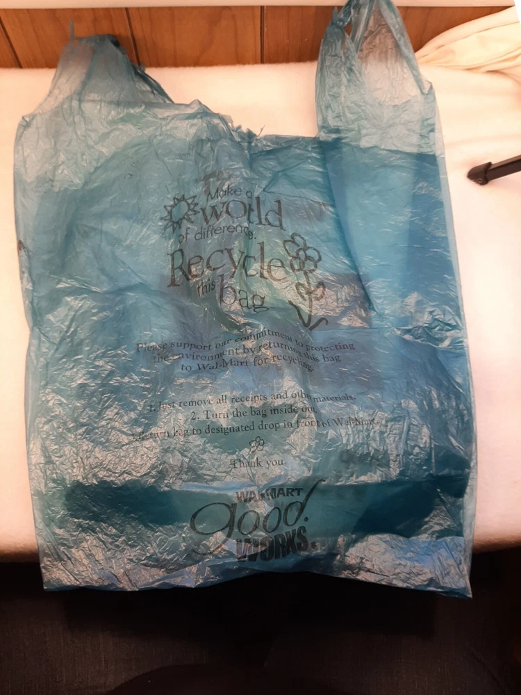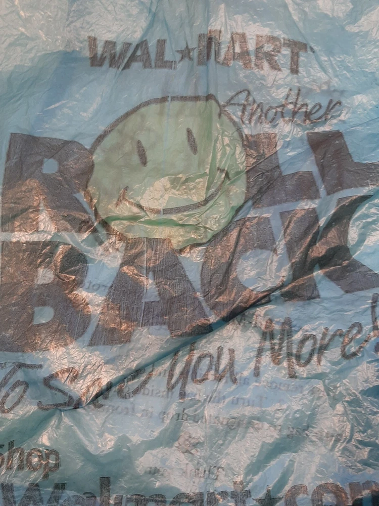 2001 Vintage Blue Plastic Walmart Shopping Bag Roll Back Smiley Face Movie Prop In good pre-owned condition may show signs of wear from use/handling/storage/display. Please view all pics for condition/details/flaws/issues. SOLD AS IS There are wrinkles to the bag from storage. There are marks/spots/dirt/debris please see photos 1-11, there is/maybe paint loss/sticker loss please see photos 1-11, there is lite discoloration please see photos 1-11, there are surface scratches to item please see photos 1-11, please see all photos for condition/issues/details.