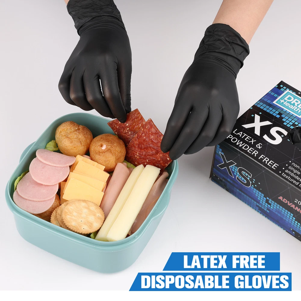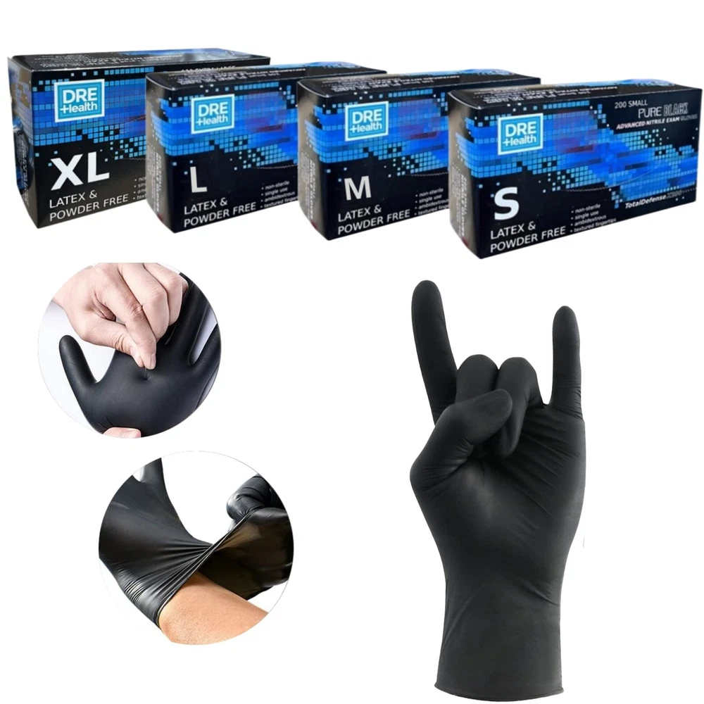 Product Description Product Description: Material: Nitrile Color: Black Features: High Quality: These black nitrile disposable gloves are 4 mils thick and offer good tear resistance, comfort, and durability. Comfortable and Healthy: Latex-free and powder-free. These gloves are an excellent choice for people sensitive or allergic to rubber and powders. Easy to Use: Unique production technology makes the inner side much smoother and easy to wear and take off. The elastic design provides superior comfort and dexterity for delicate tasks. Better protection for your hands. Multi-Purpose: These black disposable gloves look professional when cleaning dirt and grime. They are perfect for cleaning, hair coloring, tattooing, beauty salons, gardening, light housekeeping, food service, and janitorial. They can also be used for medical purposes, police investigations, lab work, etc. Multiple Sizes: These gloves are available in small, medium, large sizes, and extra large so that you can find the right glove for you. Package Includes: 1/2/3/4/5 Box of Black Nitrile Disposable Gloves (Each box contains 200 gloves) powered by You may also like