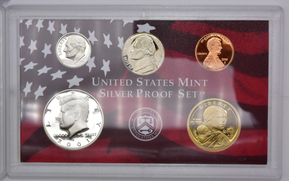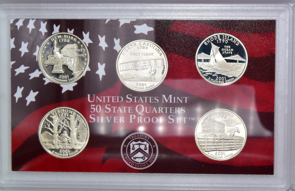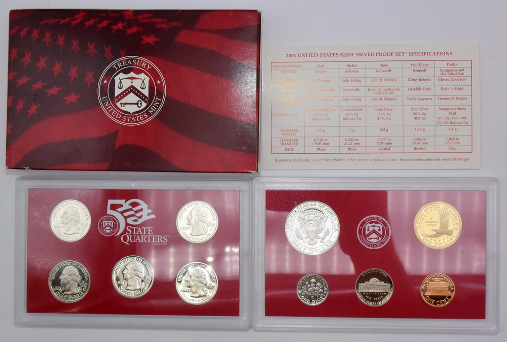 You are bidding on.... 2001-S US Mint 10-Coin Silver Proof Set w/Box & Certificate of Authenticity ** You will Receive the Proof Set shown in the Photos ** - Each of the Five Proof State Quarters are struck in 90% Silver. - Proof Dime and Half Dollar are struck in 90% Silver. - Remaining Proof Denominations (Penny, Nickel & Dollar) are struck in their Standard Alloy. Two Case Set Includes: 2001-S 90% Silver Proof New York State Quarter 2001-S 90% Silver Proof North Carolina State Quarter 2001-S 90% Silver Proof Rhode Island State Quarter 2001-S 90% Silver Proof Vermont State Quarter 2001-S 90% Silver Proof Kentucky State Quarter 2001-S Proof Lincoln Cent 2001-S Proof Jefferson Nickel 2001-S 90% Silver Proof Roosevelt Dime 2001-S 90% Silver Proof Kennedy Half Dollar 2001-S Proof Sacagawea Dollar Please review all photos and notes prior to bidding. **YES WE DO COMBINE ORDERS ** If you would like us to combine your orders please hold off paying until we have done so. We normally combine orders within a few hours of the sale and typically add 50¢ to $1 for each additional auction won. For example: If you won three auctions with postage at $5 per auction, we would reduce your postage from (3 x $5) $15 to $6 or $7 depending on the size and weight of your three items. We will combine orders for up to five days from the date of your first auction won and then issue a final invoice for payment. On rare occasions because of the weight and size of the items won it could actually cost more to combine so in this case we would ship the items separately with no postal saving passed on however in most cases, we will note this in the auction prior stating that it cannot be combined. *** THANK YOU AND GOOD LUCK BIDDING *** If you have ANY questions about our auctions please email and we will reply as soon as possible but please note we are on the West Coast and it could take a few hours to respond. We only ship to the Continental United States so when shipping into Hawaii, Puerto Rico and Alaska, additional shipping fees could possibly be applied.