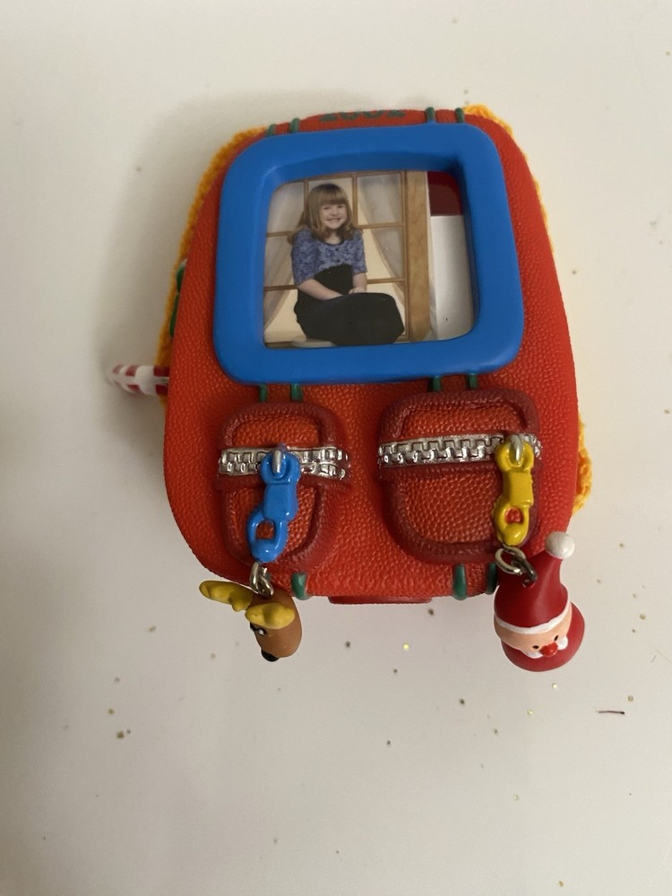 The 2002 Back to School Photo Holder Hallmark Keepsake Christmas Ornament is a small, irregularly shaped ornament featuring a contemporary style with a vintage touch. Handcrafted with a decorative multicolor design, this limited edition ornament includes a photo holder for a personal touch. Perfect for the Christmas season, this ornament features a school backpack subject, making it a sentimental keepsake for families with children aged 12-18 years. The ornament comes in its original open box packaging and weighs 2.1 oz, adding a unique and nostalgic addition to any holiday decor collection. Preowned in good condition. Box included