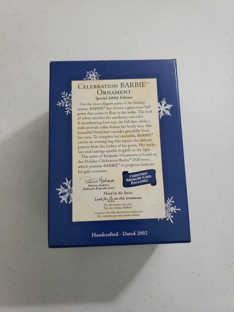 The Hallmark Keepsake Ornament Celebration Barbie Special 2002 Edition is part of the Barbie franchise and is the 3rd in a series of ornaments. This ornament features Barbie in a celebrity-themed design, perfect for collectors or fans of Barbie. Manufactured in 2002, this ornament is a special edition that would make a lovely addition to any holiday decor or Barbie collection.