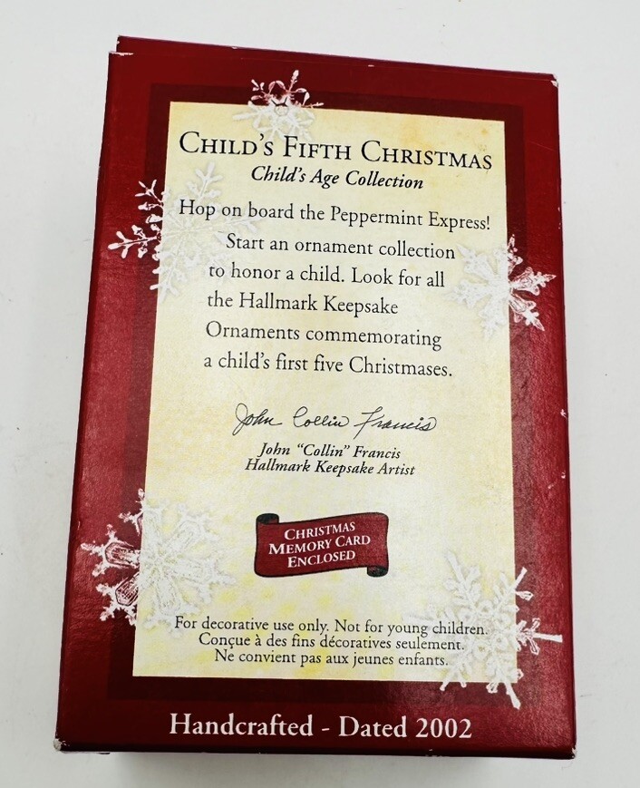 Celebrate a child's fifth Christmas with the 2002 Hallmark Keepsake Child’s Fifth Christmas Ornament. This charming bear-shaped decoration is a wonderful addition to any holiday decor, bringing a touch of nostalgia and joy to your festive celebrations. Crafted from durable plastic, this ornament is designed to last for many holiday seasons to come. The ornament features intricate details that capture the spirit of Christmas, making it a great gift or a treasured keepsake for your own collection. Whether it's part of a growing ornament collection or standing alone on your tree, this Hallmark piece is sure to become a beloved part of your holiday traditions.