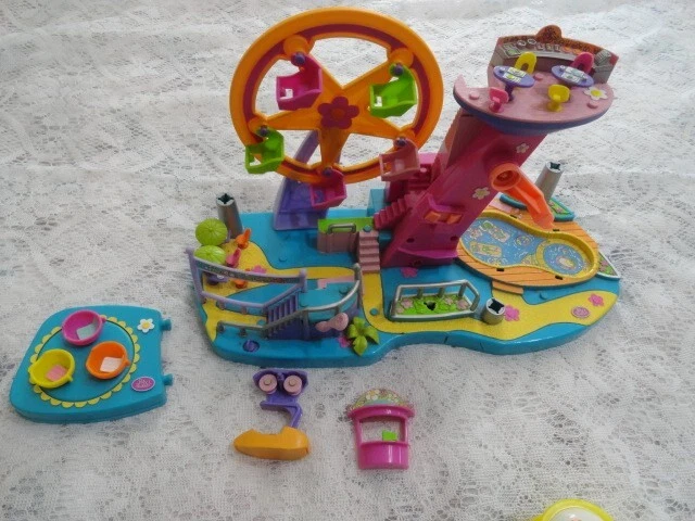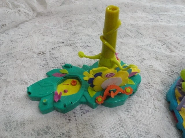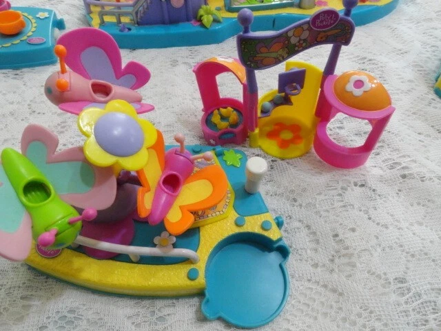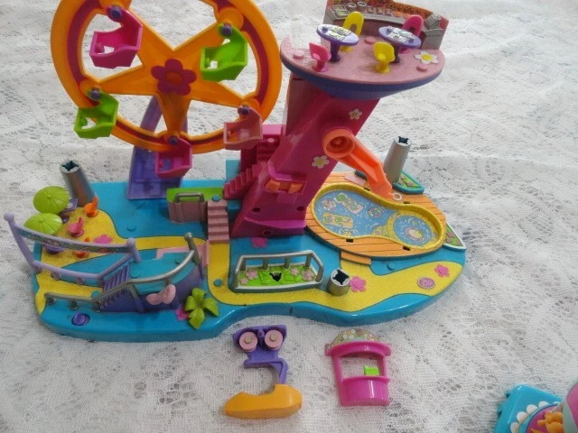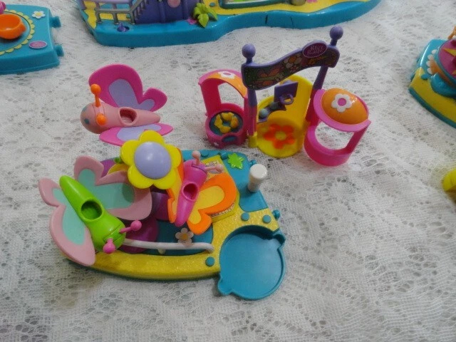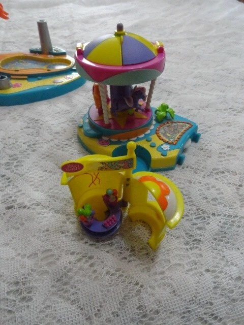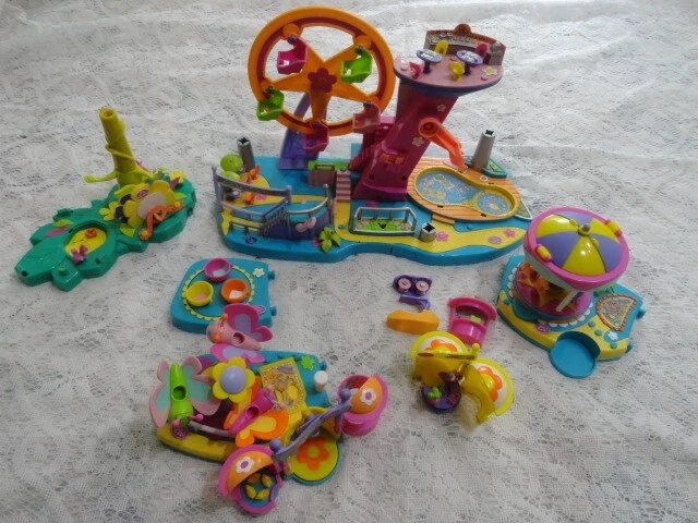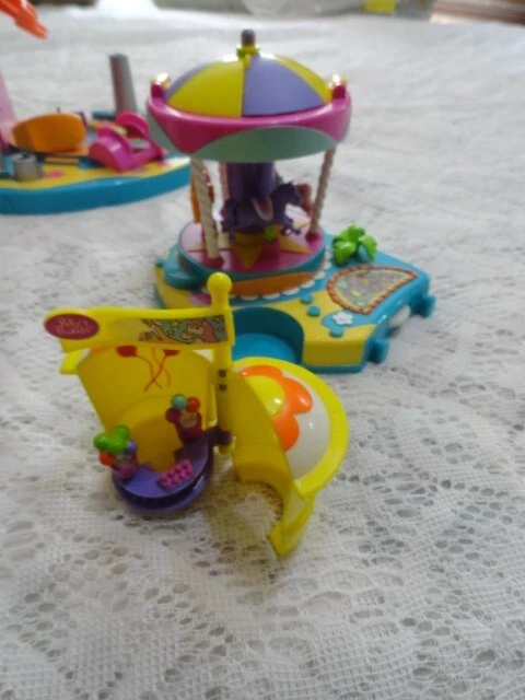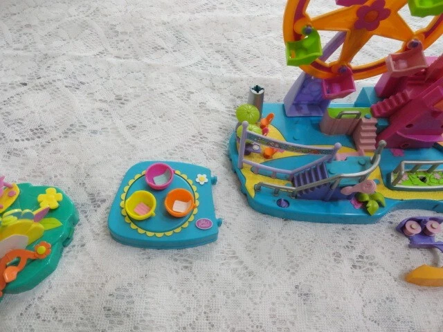 2002 Polly Pocket Playsets- Amusement Park, Carousel, Butterfly Ride, Flower Fairies Flying School Motorized rides on amusement park playset for ferris wheel and tea cup ride- uses 2 "C" batteries, working, clean battery compartment. Missing loop for aerial ride. Flower Fairies Flying School missing pieces.